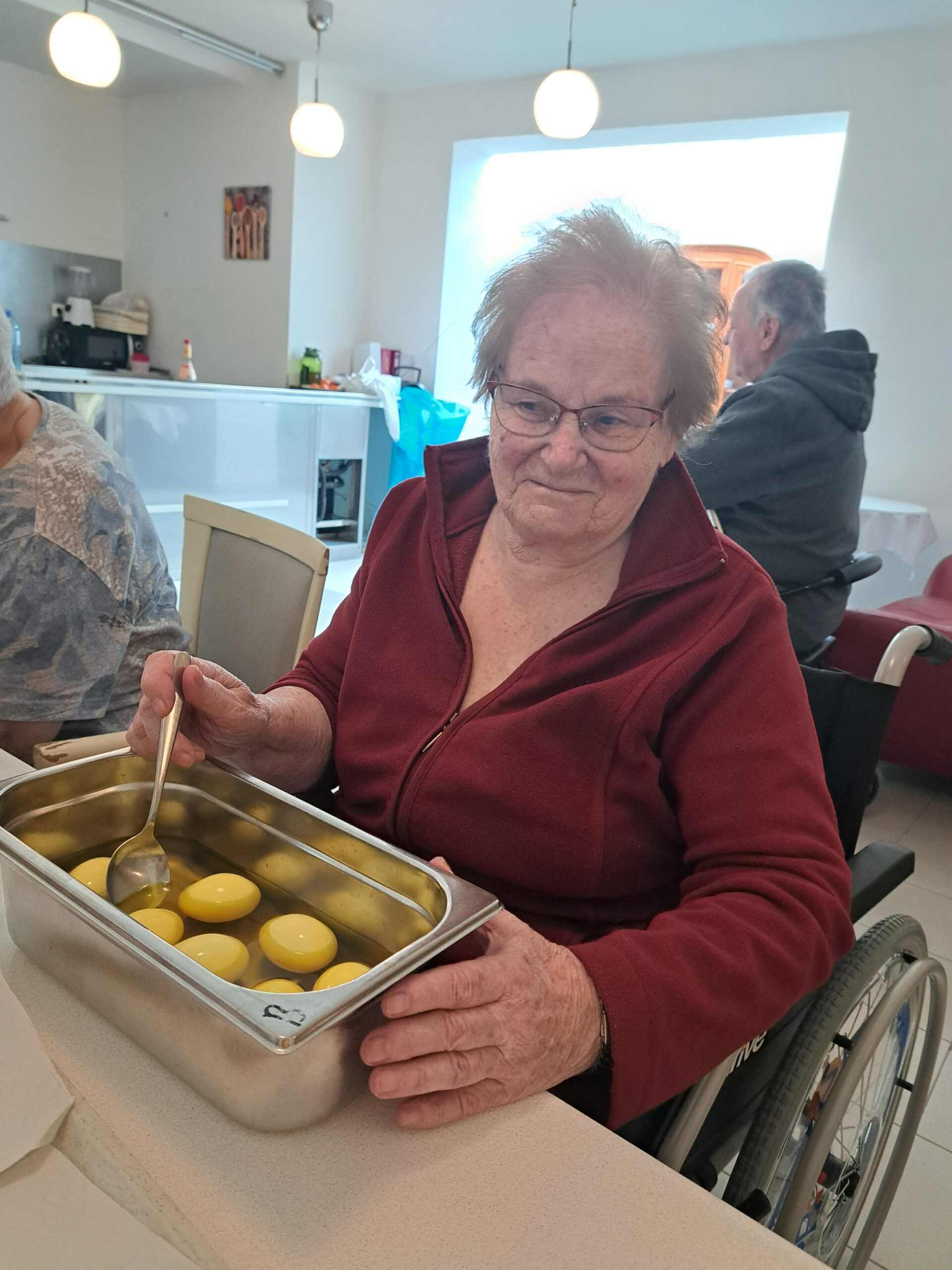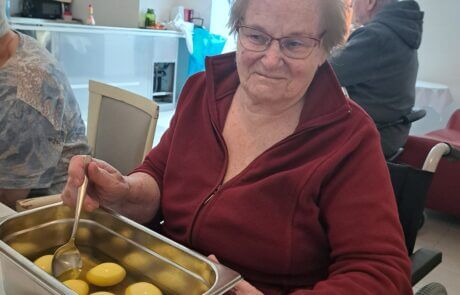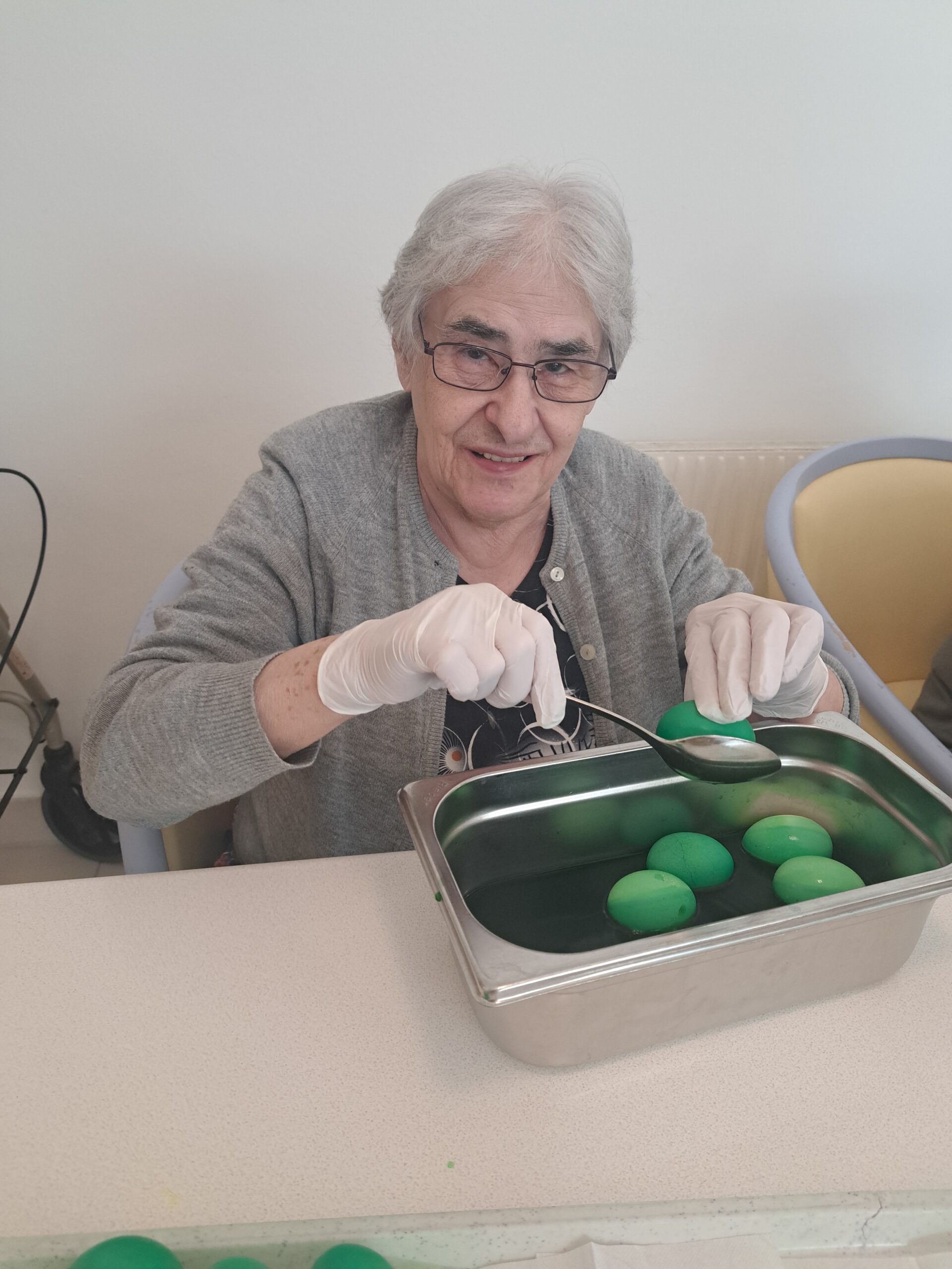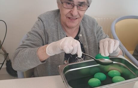 Die Bewohnerin hat Spaß beim Eierfärben.