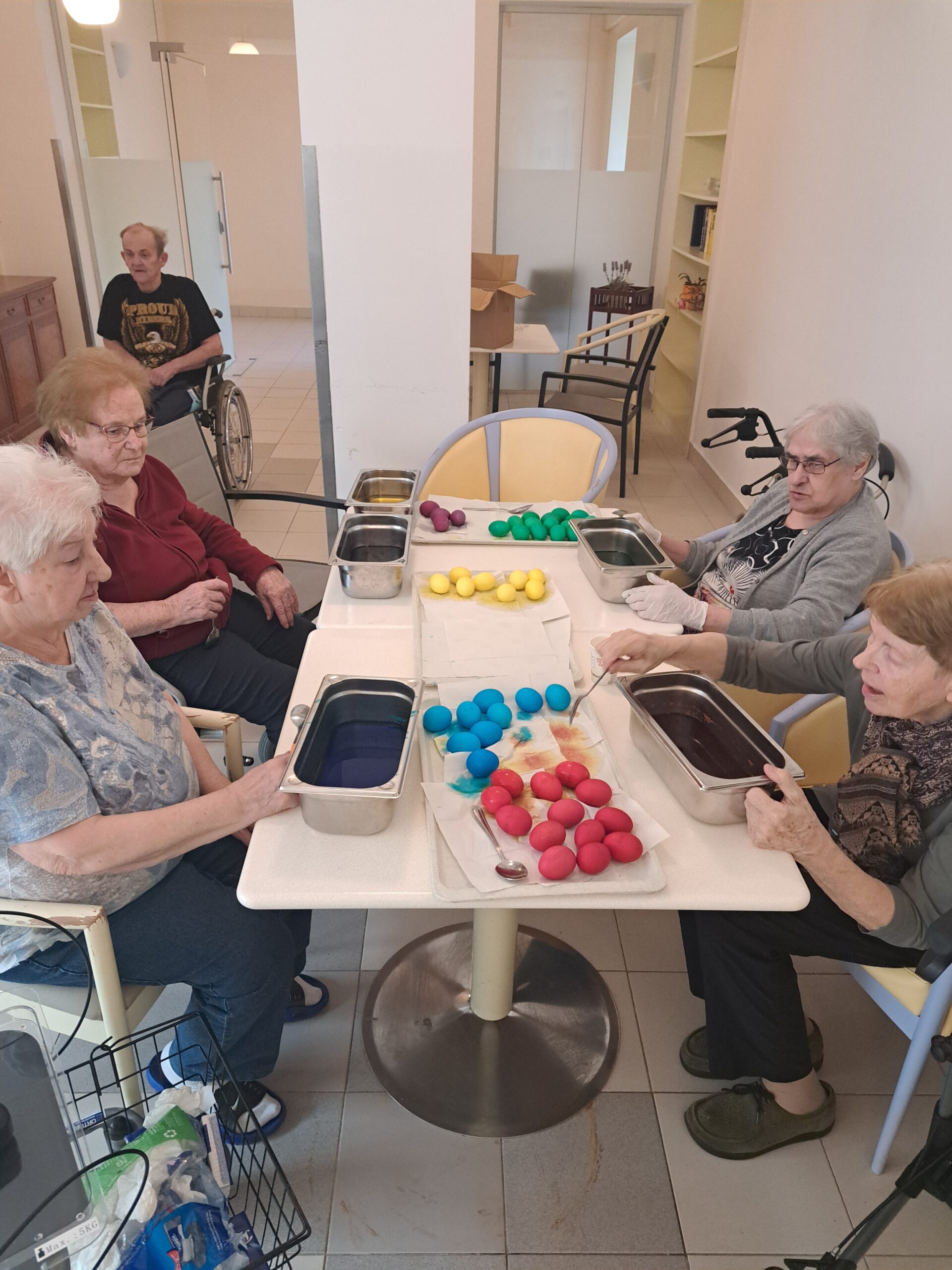Die Bewohner:innen genießen das gemeinsame Färben der Ostereier.