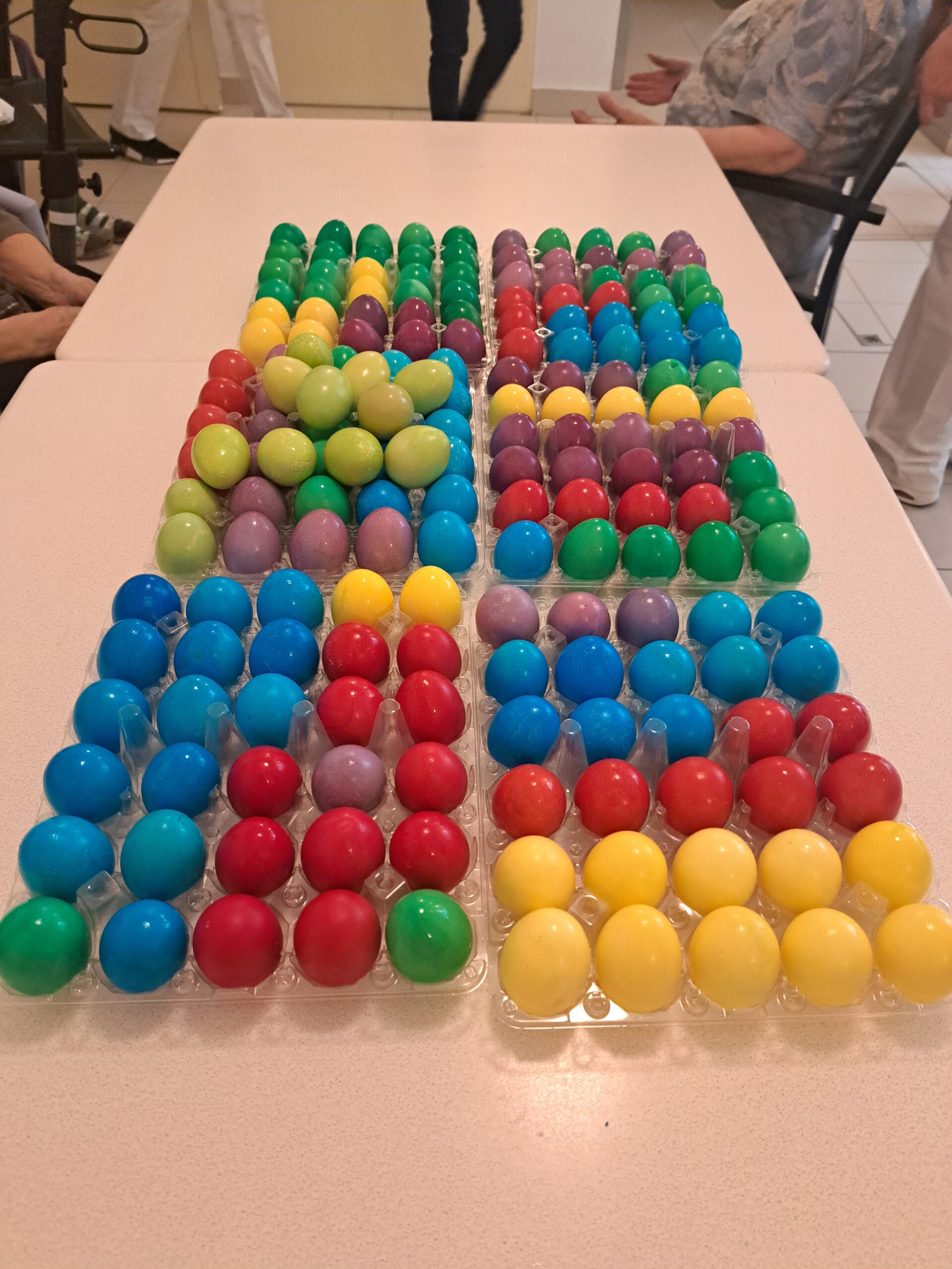 Die Bewohner:innen präsentieren stolz die gefärbten Eier.