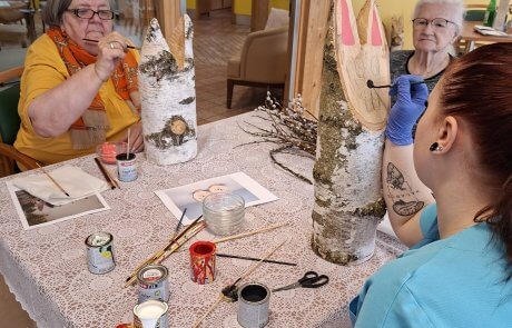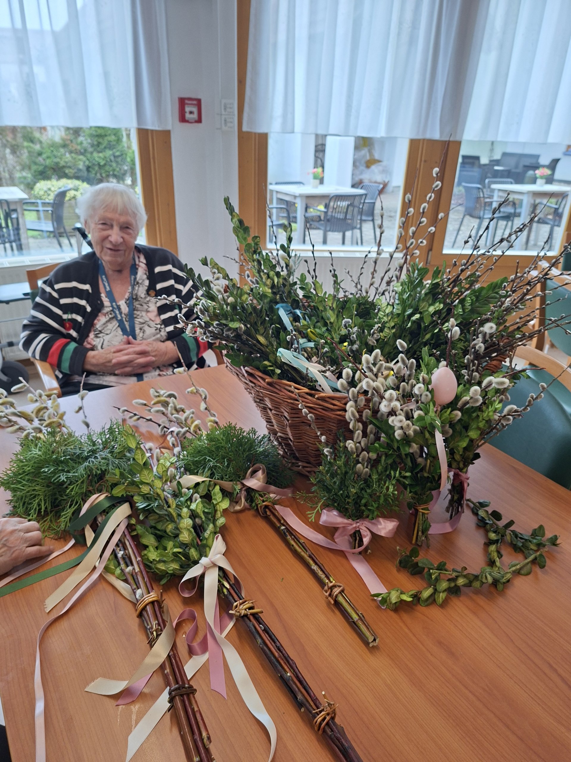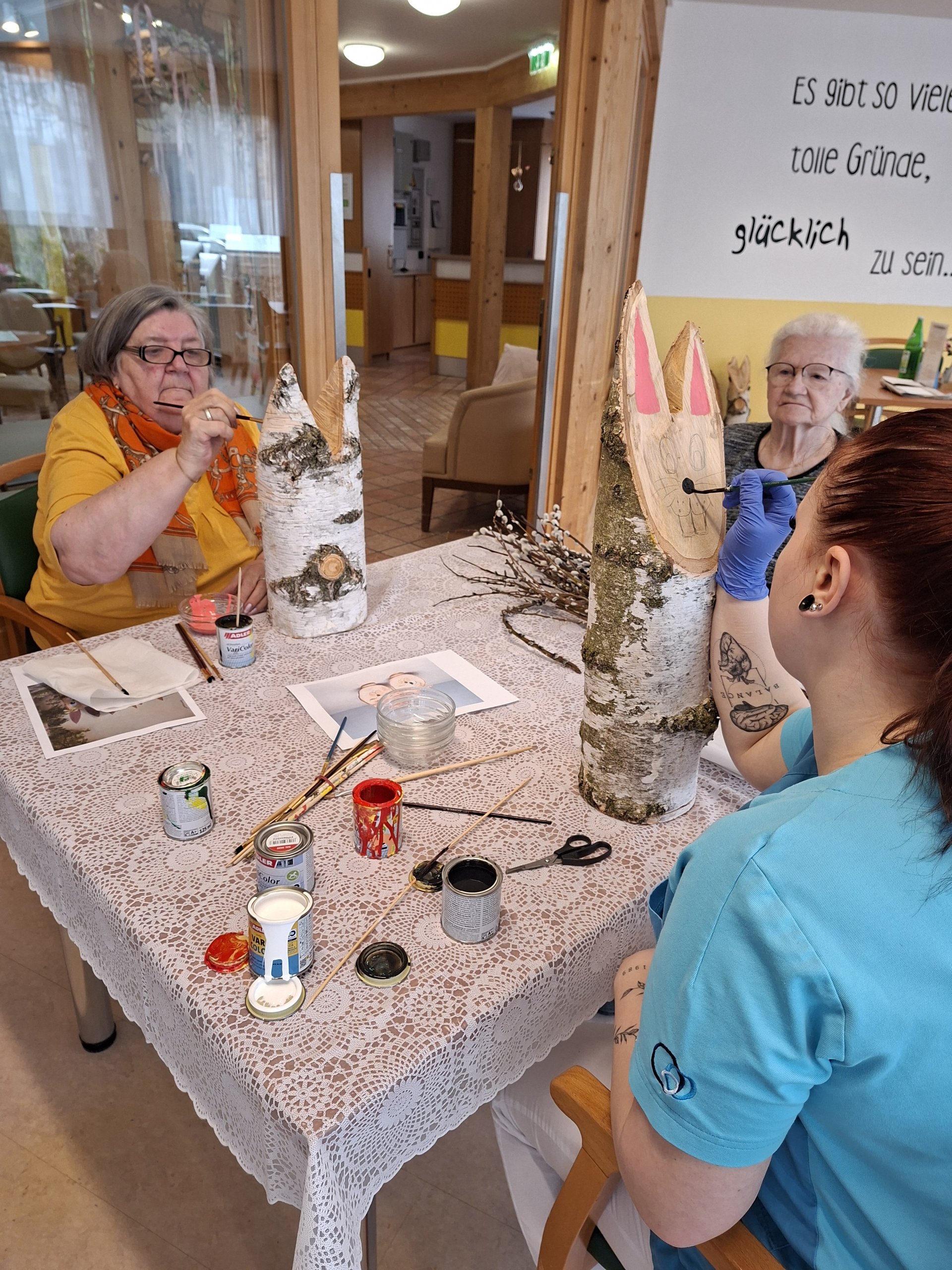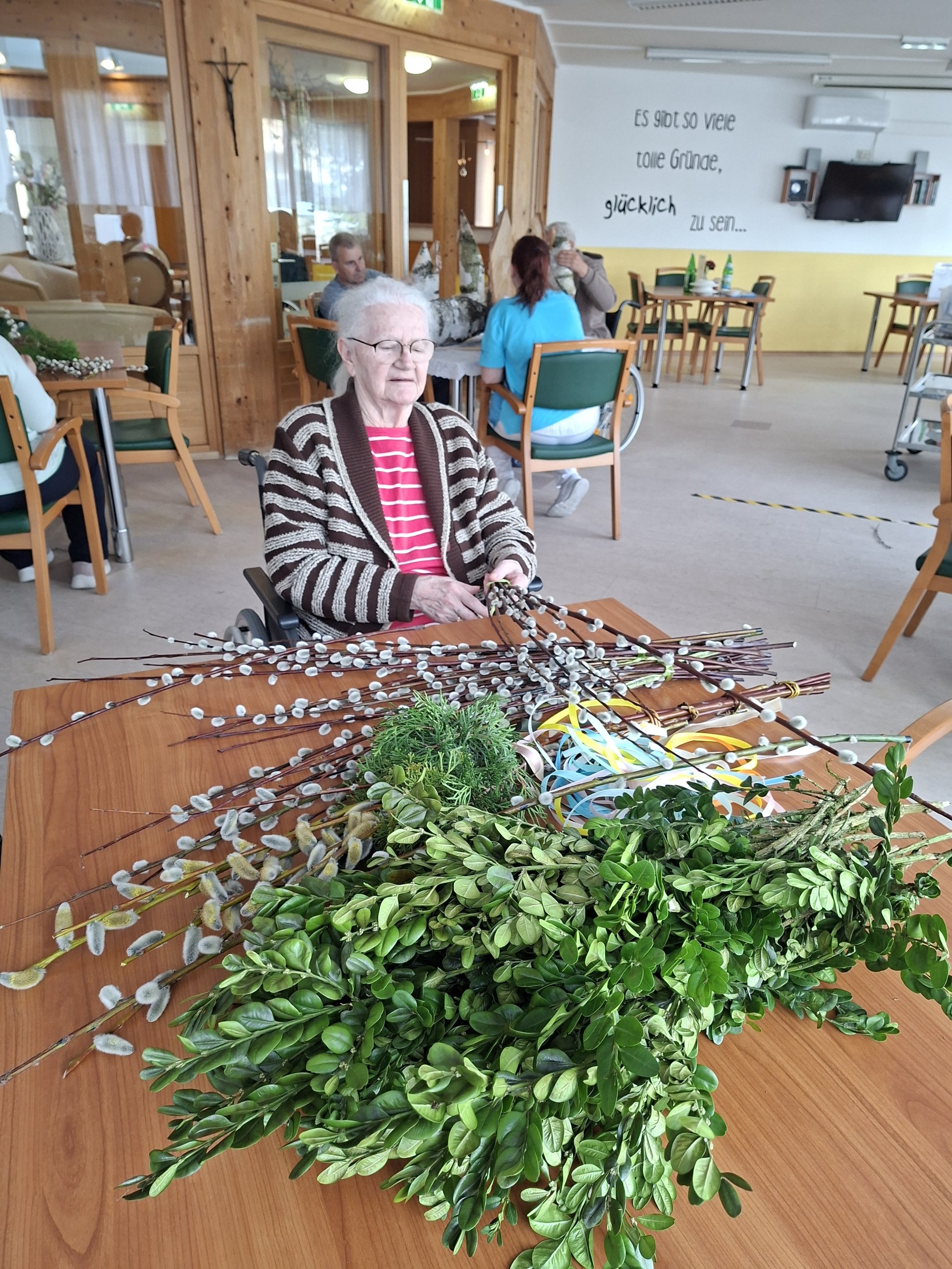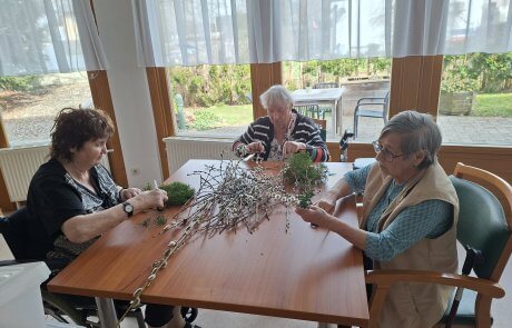 Gemeinsam mit den Bewohnerinnen und Bewohnern wurden im Vorfeld im SeneCura Sozialzentrum Feldbach Palmbuschen gebunden. In gemeinsamer Runde entstand dabei eine ruhige und besinnliche Atmosphäre, die das Miteinander stärkte und auf das Osterfest einstimmte. Auch für die österliche Dekoration wurde mit viel Engagement gearbeitet. Die Bewohnerinnen und Bewohner gestalteten Holzosterhasen, die sorgfältig abgeschliffen und anschließend liebevoll bemalt wurden. Die fertigen Dekorationen sorgen nun für eine freundliche und einladende Stimmung im Eingangsbereich des Hauses. Der Tag war geprägt von gemeinsamer Vorbereitung, Kreativität und einer angenehmen Vorfreude auf das bevorstehende Osterfest.