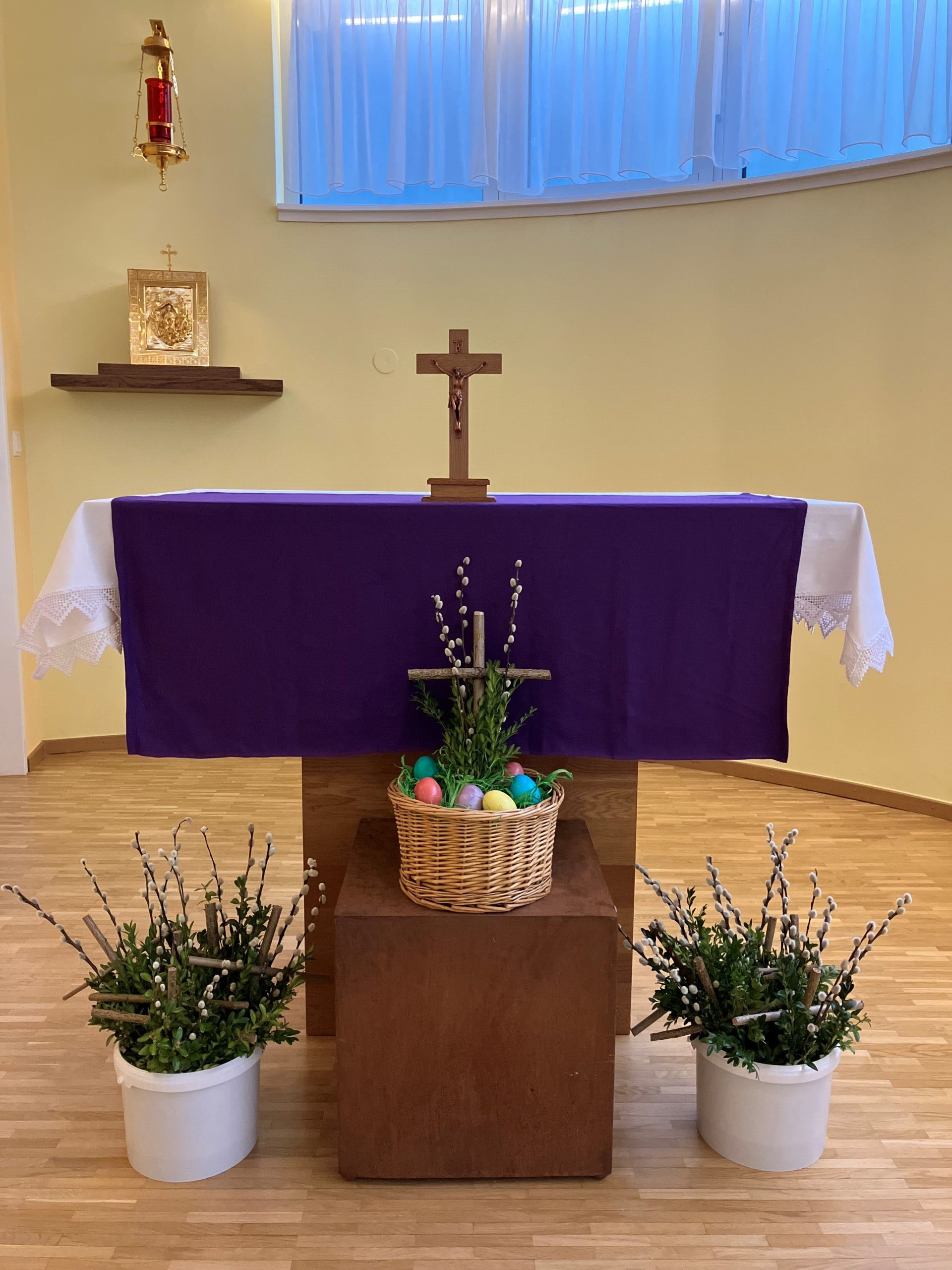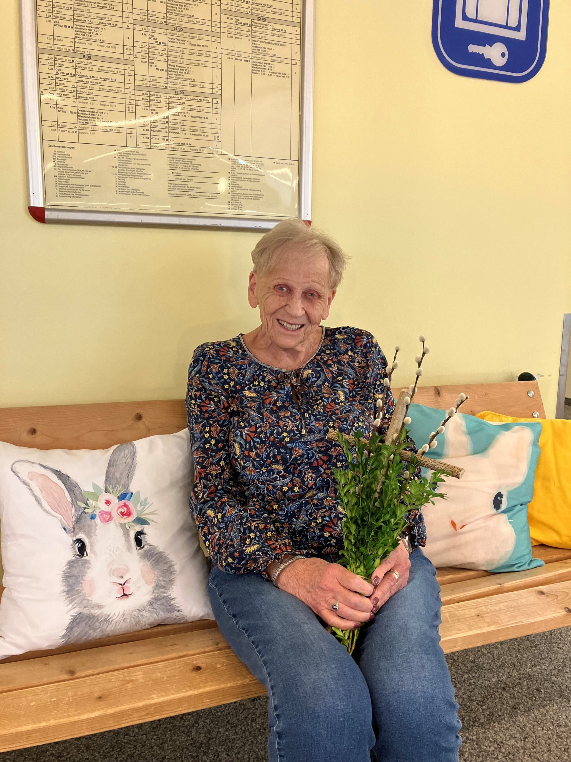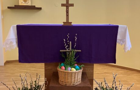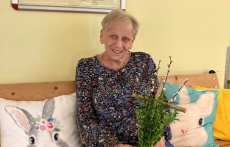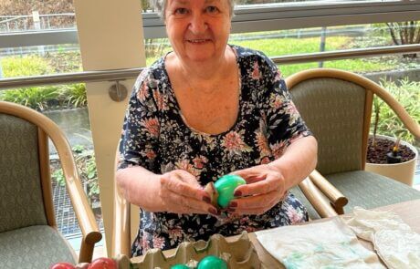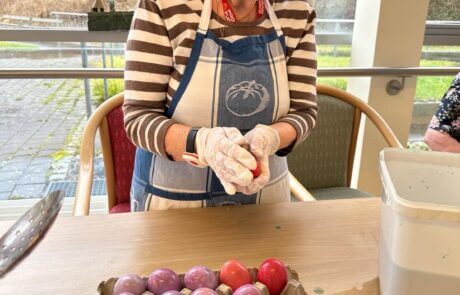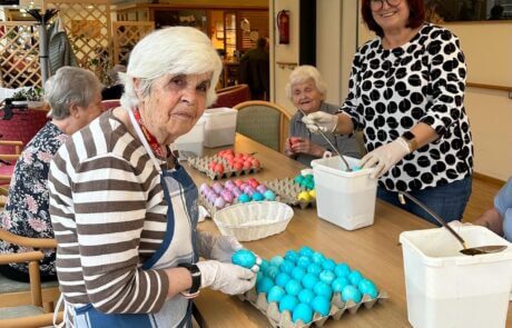 Im Laurentius-Park sind die Ostervorbereitungen in vollem Gange. Traditionelles Eierfärben mit unserer ehrenamtlich tätigen Mitarbeiterin Elfi Brändle, welche auch im wohlverdienten Ruhestand immer wieder Brauchtum aufleben lässt und so wertvolle Erinnerungsarbeit arbeitet leistet! „Ich habe die Ostereier früher auch immer mit Speck eingerieben, damit sie glänzen!“, erzählen gleich mehrere Bewohnerinnen. Nebenbei werden Palmbüsche gebunden und es wird über diese eher ostösterreichische Tradition gefachsimpelt. Die geschaffenen „Kunstwerke“ wurden bei der heiligen Messe letzten Freitag geweiht und tragen den Ostersegen ins Haus.