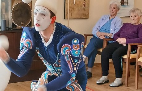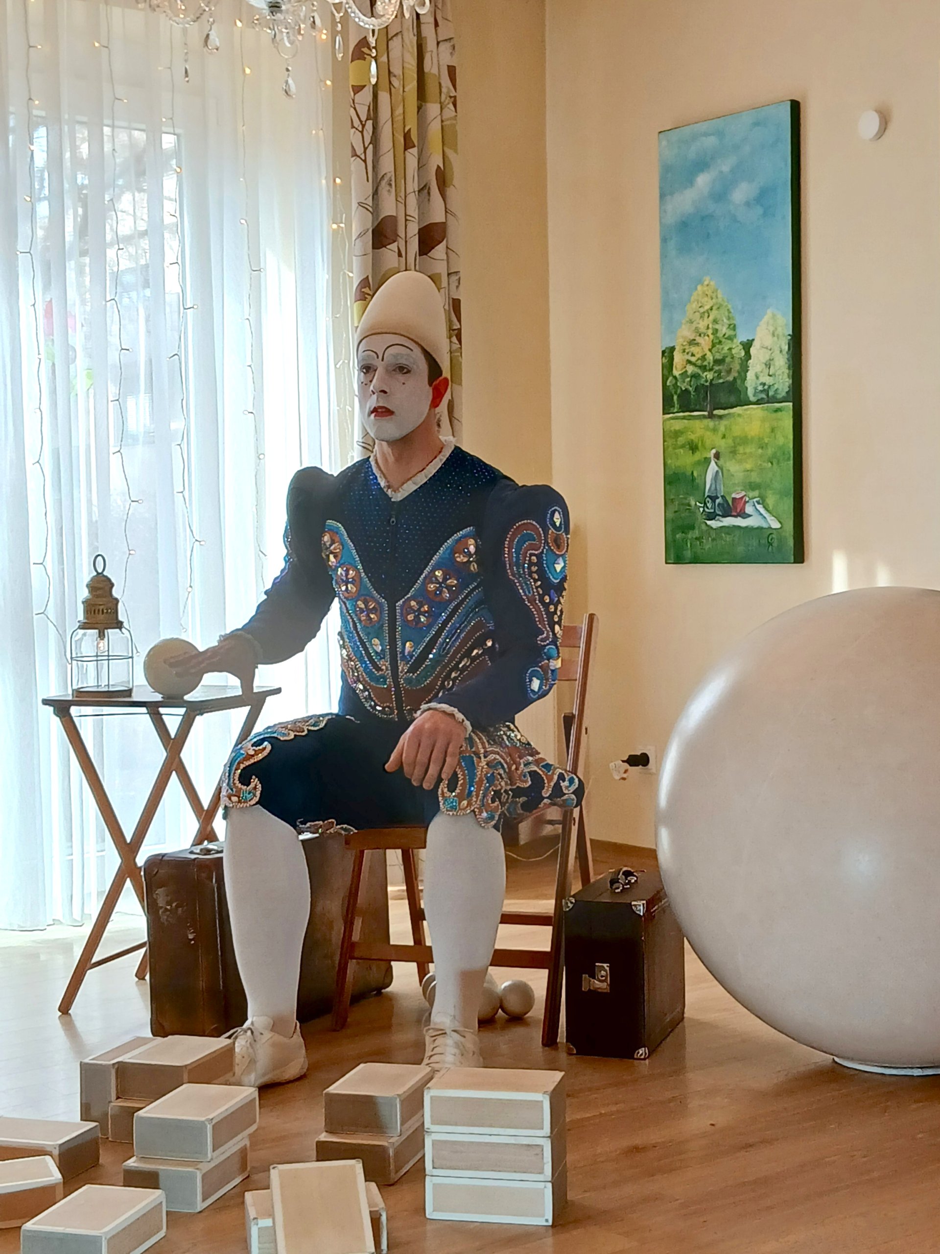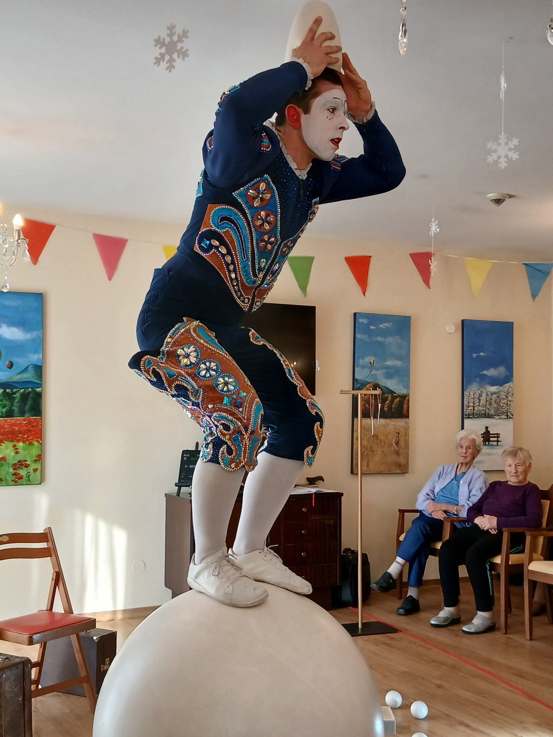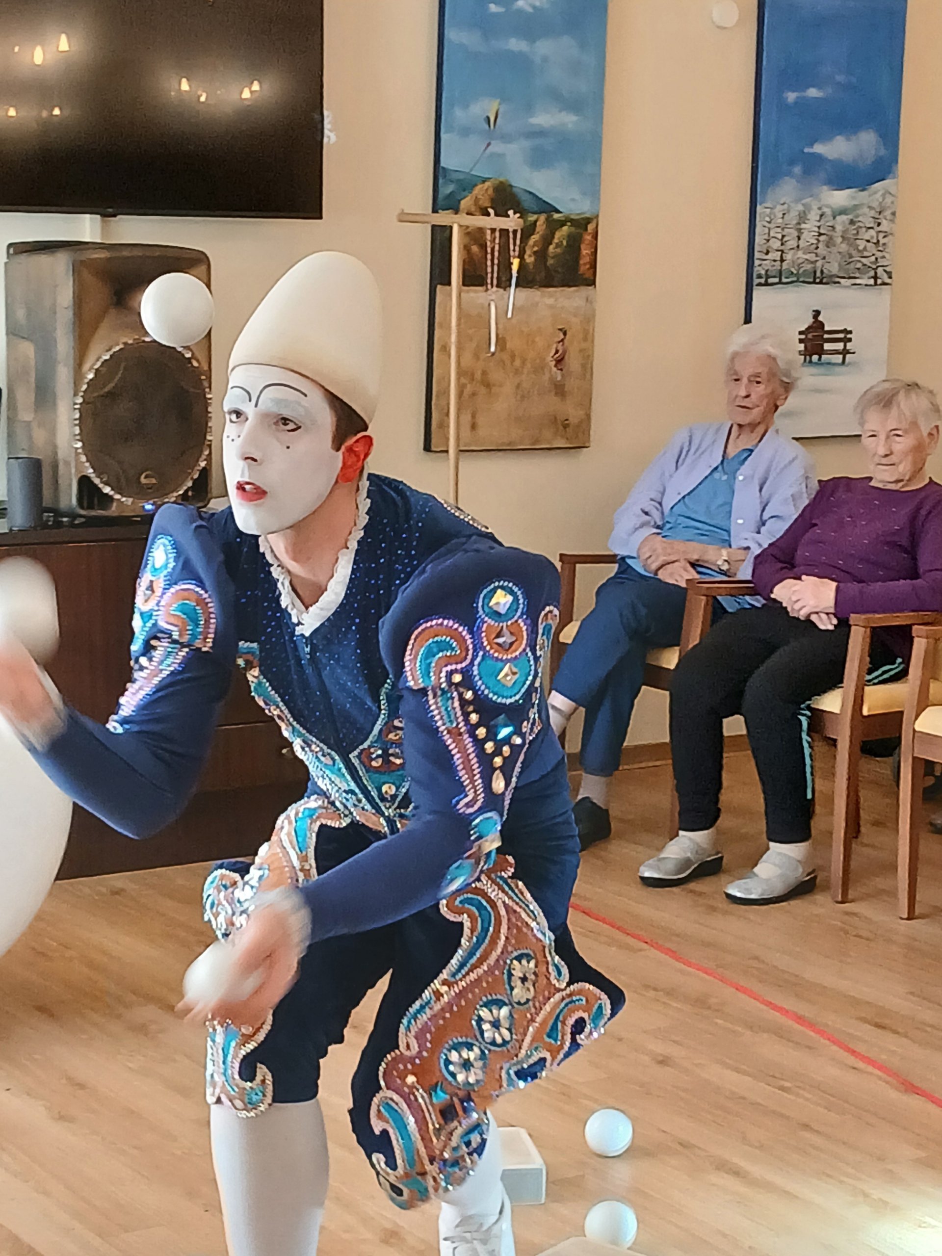 Am 10.02. besuchte Ralph Öllinger mit seiner Performancevorstellung „Pierre Roman und der Wal am Strand“ das SeneCura Sozialzentrum Unterpremstätten. Es handelt sich bei dieser Performance um eine poetische Zirkusvorstellung, die die Bewohner:innen auf eine Reise durch das Leben eines Weißclowns mitnimmt. Hier wird eine bekannte Zirkusfigur mit Leben erfüllt, welche bei den Bewohner:innen einen hohen Wiedererkennungswert besitzt. „Der Weißclown sorgt für Erinnerungen an die Vergangenheit, einen Moment der Entspannung und schlägt eine Brücke ins Hier und Jetzt.“