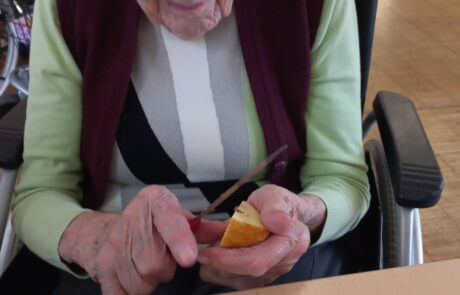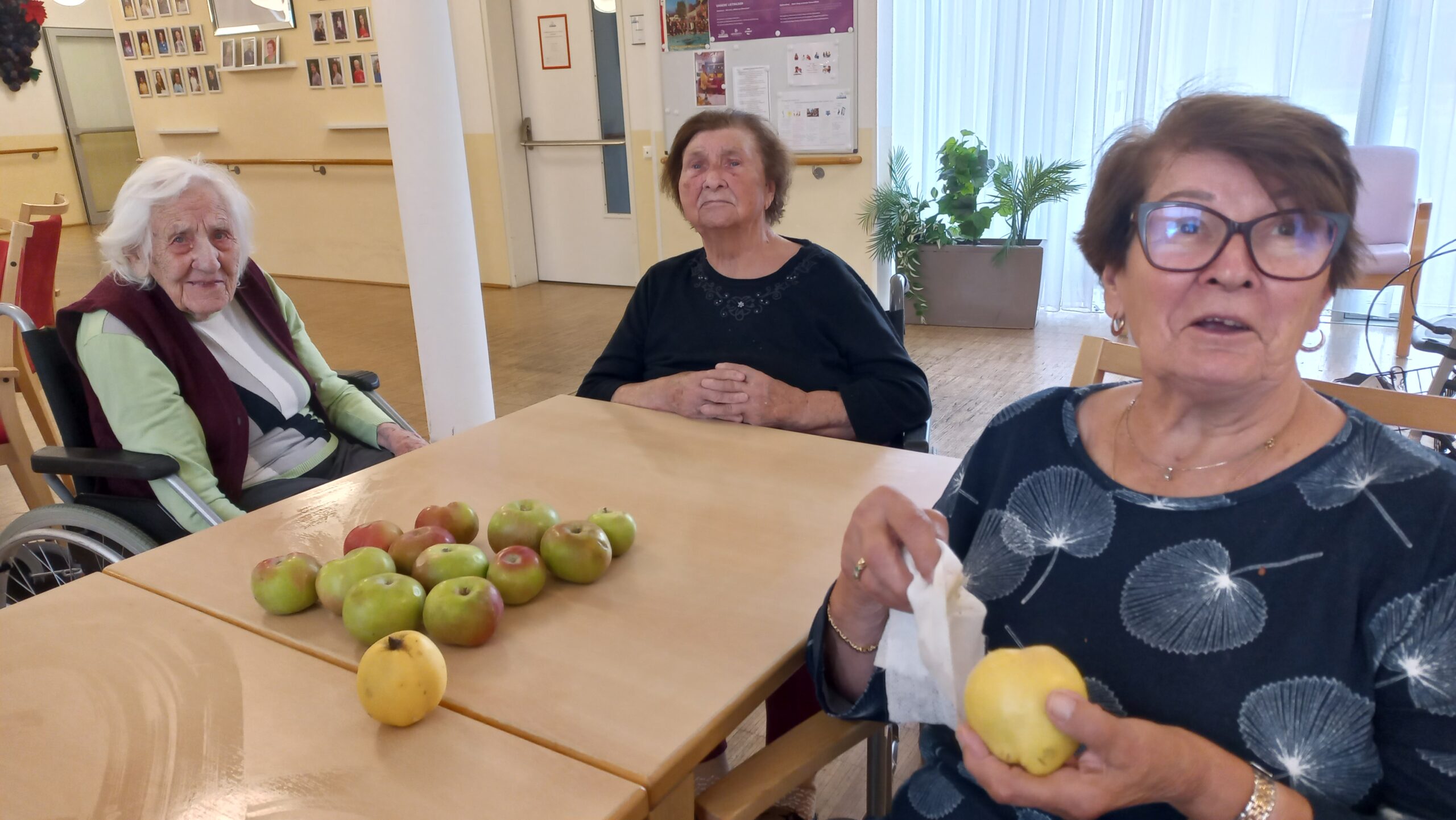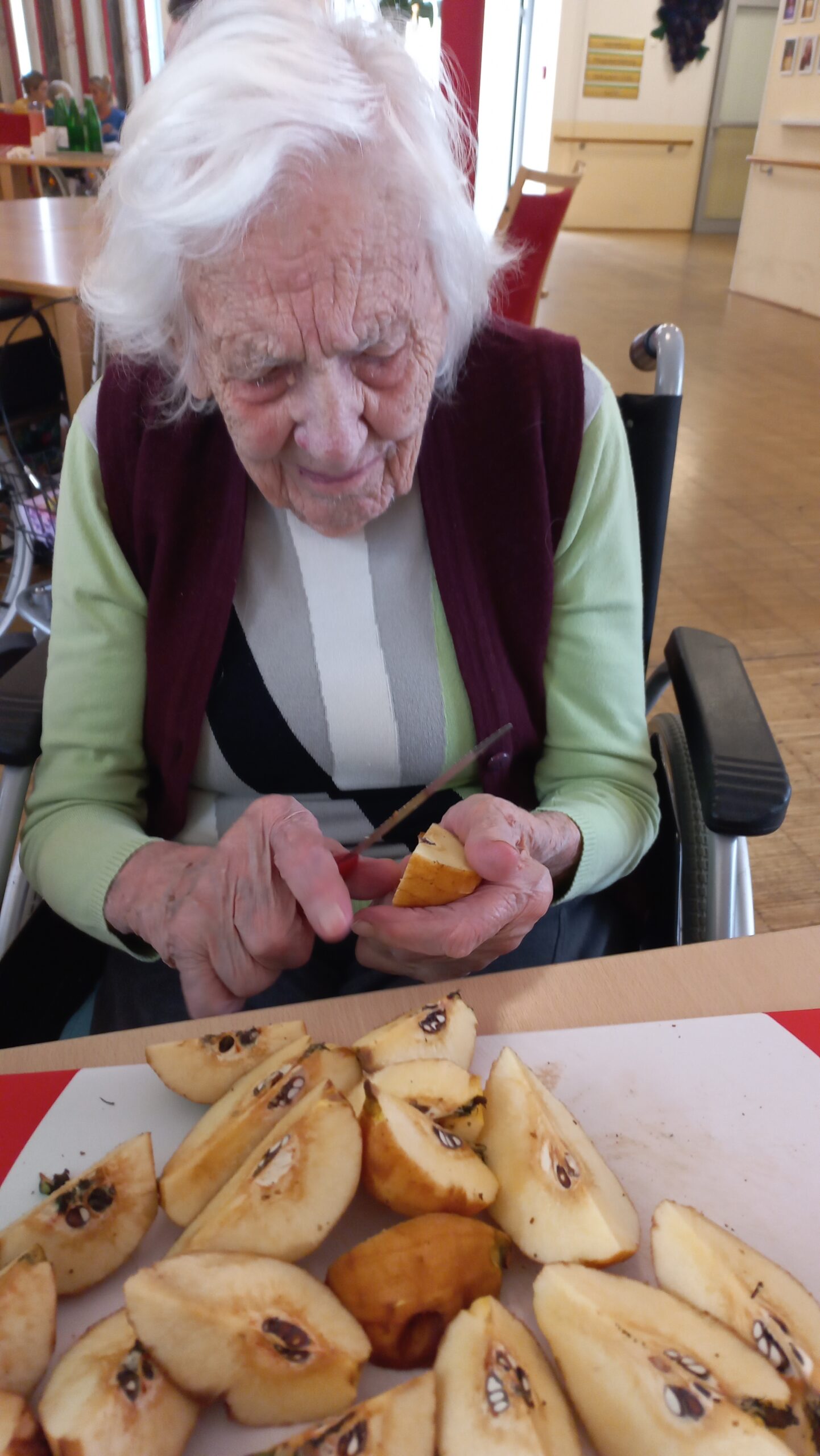 Eine tolle Sachspende von Possert Maria animierte die Bewohner:innen des SeneCura Sozialzentrums Stainz aus den gespendeten Quitten eine köstliche Marmelade zu kochen. So ging es schnellstmöglich ans Waschen, Pelz befreien, Schälen und Vierteln – eine anstrengende Beschäftigung, bei der die Seniorinnen und Senioren viel Spaß hatten. Frau Klinger meinte gleich, dass sie jedes Mal zum Handkuss kommt, wenn es ums Schälen geht. Da Quitten schnell braun werden, wurden sie schnell verkocht. Die finale Marmelade wurde dann mit ein paar Äpfel verfeinert und anschließend in Gläser gefüllt. Nach dem Abkühlen wurden Etiketten ausgeschnitten, die die Gläser zieren sollen. Mit einem Filzstoff und einem Band wurden die Marmeladegläser verschönert – denn das Auge isst ja bekanntlich mit. Die Quitte bringt außerdem unzählige gesundheitliche Vorteile mit sich. Sie schützt die Körperzellen, enthält Vitamin C, wirkt antibakteriell, vertreibt Verdauungsprobleme, bietet relativ viel Kupfer, beruhigt den Bauch und lindert Halsschmerzen. Das dürfen die Bewohner:innen des Hauses nun persönlich beim baldigen Verzehr der eigenen Quittenmarmelade feststellen. Die ein oder andere Person hat sich vom Geschmack bereits überzeugen lassen und die restlichen Bewohner:innen können es kaum erwarten die Marmelade bald zu verkosten!
