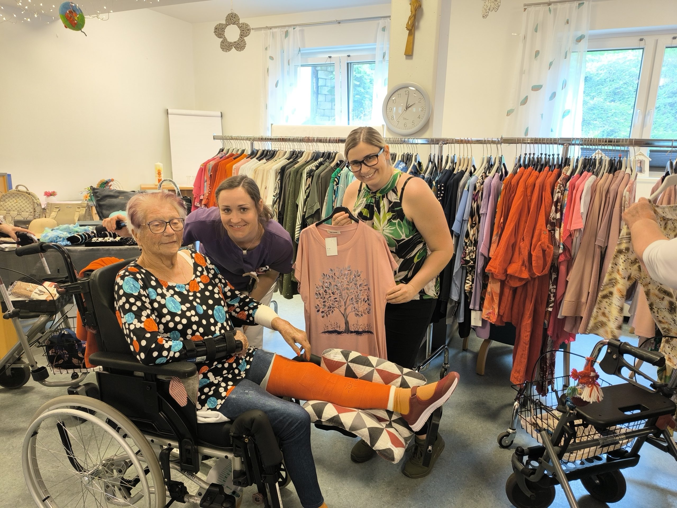 Einmal im Frühjahr und einmal im Herbst haben die Bewohner:innen des SeneCura Sozialzentrums Kammern die Möglichkeit, RM-Mode aus Italien bei Stefanie Wurzenberger ganz gemütlich im Sozialzentrum einzukaufen. Der Multifunktionsraum wurde in eine Boutique umgebaut, um das Einkaufserlebnis so echt wie möglich zu gestalten. Der Andrang war groß und es wurde geschmökert, probiert und eingekauft. Schon Tage davor zeigte sich Vorfreude, vor allem bei den Damen!