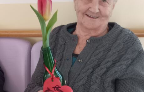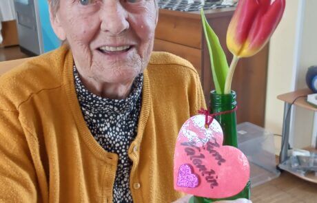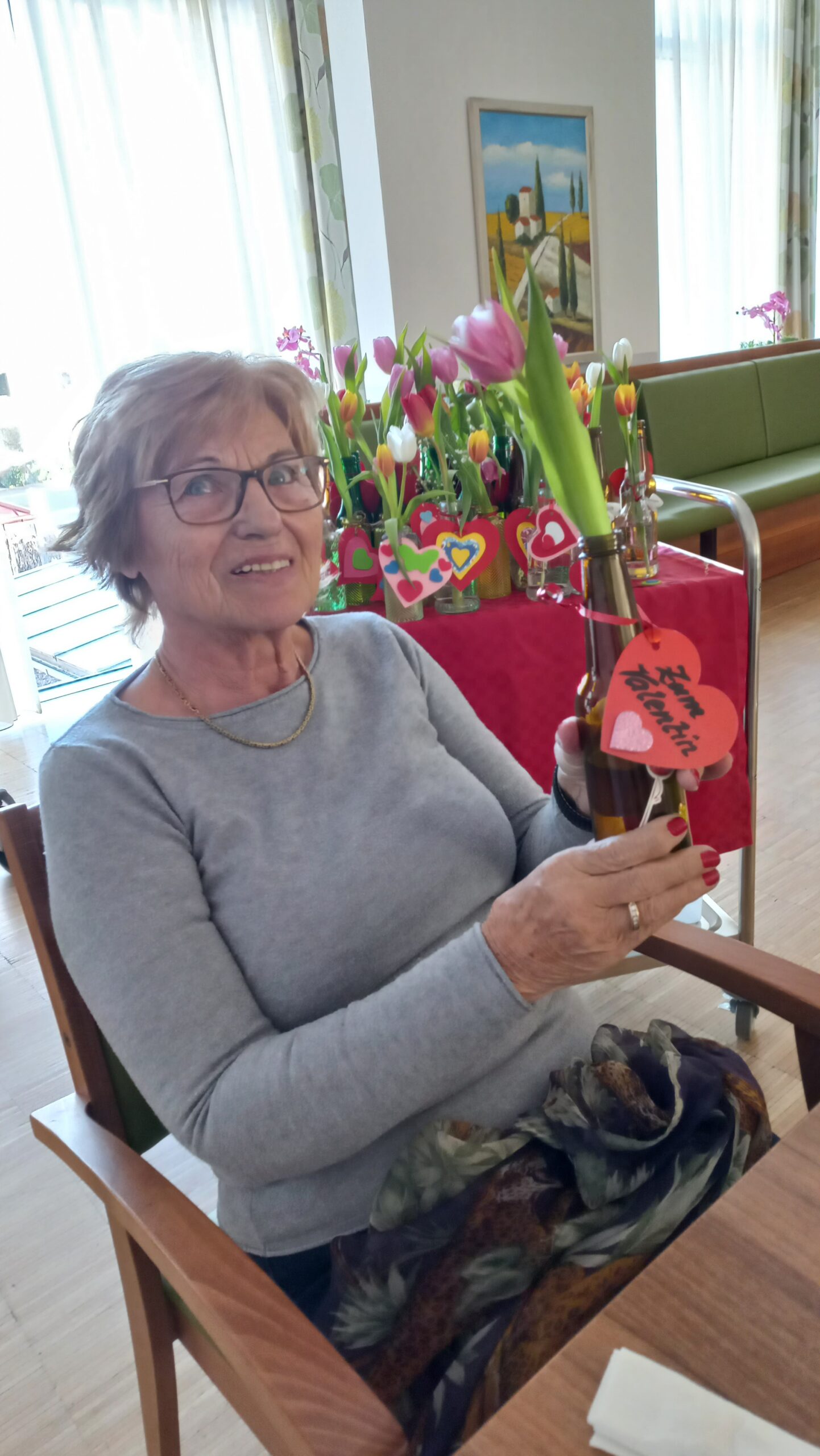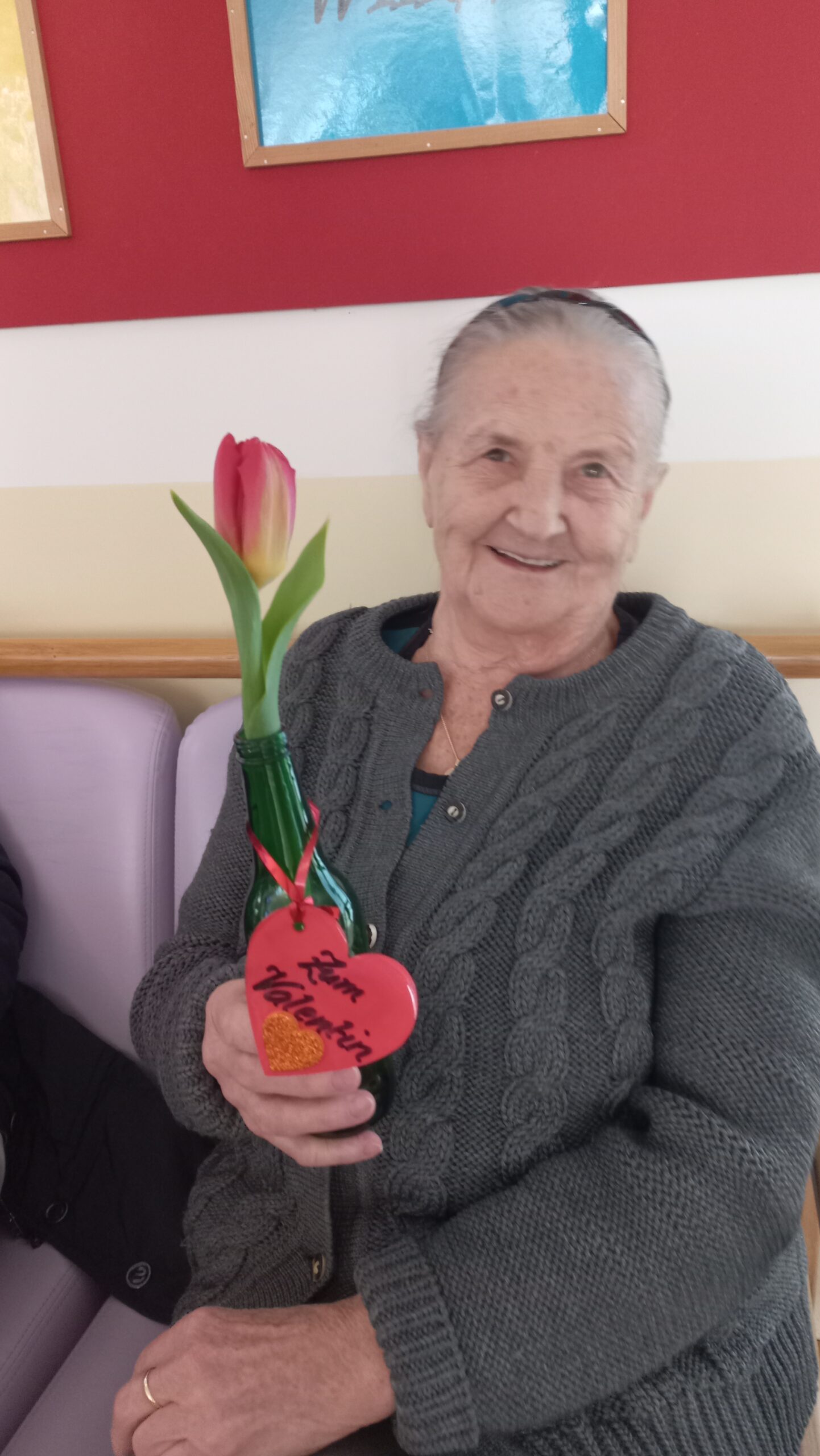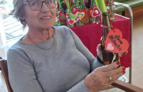 Bewohnerin Gerlinde Murtinger präsentiert stolz das Valentinstagsgeschenk.