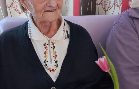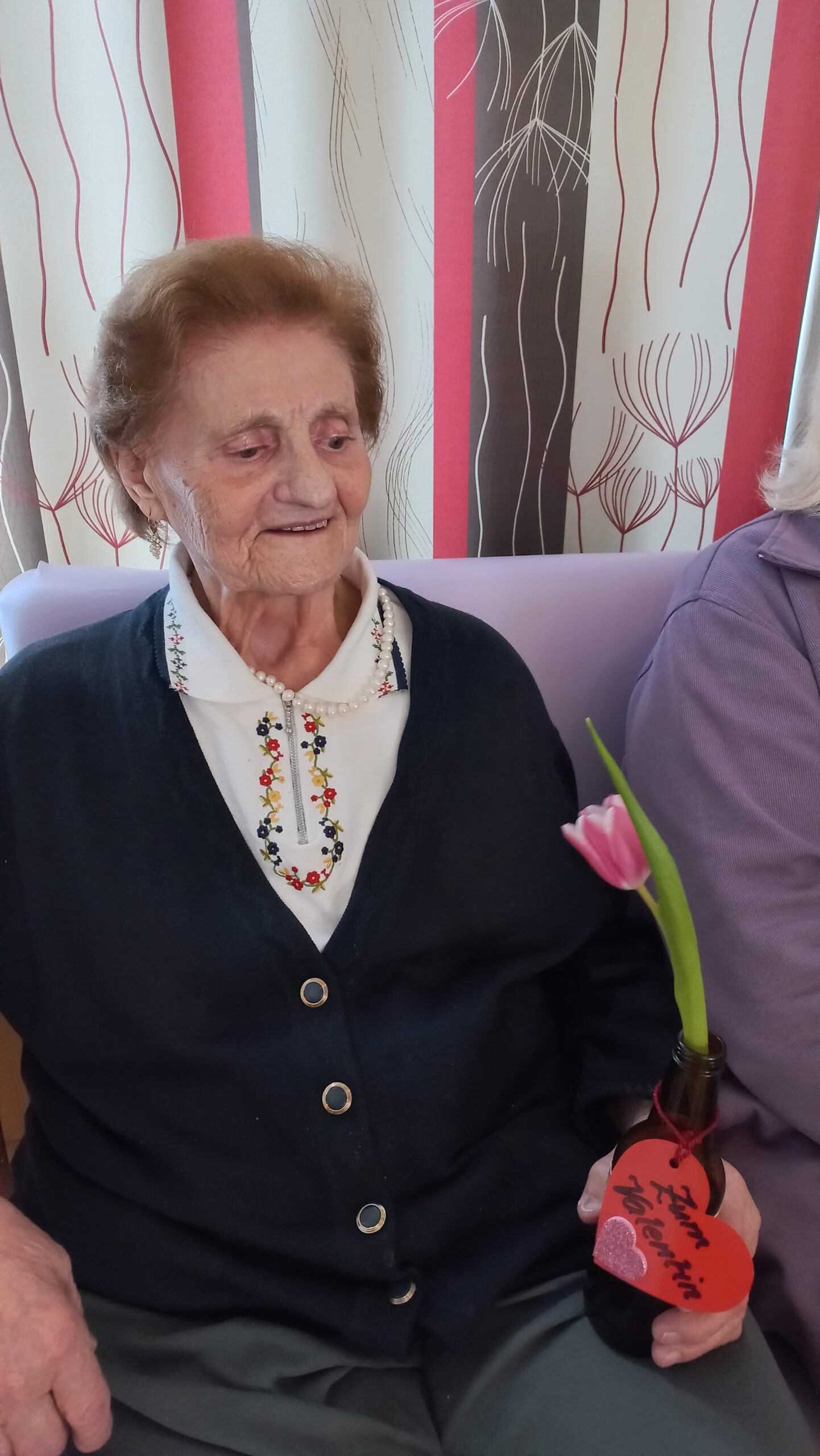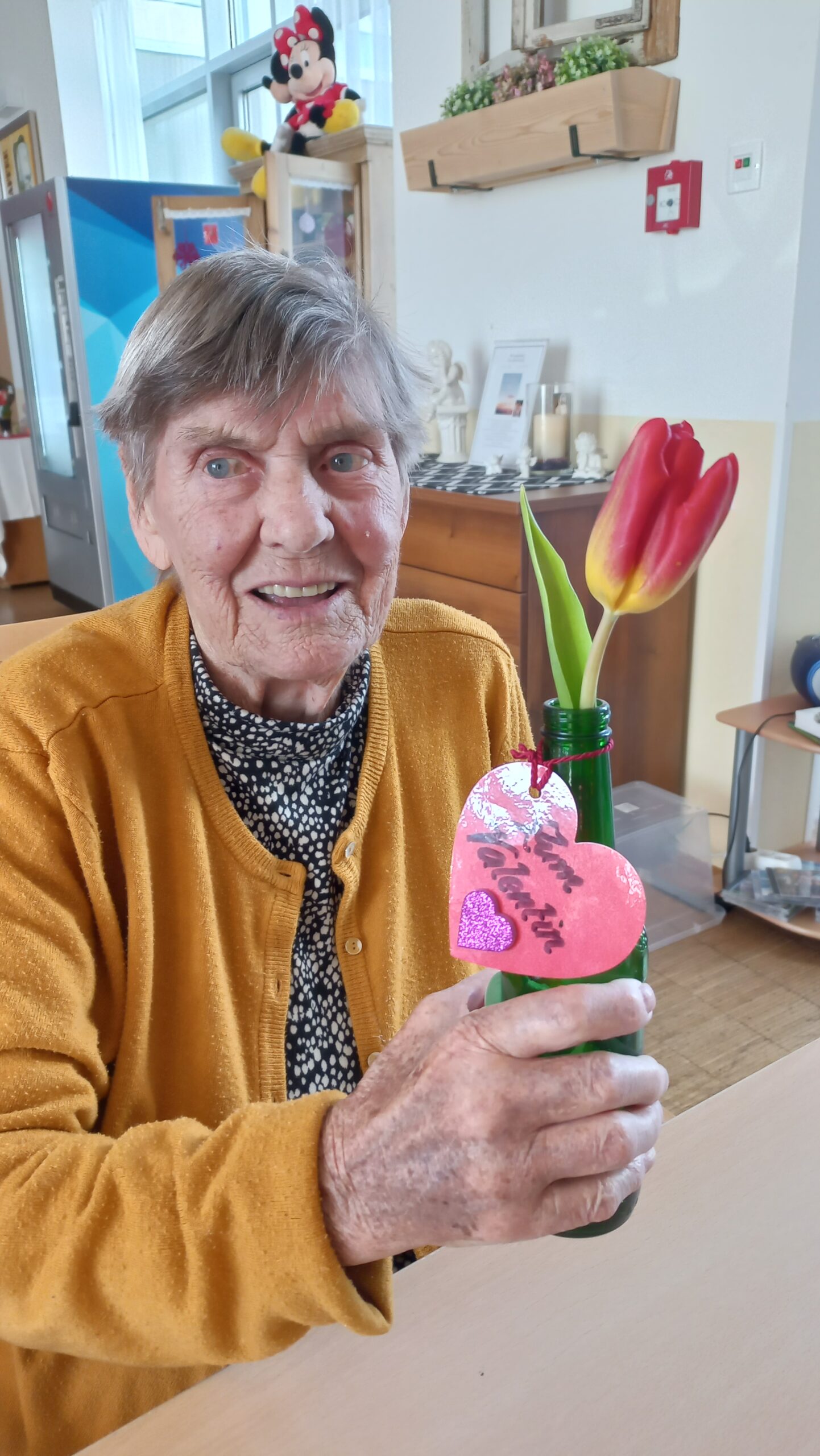 Bewohnerin Antonia Staber strahlendes Lächeln zeigt die Dankbarkeit über die liebevolle Geste.