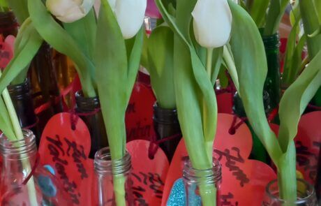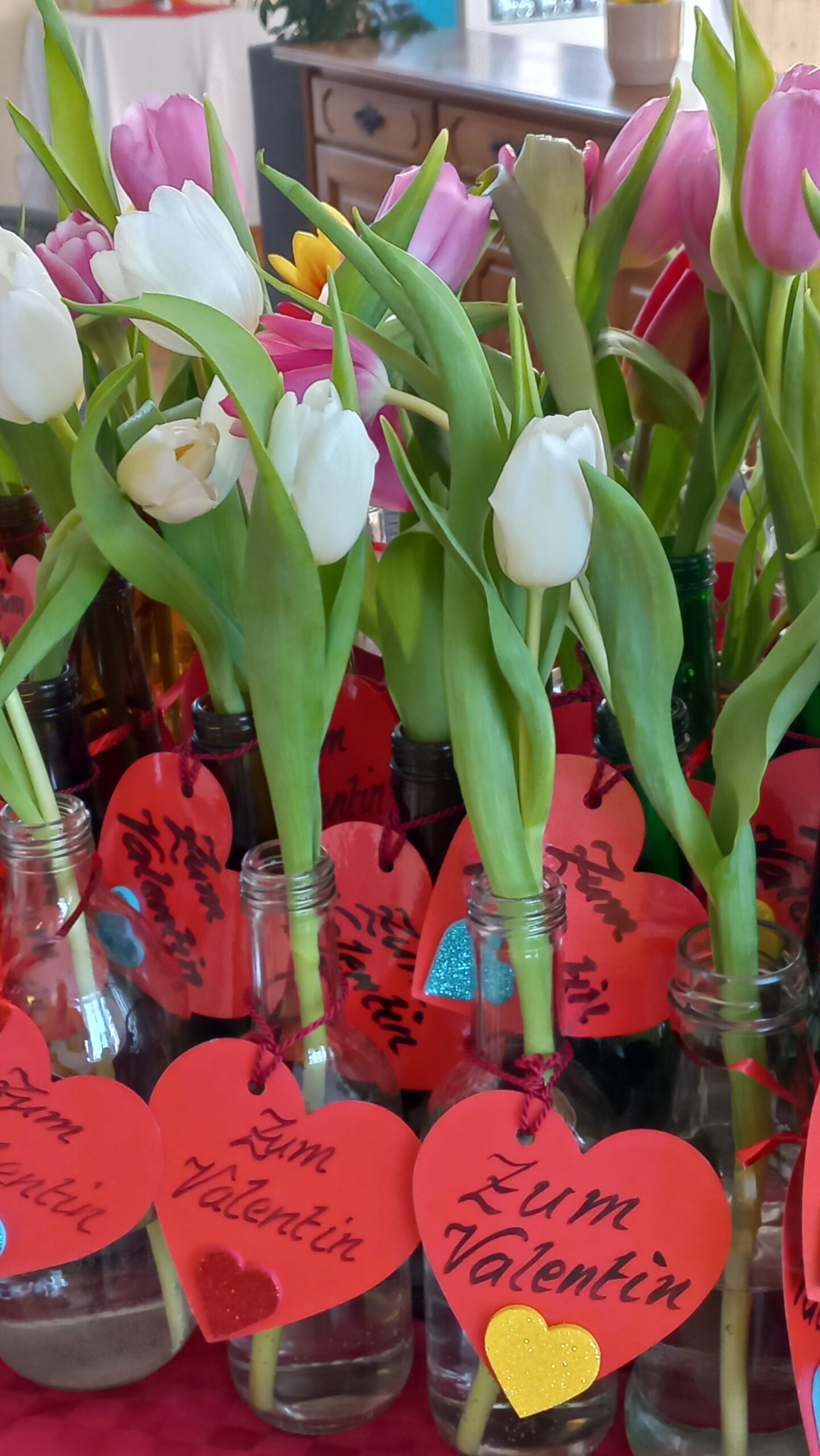 Heuer vielen zwei besondere Tage aufeinander, der Aschermittwoch, der für die Vergänglichkeit steht und der Valentinstag, der für die Liebe und Liebenden steht. Am Aschermittwoch wurde es etwas ruhiger und bei der Aschermittwochsandacht wurde man mit den Worten „Bedenke Mensch, dass du Staub bist und zum Staub zurückkehrst (MK 1,15)“ an die Vergänglichkeit erinnert. So bekamen alle Bewohner:innen und Anwesenden ein Aschenkreuz auf ihr Haupt gezeichnet. Am Nachmittag stand dann der Valentinstag im Vordergrund. Immer am 14. Februar wird dem Hl. Bischof Valentin gedacht, der einst Verliebte christlich traute und ihnen dazu Blumen überreichte. Ein schöner Brauch der schon seit dem späten 14. Jahrhundert seine Begründung fand. Diesmal hat das Team des Hauses Tulpen ausgewählt. In einer Flasche mit Herzen verziert wurde der Blumengruß an alle Bewohner:innen verteilt. Die Freude war riesengroß und jeder nahm den Blumengruß dankbar an.