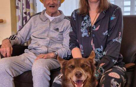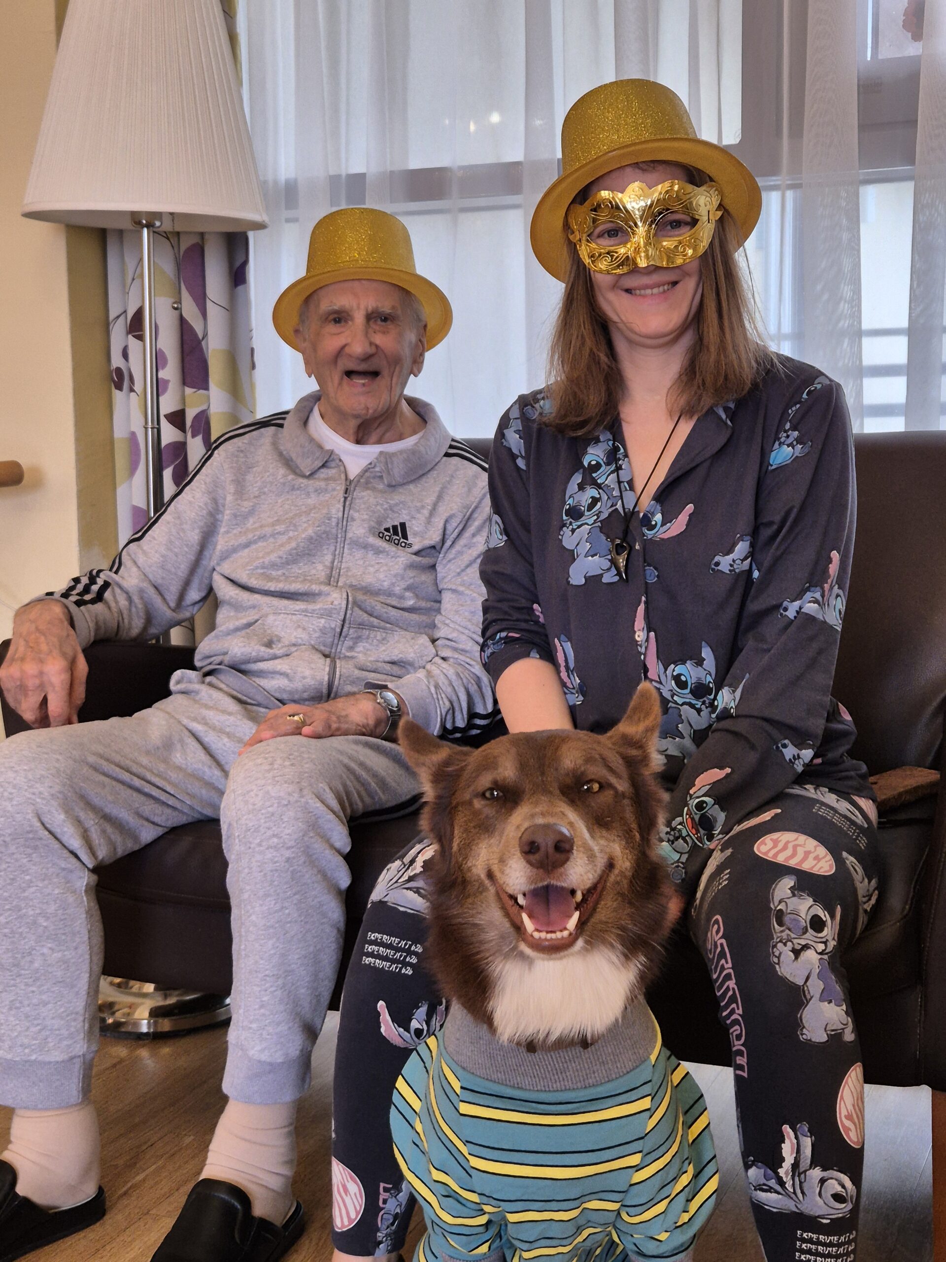 Holzer Johann und Hundetherapeutin Carmen Pendl mit Chester im Pyjama