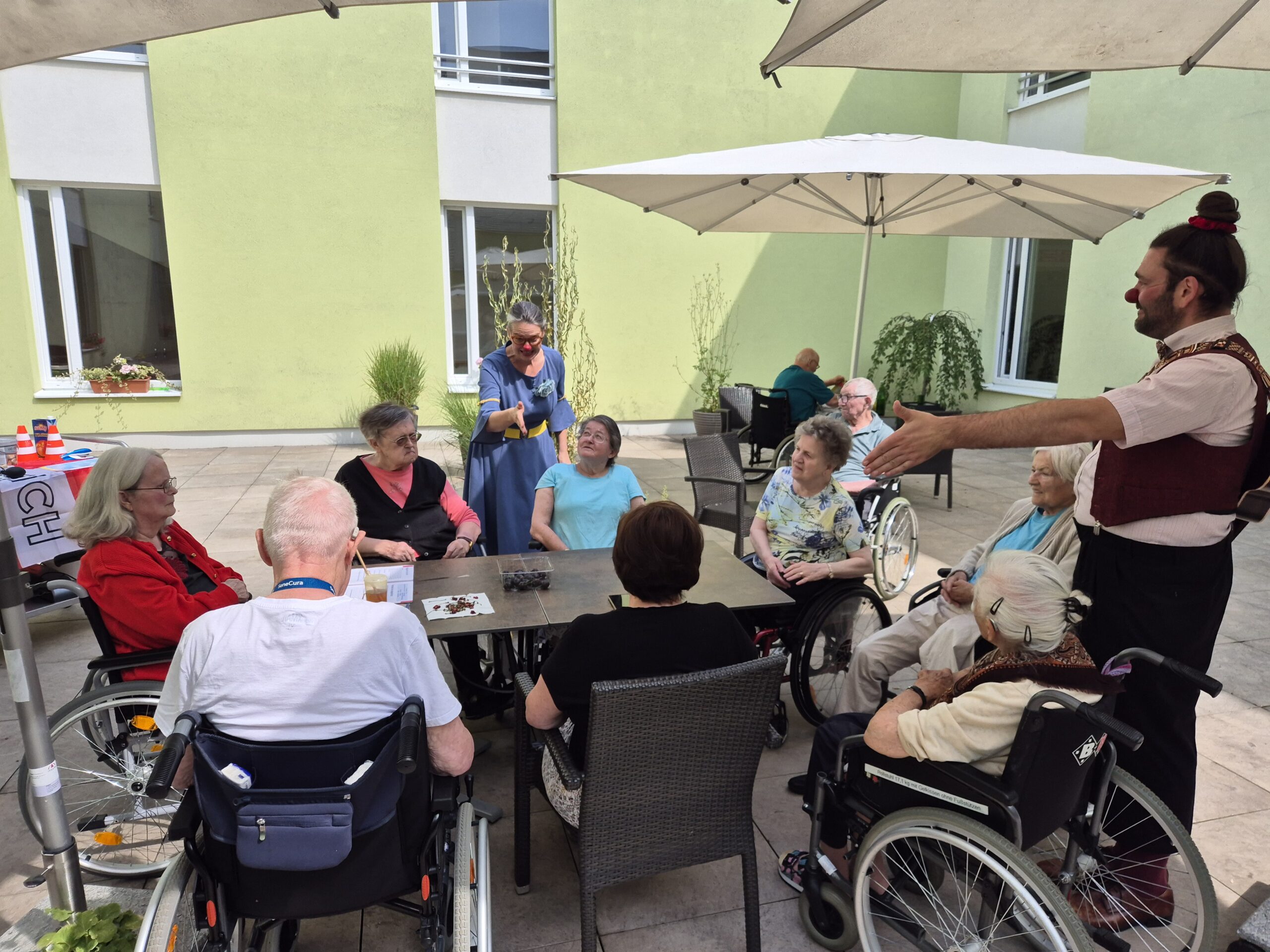 Die Bewohner:innen haben Spaß bei der Darbietung Die zwei roten Nasen sorgen für viel Gelächter.