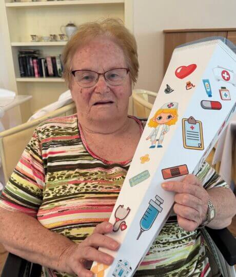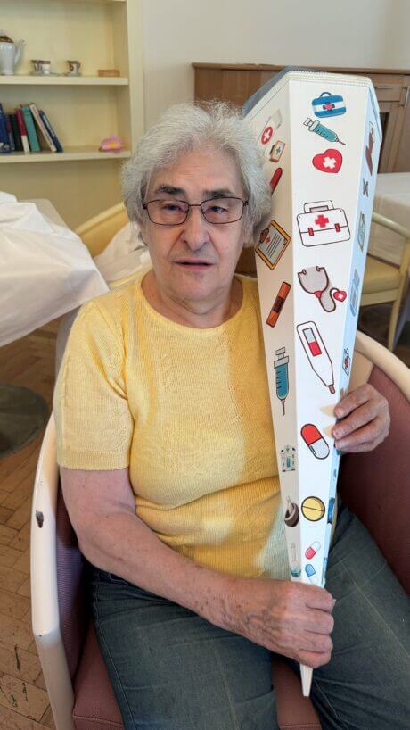 Die Bewohnerin präsentiert stolz ihre Schultüte.