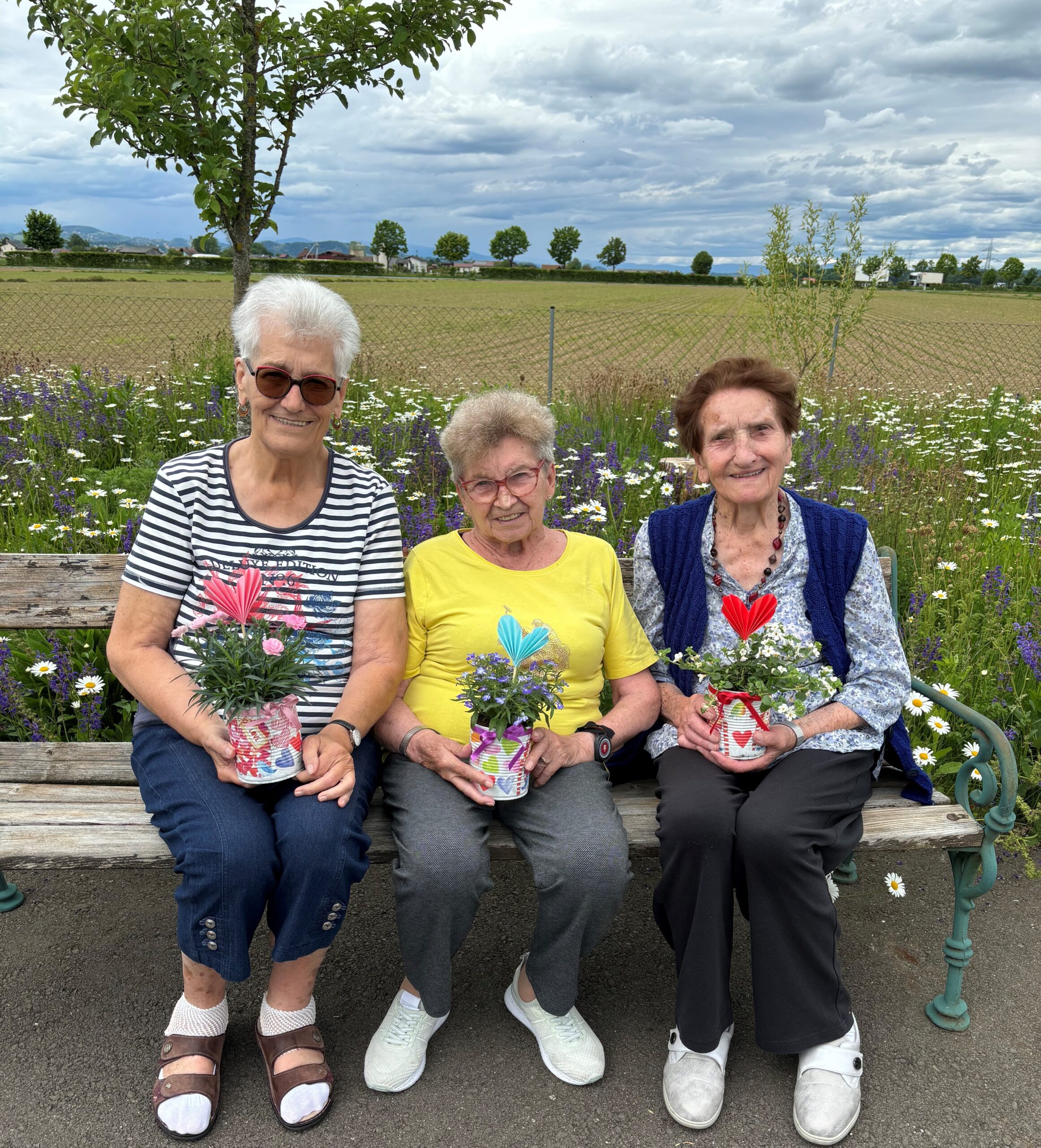 Die Bewohnerinnen präsentieren stolz ihre finalen Muttertagsdekorationen.