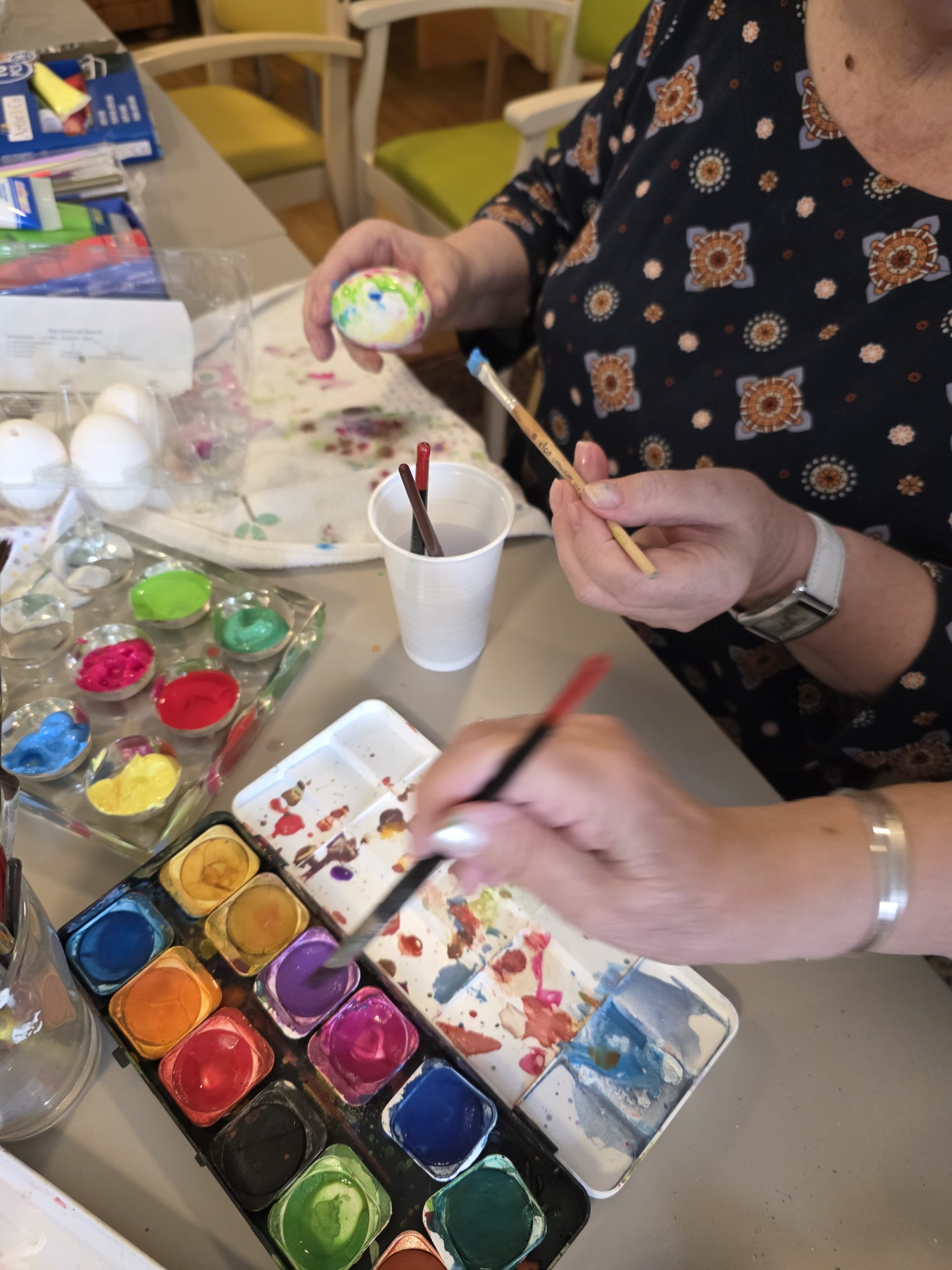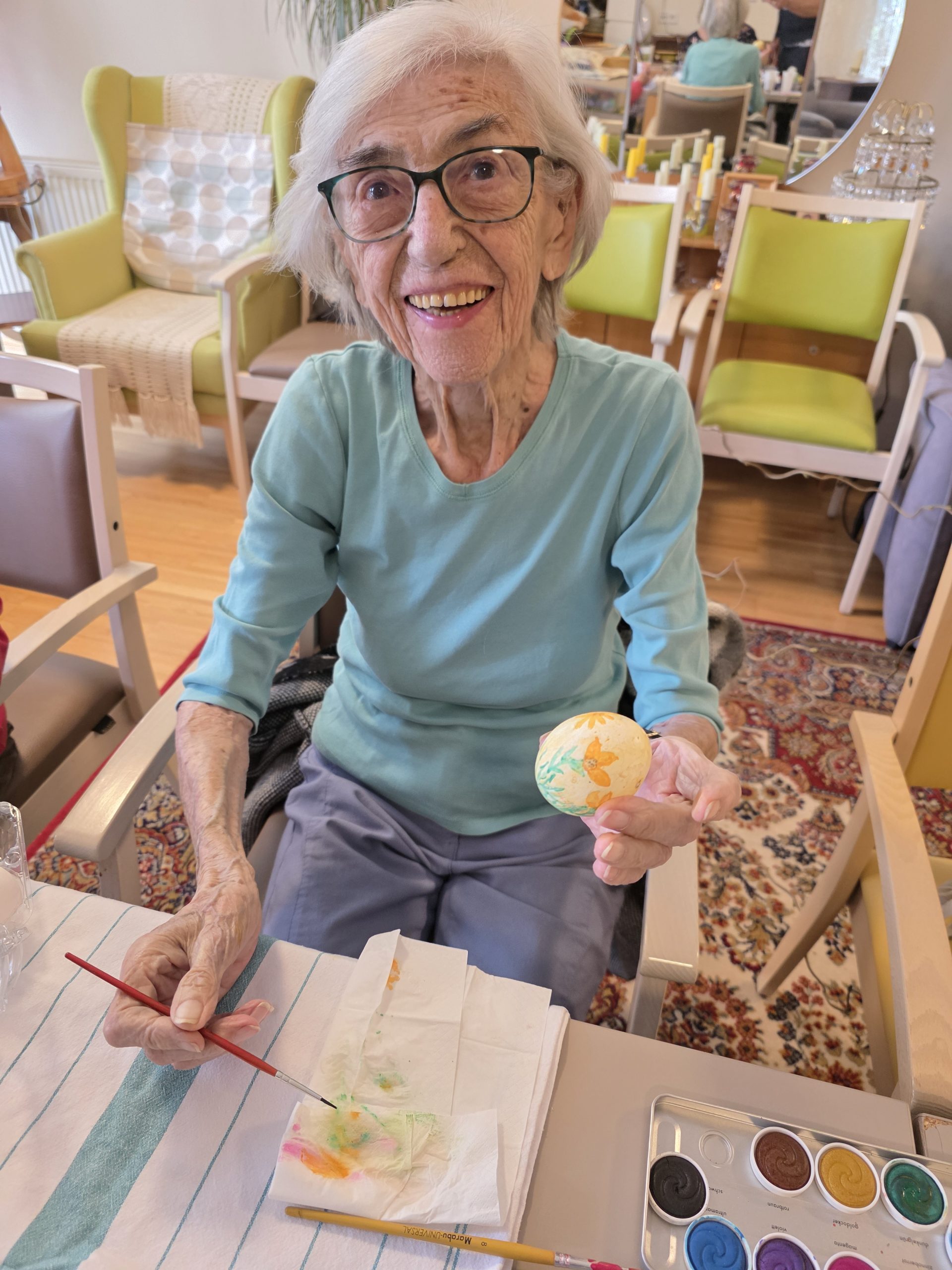 Das Osterfest steht vor der Tür, und darum haben Aktivitätenleiter Siegfried Rumpold sowie die Bewohnerinnen und Bewohner des SeneCura BePartments Graz-Lend alle Hände voll zu tun. Bunte Frühlingsaktivitäten wie Ostereier anmalen, Grußkarten basteln und noch vieles mehr steht derzeit am Programm. Auch Bewohnerin Christa Stocker mit ihren fast 100 Jahren hilft eifrig bei den Vorbereitungen mit und bemalt ruhig und entspannt zahlreiche Eier. „Alle sind begeistert und erfreuen sich an den gemeinsamen Aktivitäten.“, sind sich die Teilnehmer:innen einig.