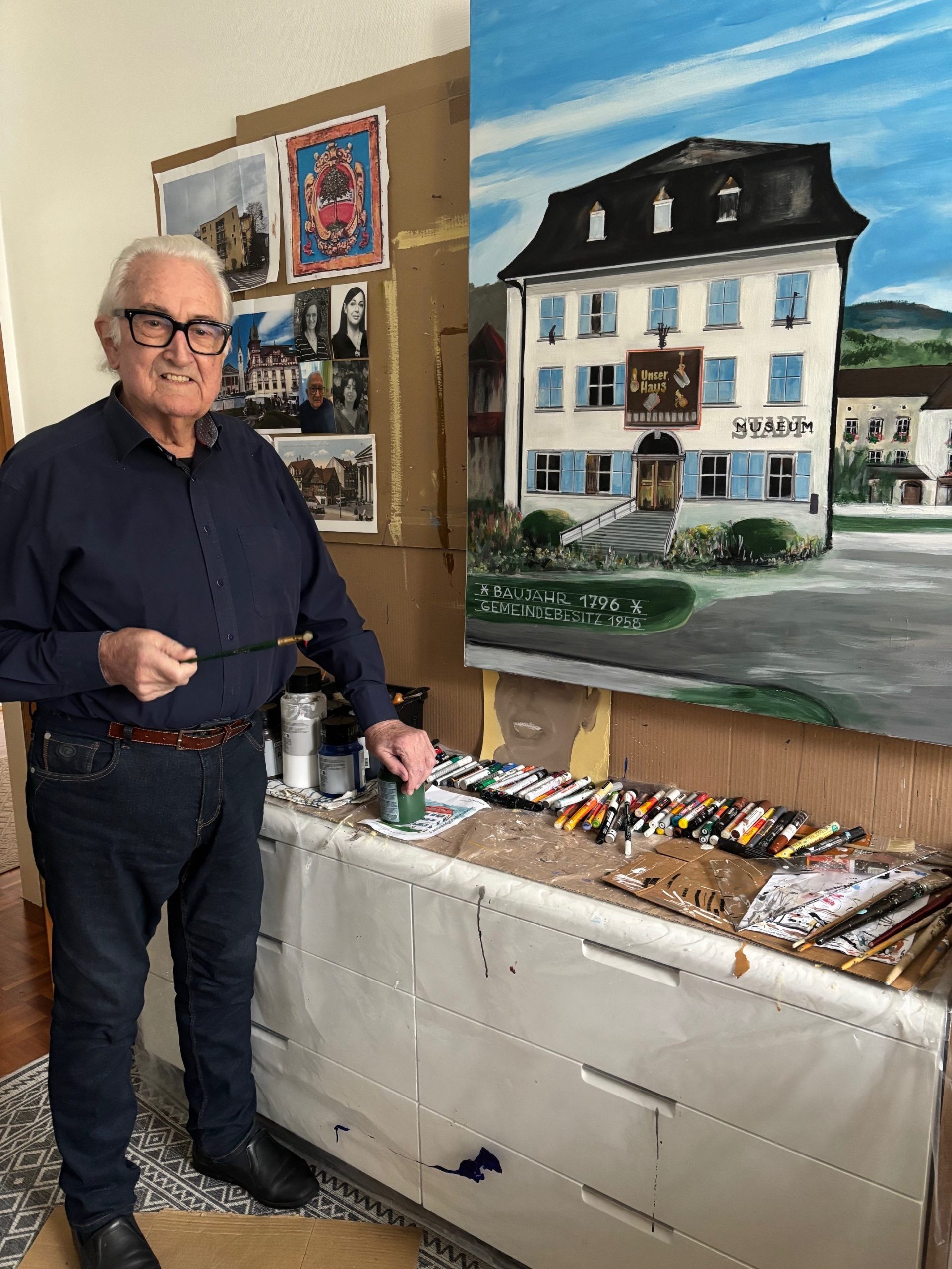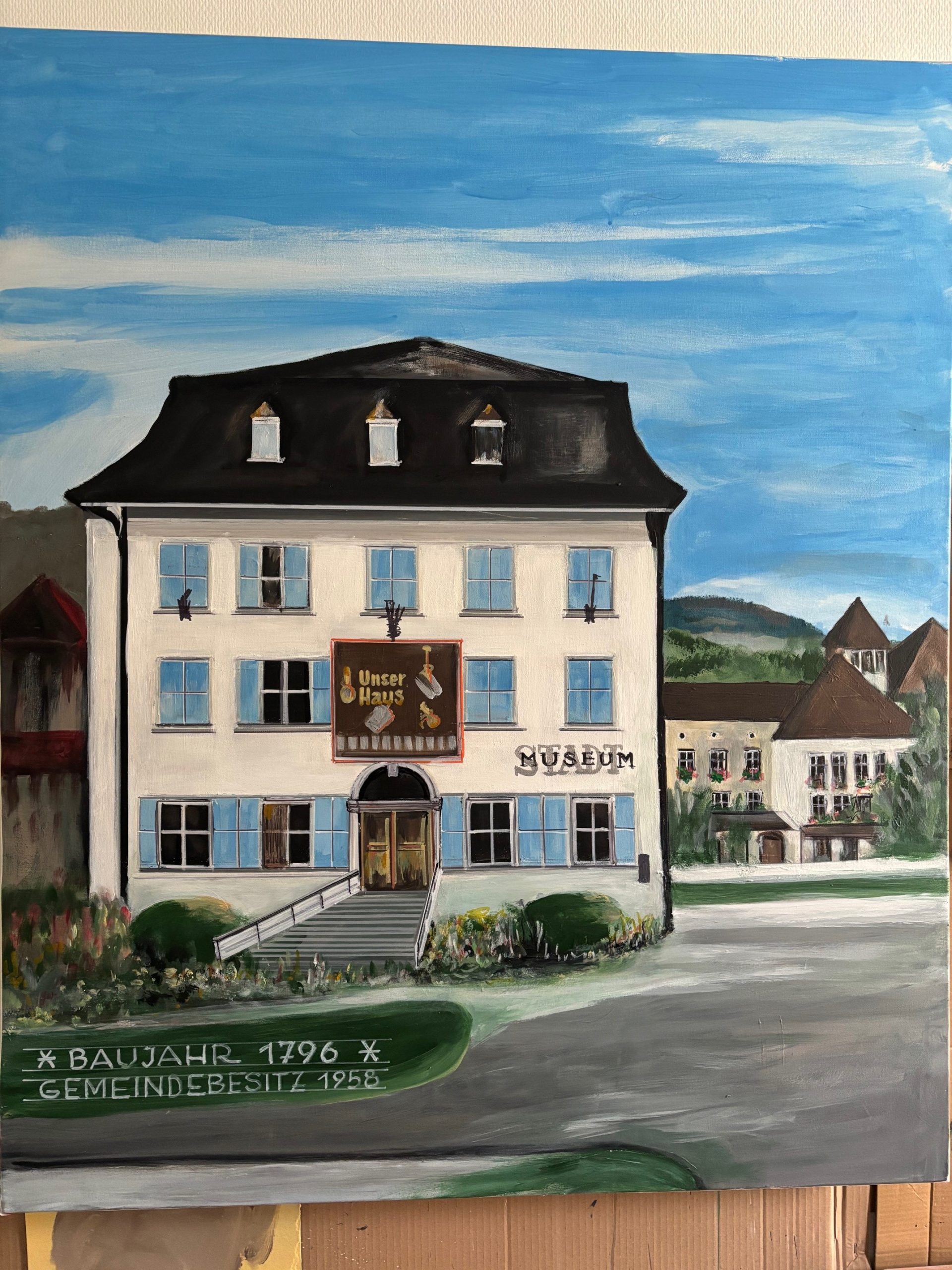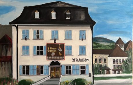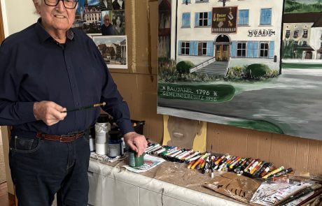 Dr. Josef Dachant, Bewohner im SeneCura Sozialzentrum Dornbirn, hat wieder sein künstlerisches Talent unter Beweis gestellt und ein wunderschönes Bild für unser Hauscafé gemalt. Das Werk zeigt das Dornbirner Stadtmuseum und beeindruckt durch viele liebevolle Details.