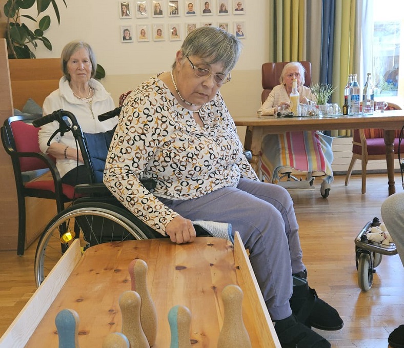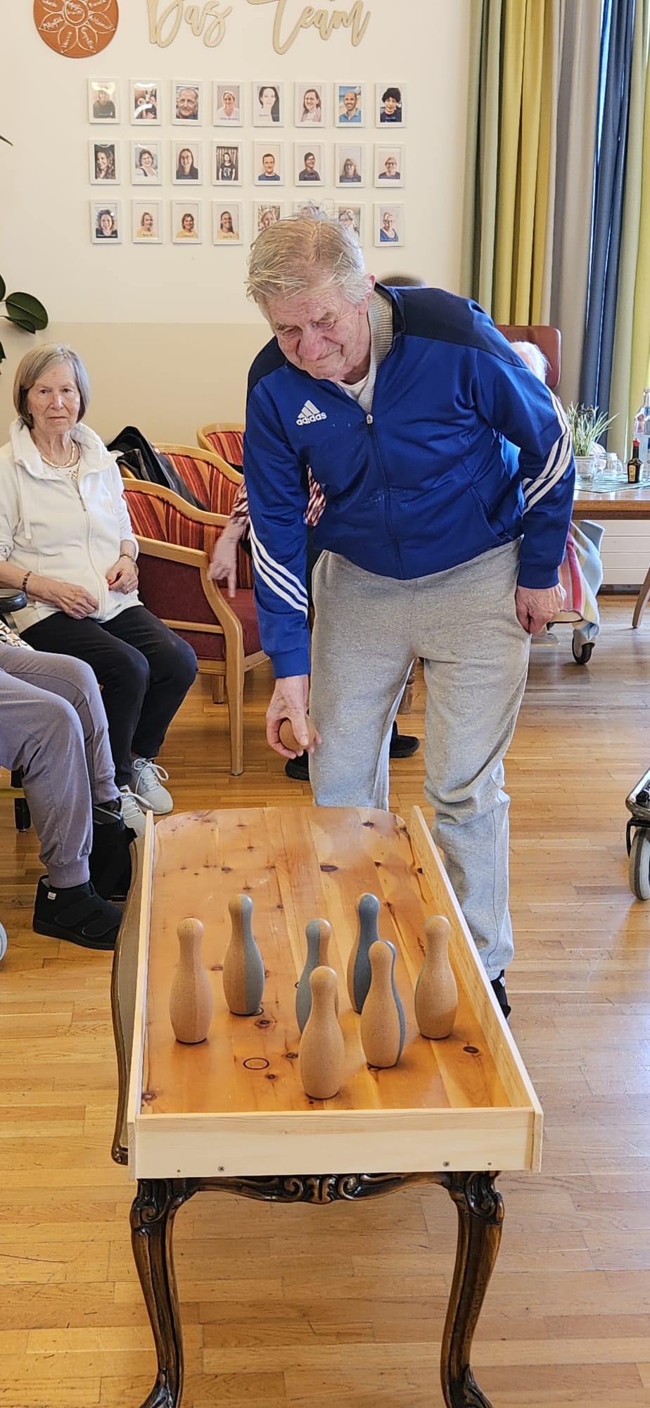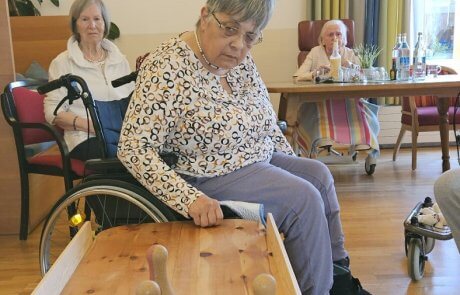 Mit einer seniorengerechten Kegelbahn macht Heimhilfe Silvia den Bewohner:innen des SeneCura Eben eine große Freude. Und so galt es möglichst schnell „alle Neune“ zu erwischen. Unterschiedlichste Aktivitäten gestalten den Alltag im Haus abwechslungsreich.