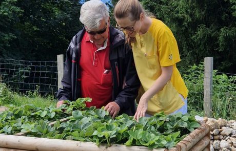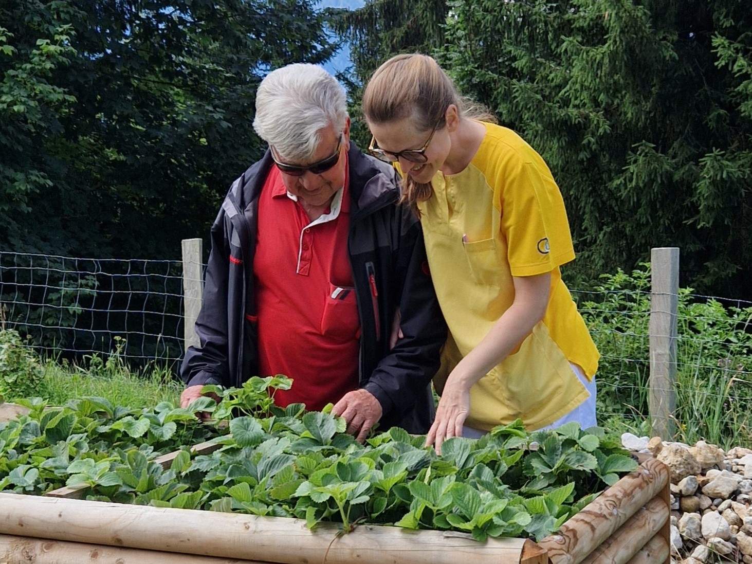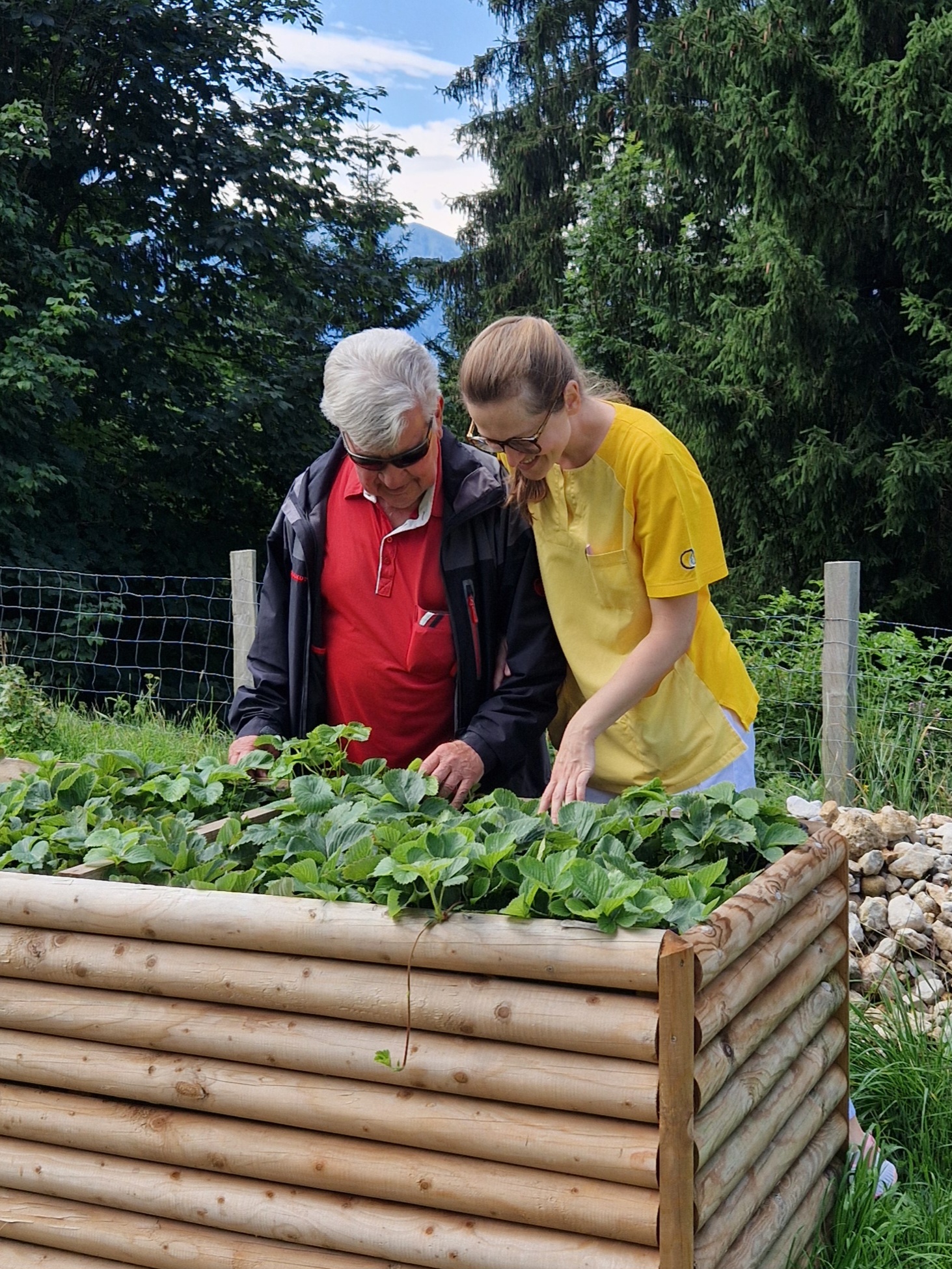 Eine ganz besondere Überraschung erwartete die Bewohner:innen des SeneCura Sozialzentrums Eben vor Kurzem am Gartenzaun: Renate Kaiser, eine engagierte Nachbarin, hat im nahegelegenen Gemeinschaftsgarten ein kleines Hochbeet mit Erdbeeren angelegt – exklusiv zum Naschen für unsere Senior:innen und Mitarbeitenden!