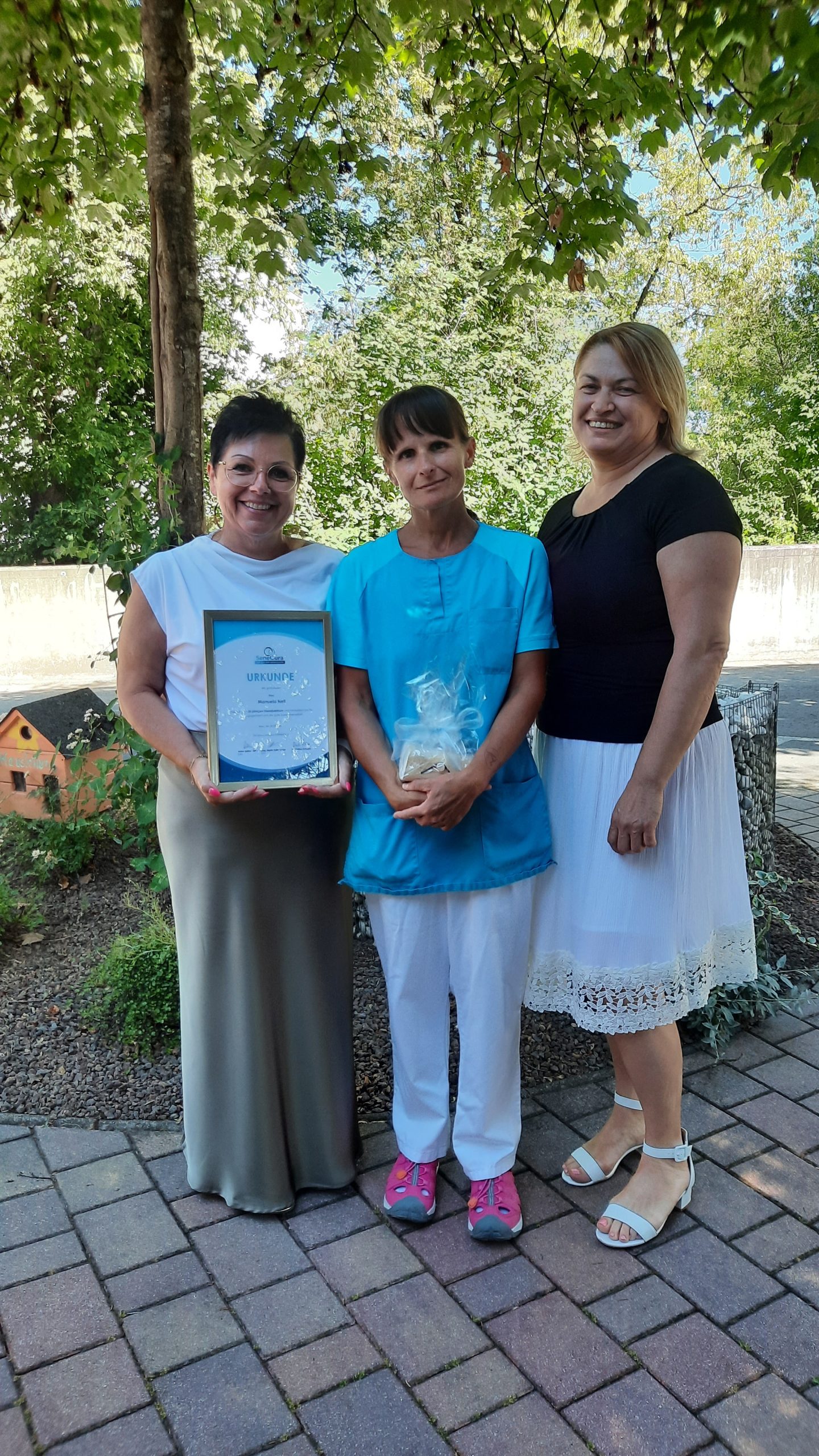Kürzlich gab es im SeneCura Sozialzentrum Feldbach etwas Besonderes zu feiern. Pflegeassistentin Manuela Nell feierte ihr 20-jähriges Dienstjubiläum. Zahlreiche Gratulationen kamen vom Kollegium. Ganz herzlich gratulierten auch Dir. Karin Erkenger und Camelia Popa MSc. mit einem kleinen Geschenk, Gutschein und einer Urkunde.