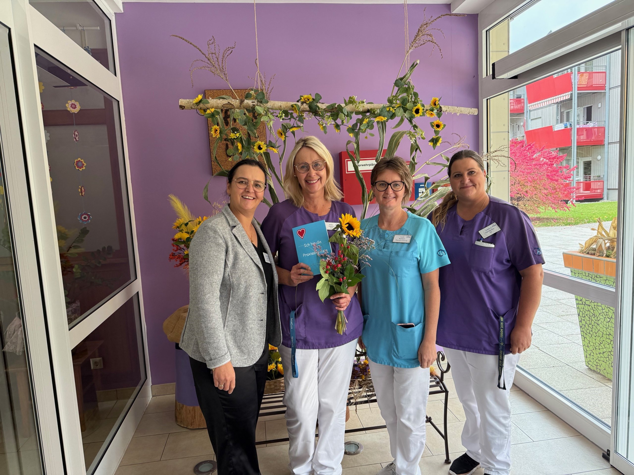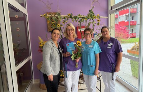 Das SeneCura Sozialzentrum Frantschach freut sich über eine neue Praxisanleiterin im Team. Die diplomierte Gesundheits- und Krankenpflegerin Petra Franken hat kürzlich den Weiterbildungslehrgang zur Praxisanleiterin erfolgreich abgeschlossen. Damit erlangte die Mitarbeiterin die Qualifikation, Schüler:innen und Praktikant:innen während ihrer Ausbildung als Mentorin zu unterstützen und sorgt damit für ein hohes Ausbildungsniveau im Haus. Hausleitung Gertraud Stückler gratulierten Petra Franken sehr herzlich zu ihrer absolvierten Ausbildung und überreichte ihr im Zuge dessen einen wunderschönen Blumenstrauß sowie Gutscheine.