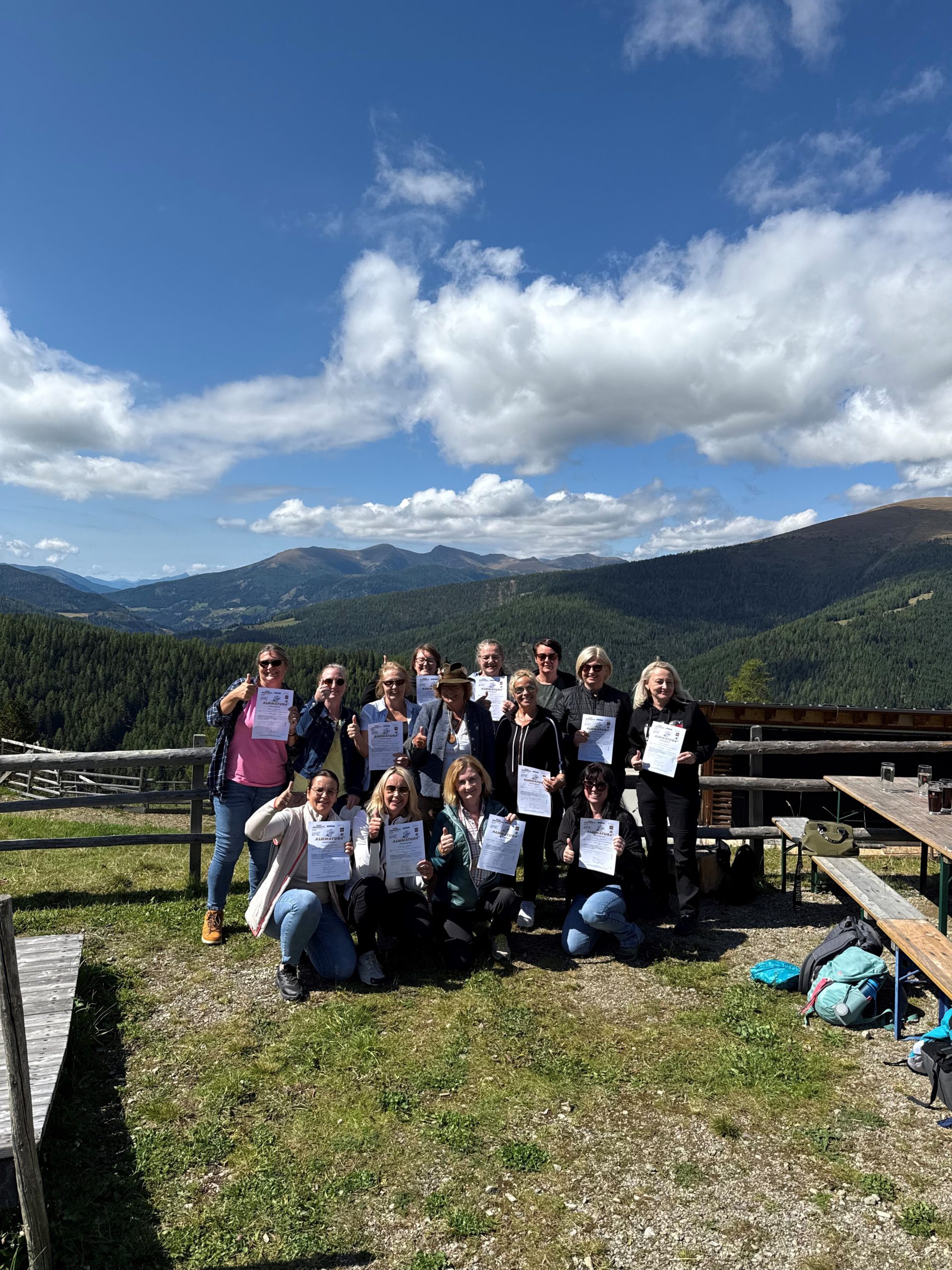 Am 06.09.2025 fand der alljährliche Mitarbeiter:innenausflug des SeneCura Sozialzentrums Frantschach statt. Heuer stand ein besonderes Programm auf der Tagesordnung: es wurde die „Almmatura“ gemacht. Gemeinsam ging es aufs Hochrindl – auf einem Almrundgang wurde den Mitarbeiter:innen die Kräuter-, Tier- und Pflanzenkunde gelehrt, die bei der schriftlichen Maturaarbeit abgefragt wurden. Weiters musste eine Kuhattrappe gemolken werden sowie Nägel auf Zeit eingeschlagen werden. Alle Mitarbeiter:innen haben die Almmatura mit Bravour bestanden, natürlich durfte der Spaß dabei nicht zu kurz kommen. Nach einem gemeinsamen Mittagessen an der frischen Luft und mit dem Maturazeugnis in der Hand ging es wieder zurück ins Lavanttal.