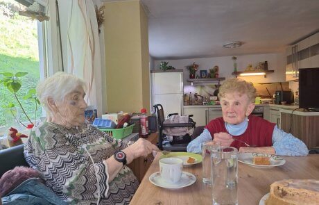 Ein herzliches Wiedersehen folgte beim Besuch ihrer Cousine Maria Schedler, die am Beginn der Wanderstrecke zum Quelltuff wohnt – ganz in der Nähe des Hauses, in dem Frau Gappmeier einst lebte und ihre Kinder großzog. Bei selbstgemachtem Apfelkuchen und Kaffee wurde gelacht, erzählt und in Erinnerungen geschwelgt.