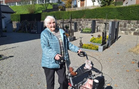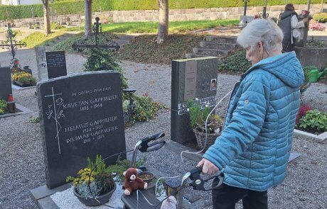 Bei strahlendem Sonnenschein und herrlichem Herbstwetter führte der Weg zunächst zum Friedhof in Lingenau, wo Frau Gappmeiers Mann, ihr Sohn und ihre Eltern ihre letzte Ruhe gefunden haben. In stillem Gedenken legte sie Blumen auf die Gräber – ein sehr bewegender Moment, der allen Beteiligten noch lange in Erinnerung bleiben wird.