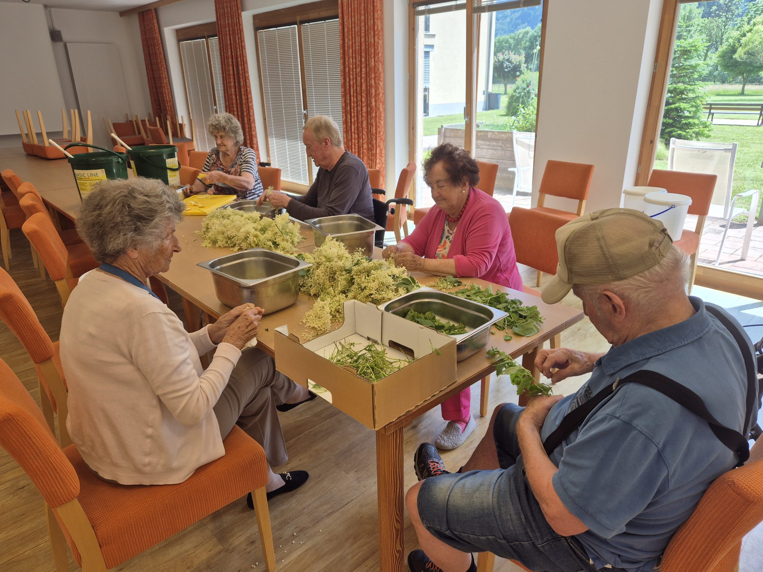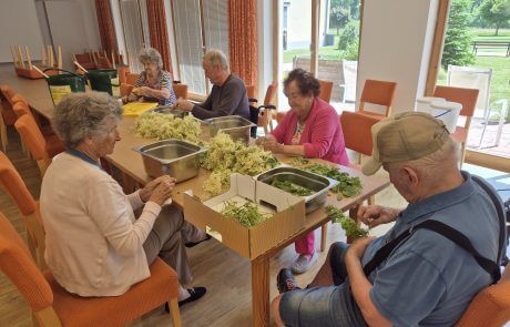 Eifrig wurden die weißen Blüten gepflückt und von den Bewohnerinnen und Bewohnern anschließend verarbeitet. In einer netten Gruppe wurden die Blüten von den Stängeln gezupft und die Orangen in Scheiben geschnitten. Die Citrusfrucht verleiht dem Hollersirup eine ganz besondere Note und versichert, dass dieser köstlich wird.