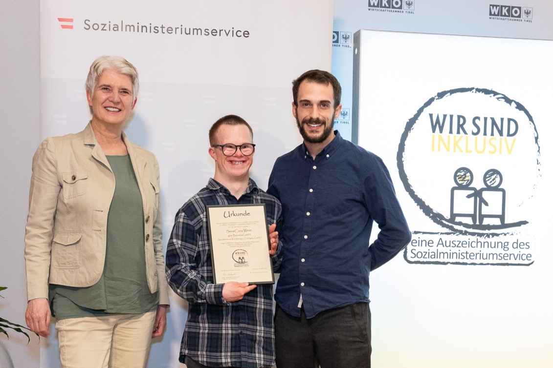 Auch heuer wieder verlieh das Sozialministeriumservice Tirol die Auszeichnung „Wir sind inklusiv“ an Unternehmen, die Maßnahmen zur Förderung der Integration von Menschen mit Behinderung in der Arbeitswelt setzen. Diese Prämierung soll andere Betriebe darauf aufmerksam machen, dass die Beschäftigung beeinträchtigter Menschen von großem Mehrwert sein kann. Während der Prämierungsfeier durfte sich auch das SeneCura Sozialzentrum Kirchberg zum wiederholten Mal über die Würdigung freuen. Im Haus sind aktuell zwei Mitarbeiter:innen mit Beeinträchtigungen in den Bereichen Wäscherei und in der Wohngruppe für Menschen mit Demenz beschäftigt. Dabei geht es vor allem darum, den Angestellten Hilfestellung bei der Festlegung von Struktur und Abläufen in der täglichen Arbeit zu bieten. Die Arbeitszeiten und Aufgaben werden dabei an die individuellen Bedürfnisse angepasst – das gesamte Team unterstützt den Kollegen Maxi Zeuner, der üblicherweise Essen und Betten für die Bewohner:innen mit Demenz richtet und auch den Pflegemitarbeitenden hilft, tatkräftig und arbeitet wertschätzend mit ihm zusammen.
