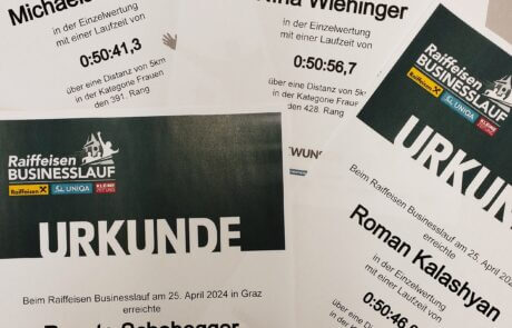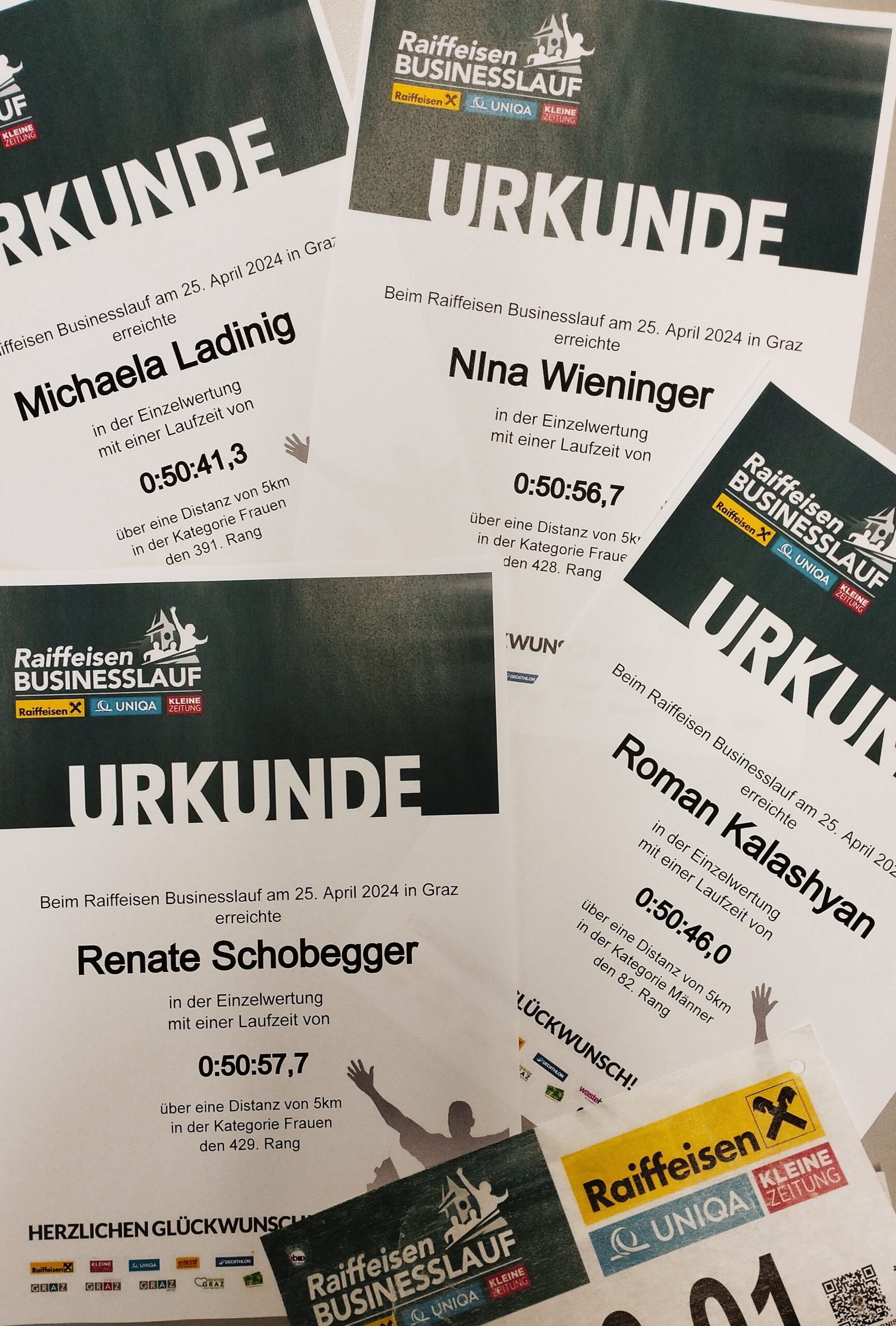 Die Urkunden der Teilnehmer:innen des Businesslaufs in Graz.