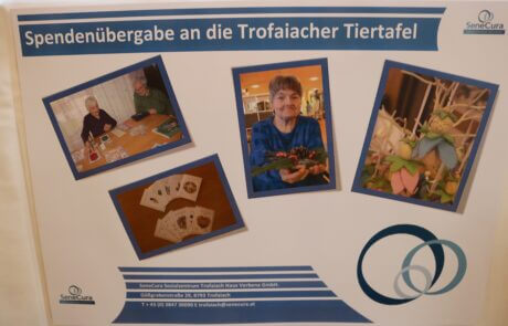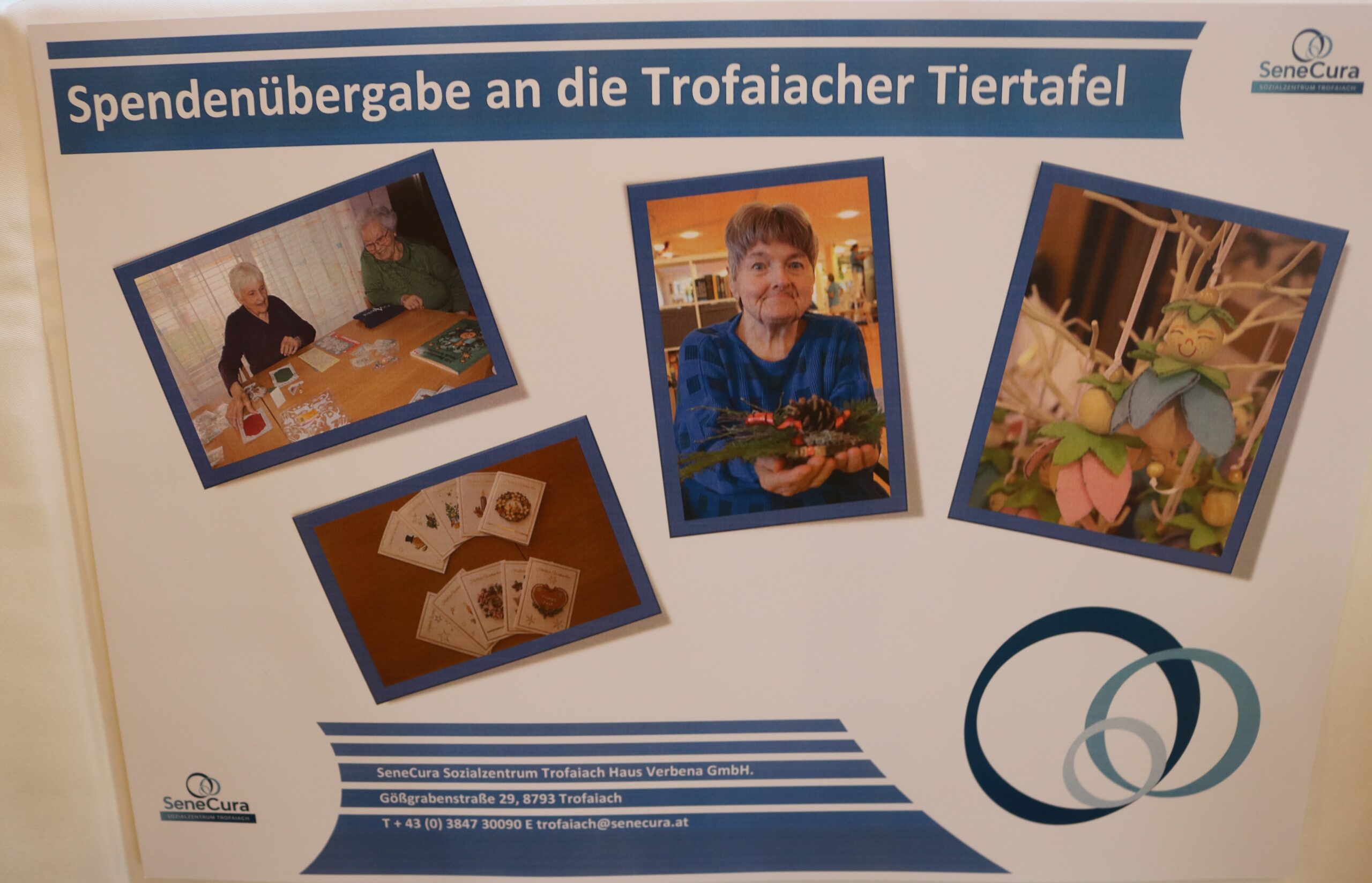 „Es ist uns eine besondere Freude, dass wir mit der Weihnachtstombola und den Bastelarbeitern mit unseren Bewohner:innen die Tiertafel Trofaiach unterstützen können.“ so die Hausleitung Kerstin Pöltl. In Zeiten wie diesen, wo alles teurer wird, ist es oftmals so, dass die Haustierbesitzer:innen an sich selbst sparen, um ihren Lieblingen das Beste an Futter kaufen zu können. Aus diesem Grund war die Motivation für das Charity Projekt 2024 des SeneCura Sozialzentrums Trofaiach, dass das Haus diese Menschen unterstützen möchte. Bei hauseigenen Weihnachtsdorf wurden damals selbstgebastelte kleine Kunstwerke der Seniorinnen und Senioren verkauft und zusätzlich gab es eine Tombola mit tollen Preisen. Frau Sarrer Claudia, Vorsitzende der Tiertafel Trofaiach, nahm die Sachspenden freudig entgegen und ihr obliegt es, das Futter an bedürftige Haustierbesitzer:innen zu verteilen.