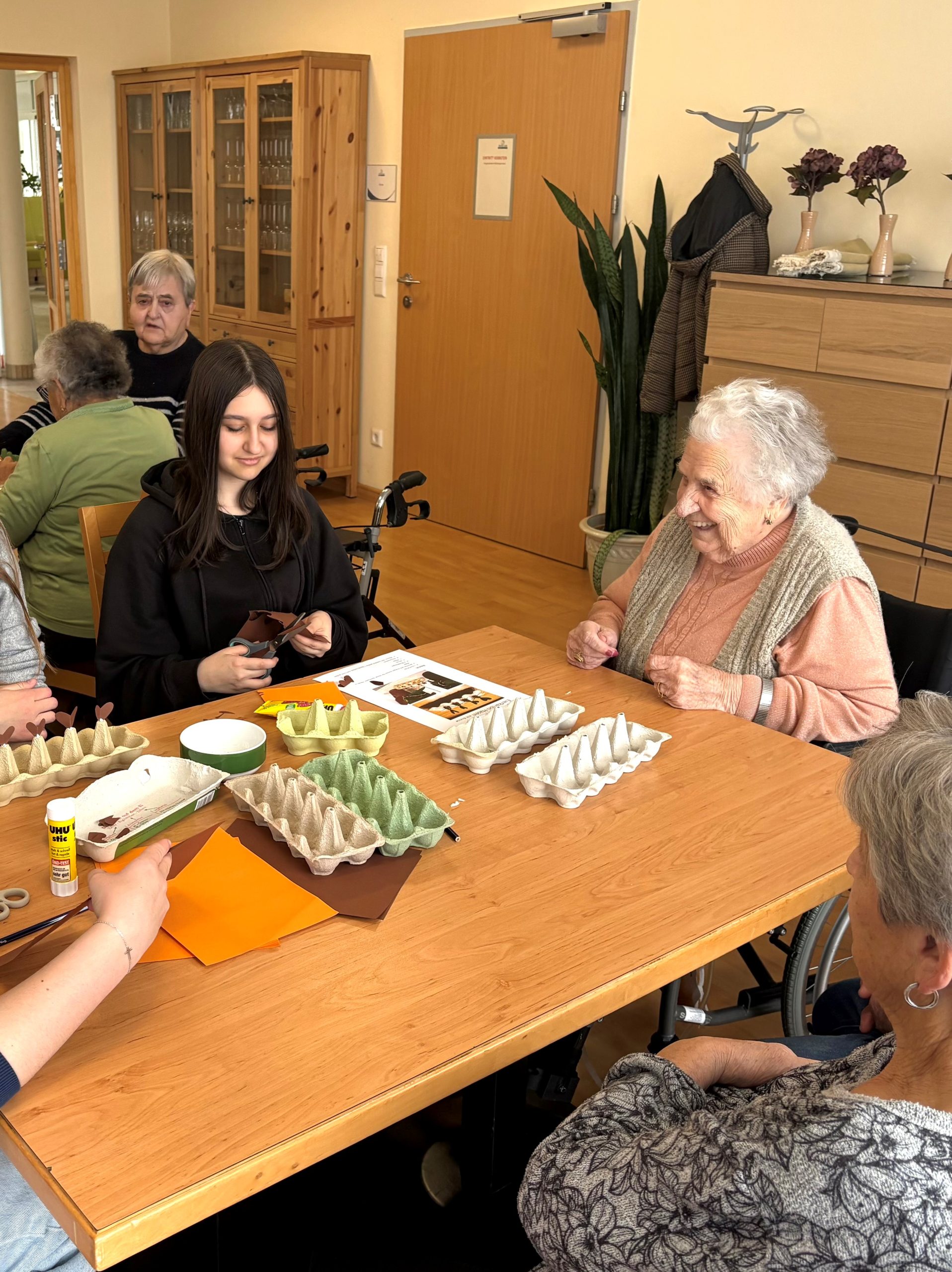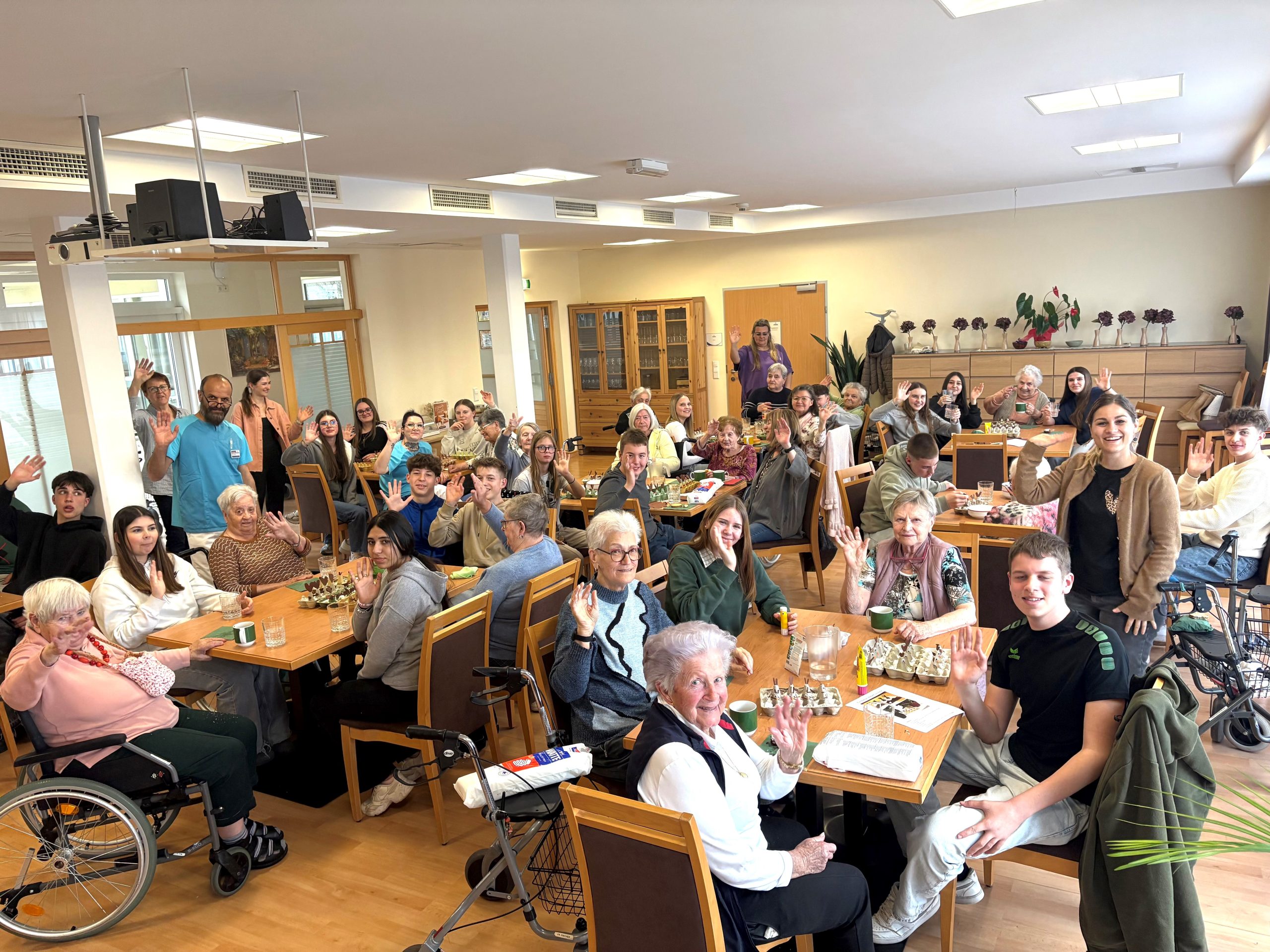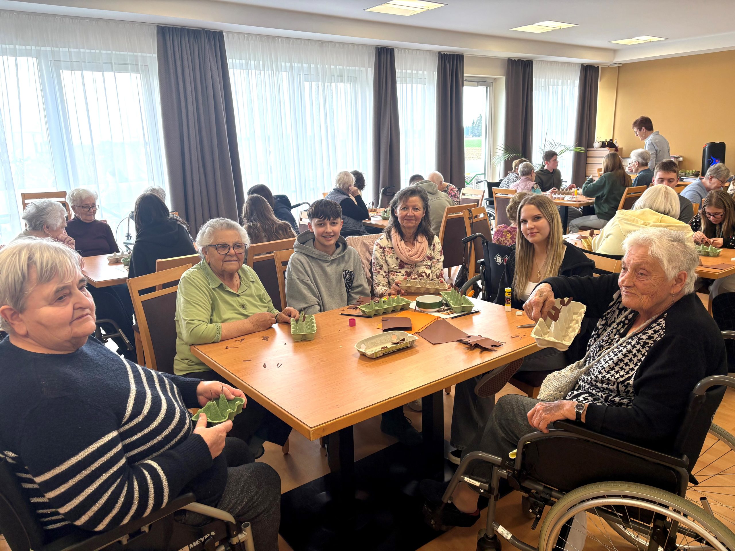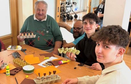 Im Rahmen eines Generationenprojekts gibt es einen laufenden Austausch des SeneCura Sozialzentrums St. Veit in der Südsteiermark mit der 4. Klasse der NMS Straß. Kürzlich besuchte die 4. Klasse der NMS Straß die Bewohnerinnen und Bewohner, um mit ihnen gemeinsam zu basteln und Zeit zu verbringen. Gemeinsam wurde diesmal die österliche Dekoration gemacht. Aus alten Eierverpackungen wurden frühlingshafte Osterhäschenkistchen, die mit Kresse bepflanzt wurden. „Ein schönes vorösterliches Projekt von dem Jung und Alt profitieren.“, so Regina Kahapka, Hausleitung des SeneCura Sozialzentrums St. Veit.