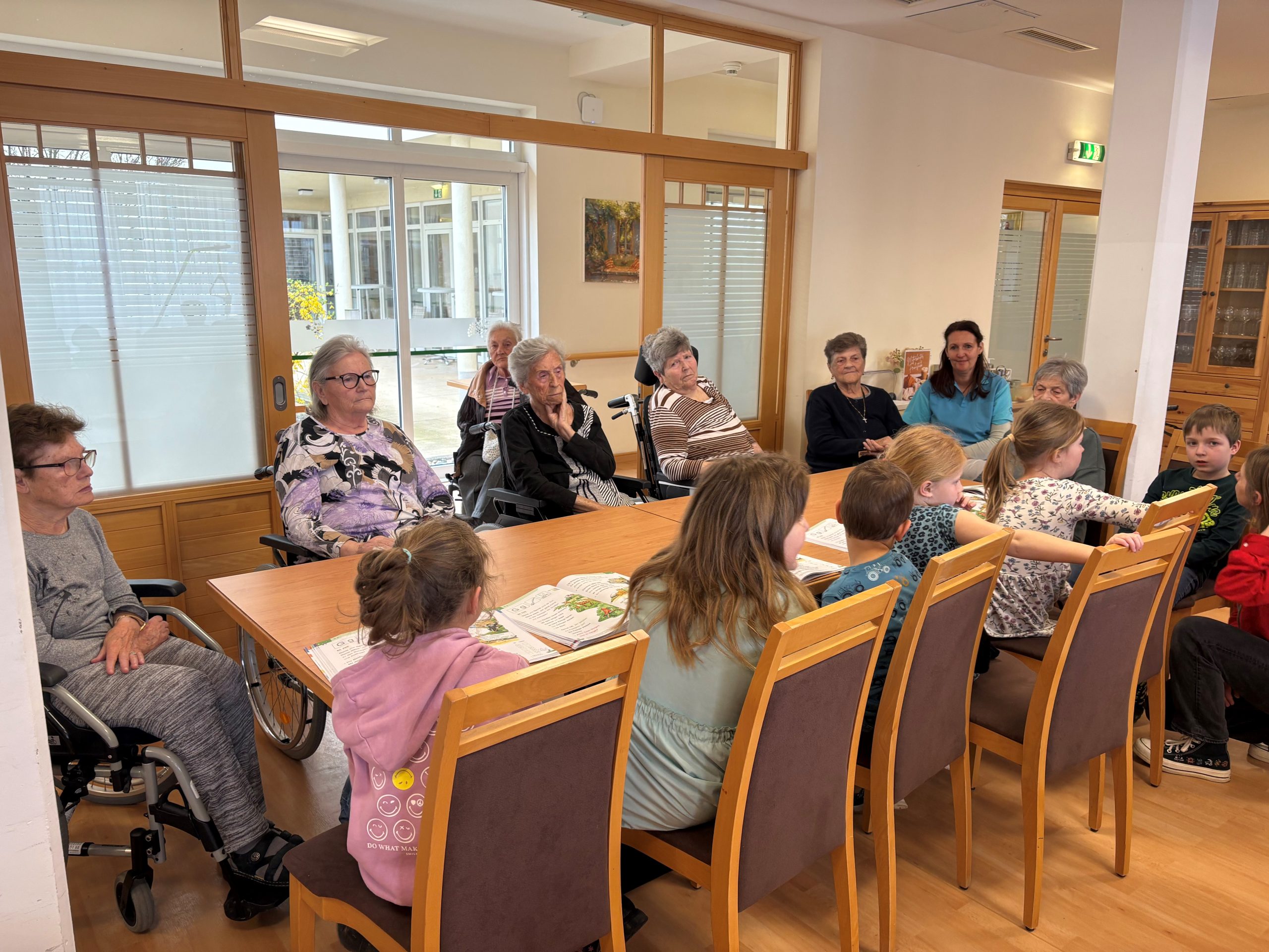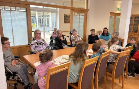 Kürzlich besuchten die Volksschüler:innen der 1. Klasse in Vogau, die Senior:innen des SeneCura Sozialzentrums St. Veit. Das lieb gewonnene Leseprojekt findet einmal pro Monat statt und neue Buchstaben bzw. kurze Textteile können bereits zur großen Freude aller vorgetragen werden. Zudem wird meistens auch ein Lied oder ein kurzes Gedicht zum Besten gegeben. Die Senior:innen und Kinder freuen sich über die gemeinsamen Stunden.