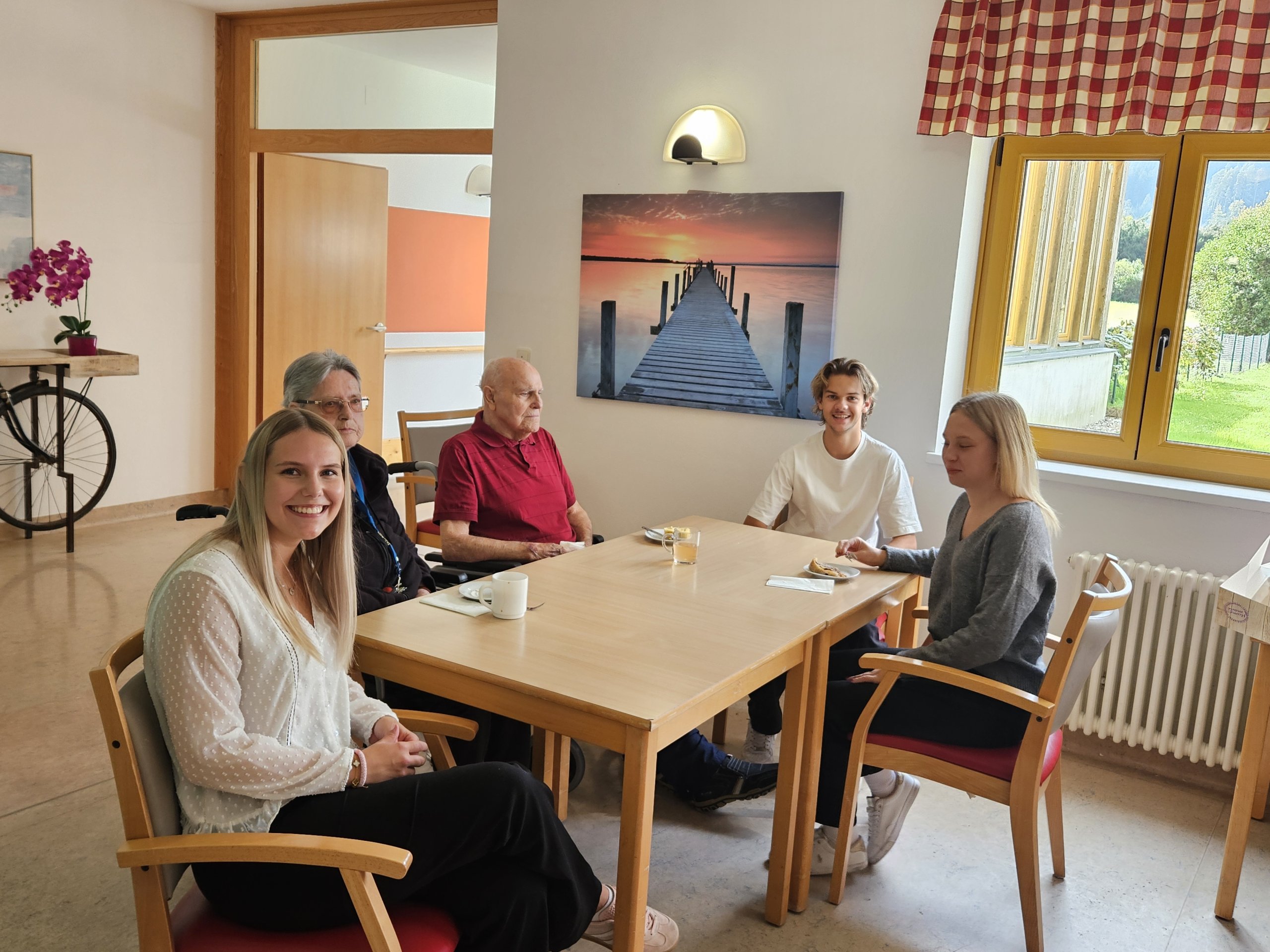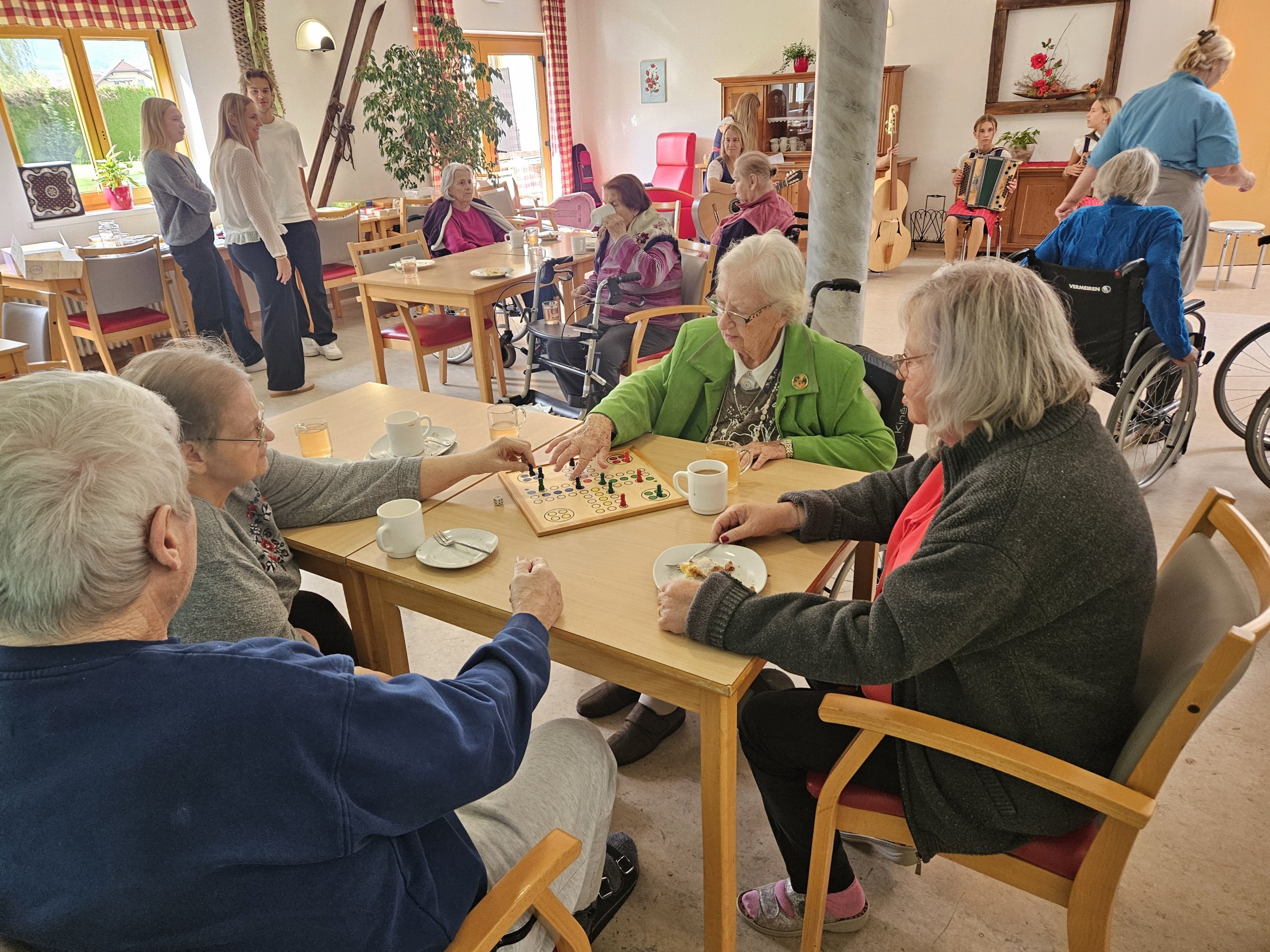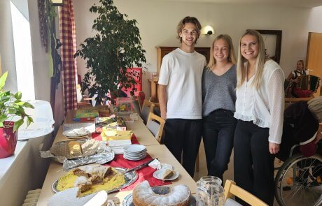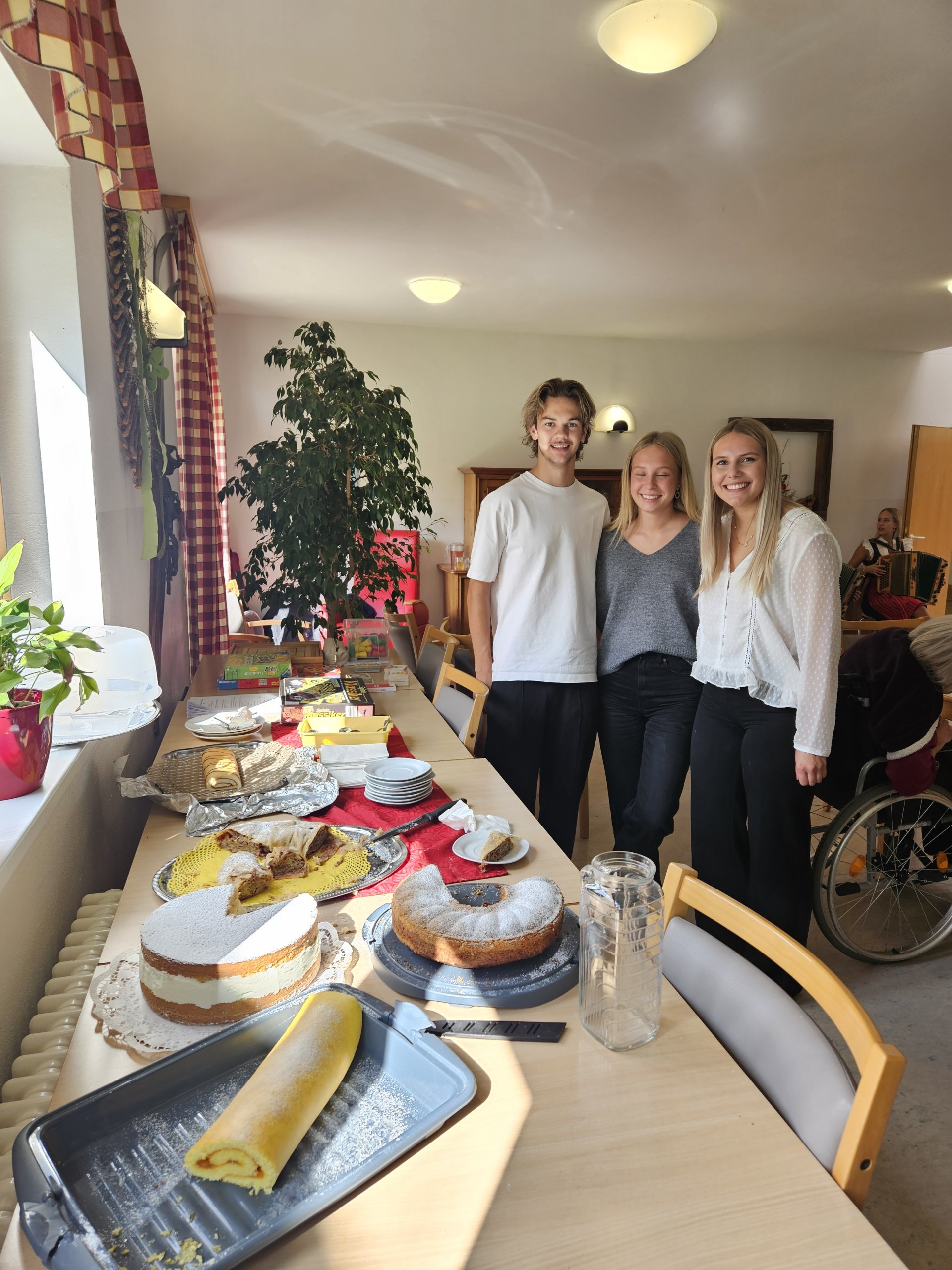 Ende September wurden die Bewohner:innen des SeneCura Pflegezentrums St. Veit/Glan besonders verwöhnt. Im Rahmen eines Maturaprojekts der HAK Althofen durften Christina, Lukas und Emmelie einen Nachmittag mit unseren Bewohner:innen gestalten. Neben gemeinsamen Brett- und Kartenspielen konnten unsere Bewohner:innen auch musikalisch unterhalten und kulinarisch verpflegt werden. Bodenständige Musik und Gesang zu bekannten Liedern ließen so manches Herz höher schlagen – und da reden wir noch gar nicht von dem leckeren Mehlspeisenbuffet, das die Maturanten extra für uns zubereitet hatten. Weil es so ein gelungener Nachmittag war, brauchten wir auch nicht lange zu überlegen, dieses Team gleich zu einer Wiederholung der Veranstaltung einzuladen. Aber zuerst halten wir einmal die Daumen für die bevorstehende Matura!