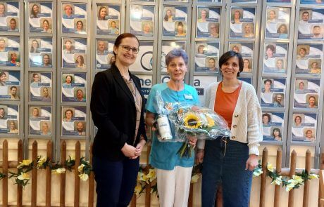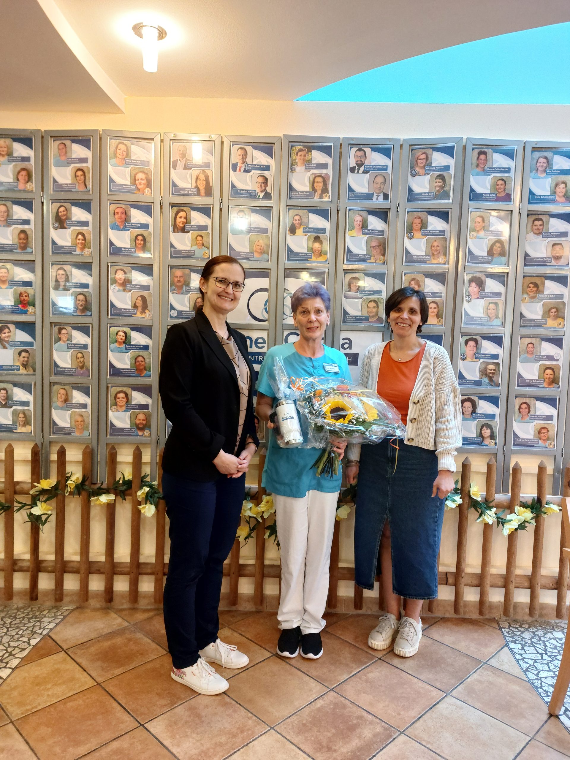 Pflegedienstleitung Andrea Ziegerhofer und Hausleitung Kerstin Pöltl sind sehr stolz auf Ljubica Bernhard und Elke Wassner und überreichten einen Blumenstrauß und SeneCura Trofaiach Thermobecher.