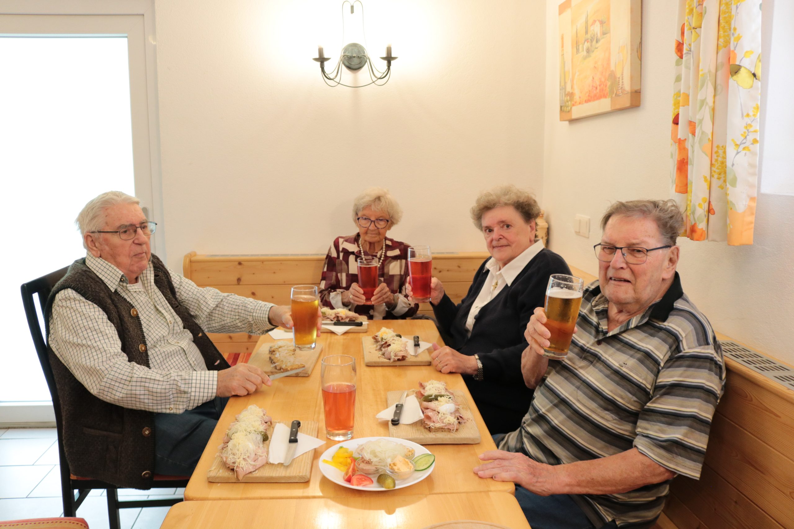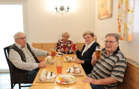 An einem Freitag machte sich eine kleine Gruppe von Bewohner:innen auf zur Buschenschenke Apfelmaier im Tollingraben. Im Tollinggraben angekommen wurden wir schon von den Tieren des Bauernhofes begrüßt. Die Esel stimmten zu einem Willkommensgruß an. Da das Wetter uns nicht sehr hold war mussten wir die Jause in der Gaststube einnehmen. Es gab ein ausgezeichnetes Schweinsbratenbrot und reichlich Most. Ein kleines Schnäpschen durfte für die Verdauung auch nicht fehlen. Kurz vor der Rückfahrt schien die Sonne und wir konnten unsere Getränke auf der Terrasse mit einem wunderschönen Ausblick genießen. Es war ein sehr geselliger Nachmittag beim Apfelmaier im Tollinggraben.