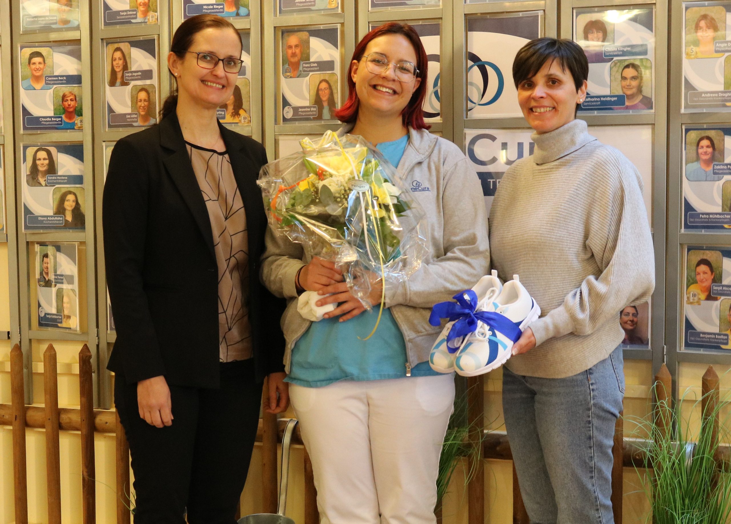 Pflegedienstleitung Andrea Ziegerhofer und Hausleitung Kerstin Pöltl sind sehr stolz auf sie und überreichten einen Blumenstrauß und SeneCura Trofaiach Schuhe.