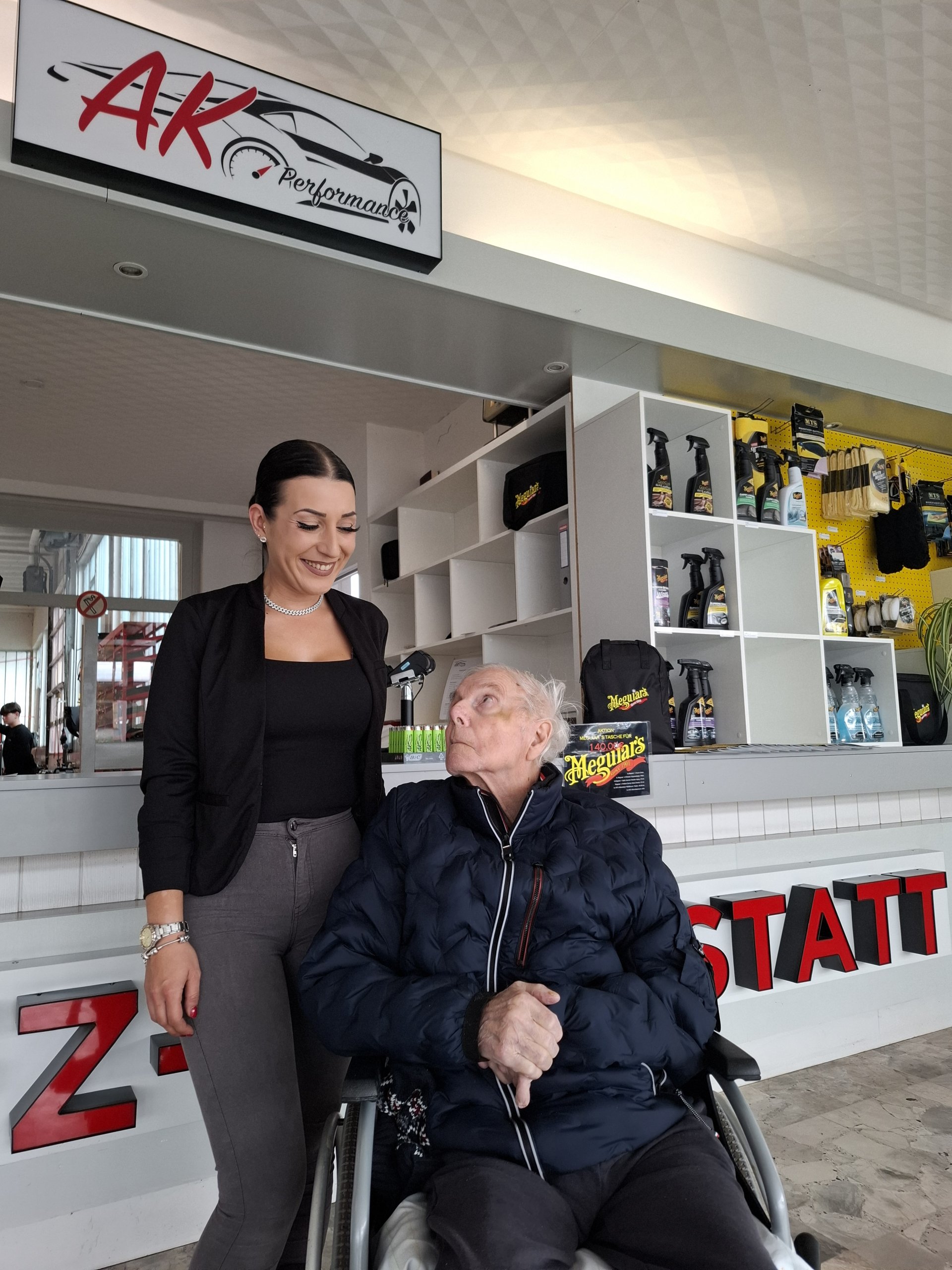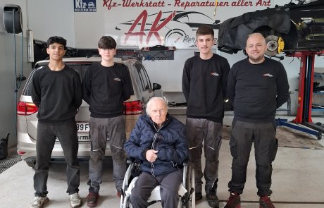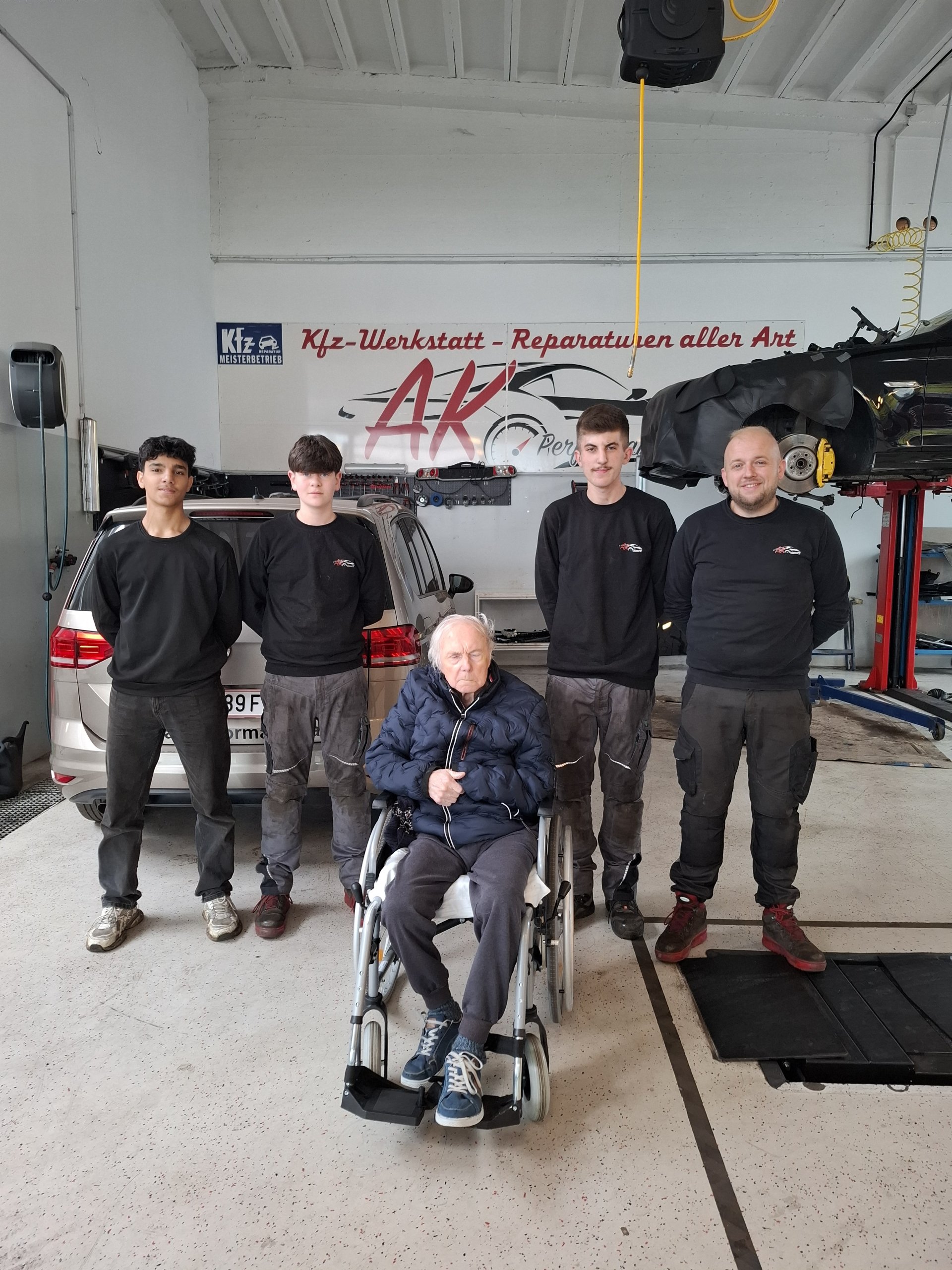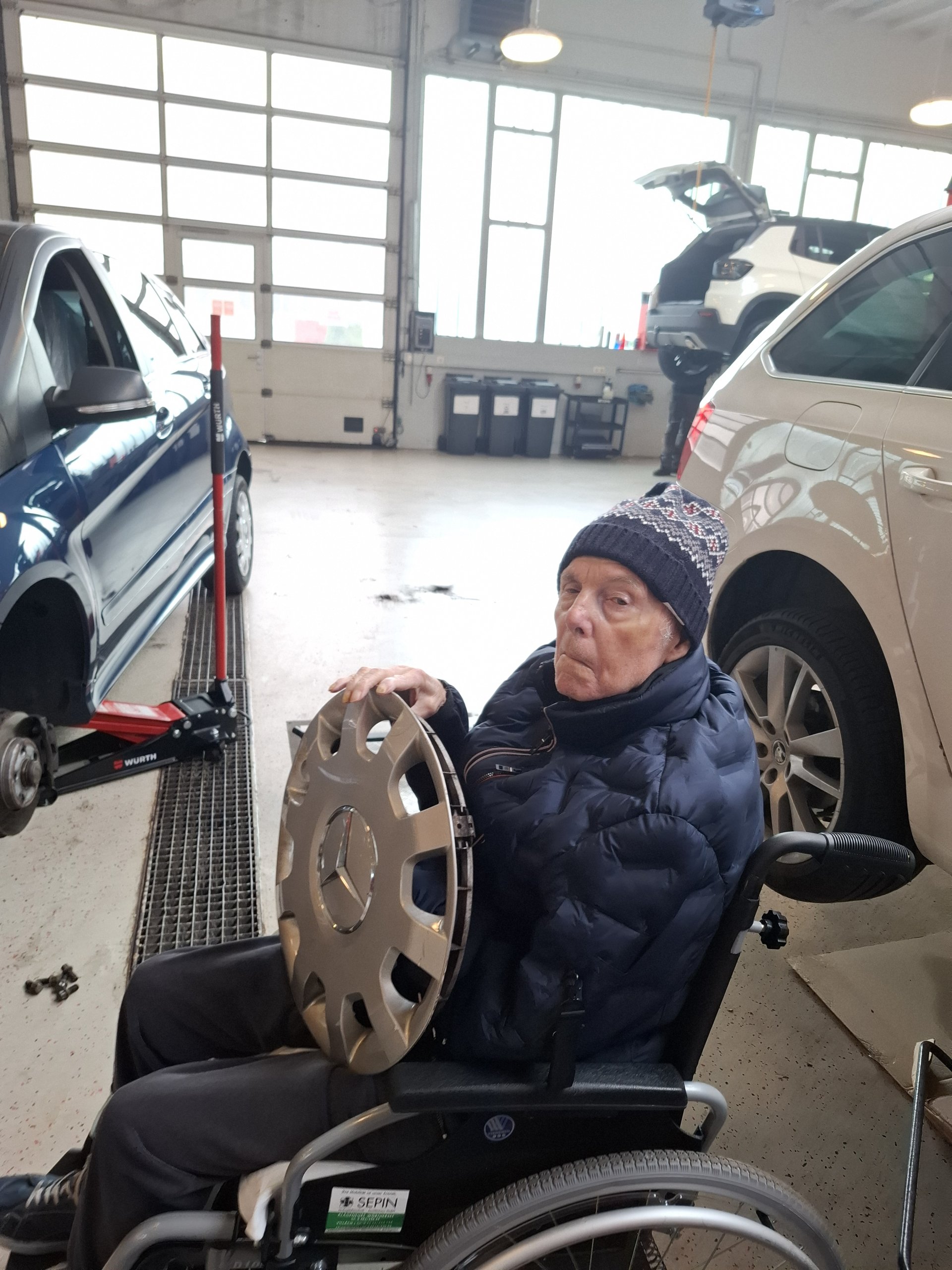 Hr. Höher war am Tag der Wunscherfüllung sehr aufgeregt und voller Erwartungen. Gemeinsam machte man sich auf den Weg zur Werkstatt, wo der Senior von einer sehr netten Dame in Empfang genommen wurde. Der Chef sowie alle anwesenden Mittarbeiter haben Hrn. Höher eine schöne Zeit bereitet. Es wurde an Reifen geschraubt und montiert. Diese Arbeitsschritte wurden genauestens von Hrn. Höher beobachtet und kommentiert – auch er konnte einen Beitrag in Form von Reifenfelgen reichen, leisten. Er schaute sich die Architektur der Halle sowie die Autos und das Inventar genau an. Nachdem alles besichtig wurde, ging der Besuch zu Ende und wir wurden herzlich verabschiedet.