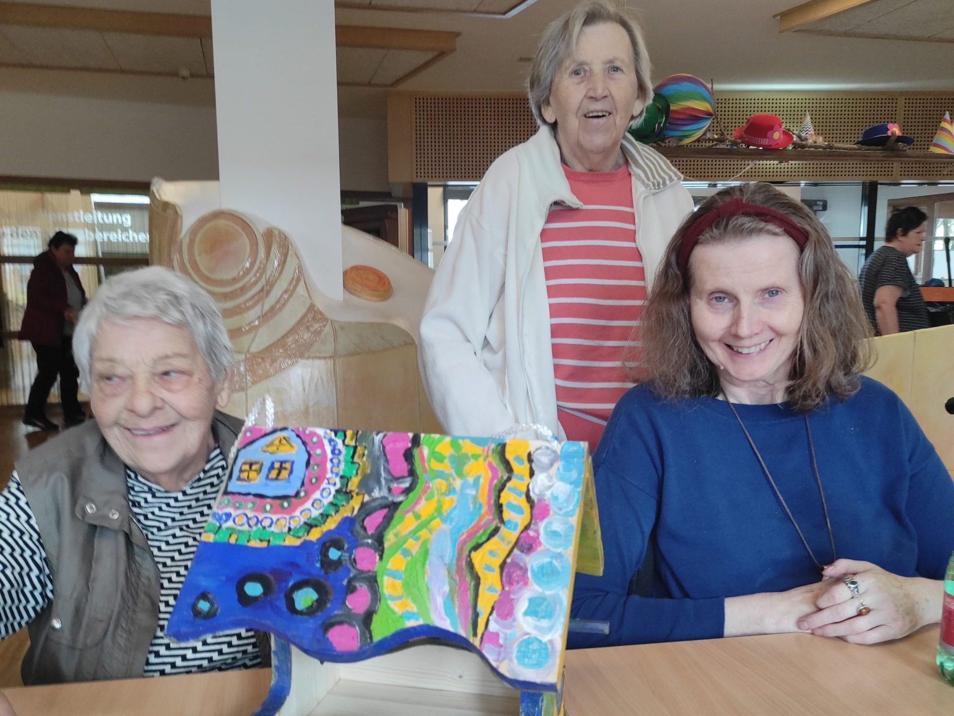Der zweite Platz ging an das SeneCura Sozialzentrum Laurentius-Park Bludenz. Unter dem Titel „Zwitscher Stüble“ entstand ein liebevoll gestaltetes Vogelhaus, das die alpine Umgebung rund um Bludenz widerspiegelt. Beim Schleifen der Holzbauteile kamen die Bewohner Franz Malin, Günther Lindenbauer und Emil Wassle ordentlich ins Schwitzen, bevor die kreative Damenrunde mit den Bewohnerinnen Rosa Sahler, Anneliese Grafl und Maria Pichler zum Pinsel griff. Auf dem Dach sind nun die Berge zu sehen – mit etwas Glück erkennt man sogar den Muttersberg. Bäume an den Seiten symbolisieren Schutz und Geborgenheit.