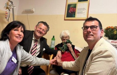 Am 30.3.2025 feierte Ernestine Stangl, Bewohnerin des SeneCura Waldhaus, ihren 100. Geburtstag. Neben einer kleinen Familienfeier an ihrem Ehrentag gratulierte auch Klagenfurts Bürgermeister Christian Scheider. Als Liebhaberin von Kuscheltieren war Frau Stangl sichtlich gerührt vom Plüsch-Lindwurm, der unter anderem vom Bürgermeister überreicht wurde. Auch Pflegedienstleitung Claudia Messner und Hausleitung Thomas Wadl gratulierten natürlich mit den Mitarbeiter:innen des Hauses. Ein Schluck zum Geburtstag und eine von den Mitarbeitern des SeneCura Waldhaus gebackenen Geburtstagstorte durften dabei auch nicht fehlen.