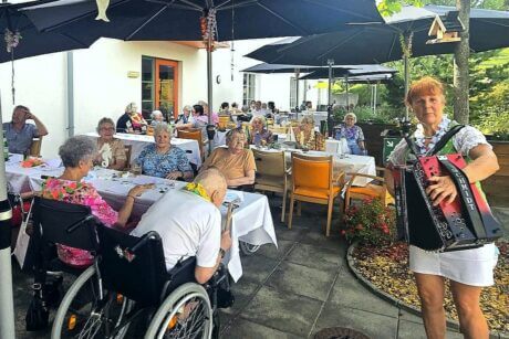 Im Laufe des Nachmittags entwickelten sich die musikalischen Darbietungen von Ingrid Zöhrer zu einem wahren Publikumsmagneten. Bewohner:innen und Mitarbeitende stimmten gemeinsam in bekannte Melodien ein und musizierten zusammen. Der Garten des Sozialzentrum Gratkorn verwandelte sich in eine lebendige Bühne, auf der freudige Tanzeinlagen und fröhliches Mitsingen das Bild prägten. Die bereitgestellte Fotoecke mit lustigen Accessoires und ein Planschbecken zum Abkühlen boten zusätzliche Unterhaltung für Jung und Alt. Abgerundet wurde das Sommerfest durch einen mobilen Eiswaagen der Konditorei Handl, die mit ihren regionalen Eisspezialitäten für ein weiteres kulinarisches Highlight sorgte.