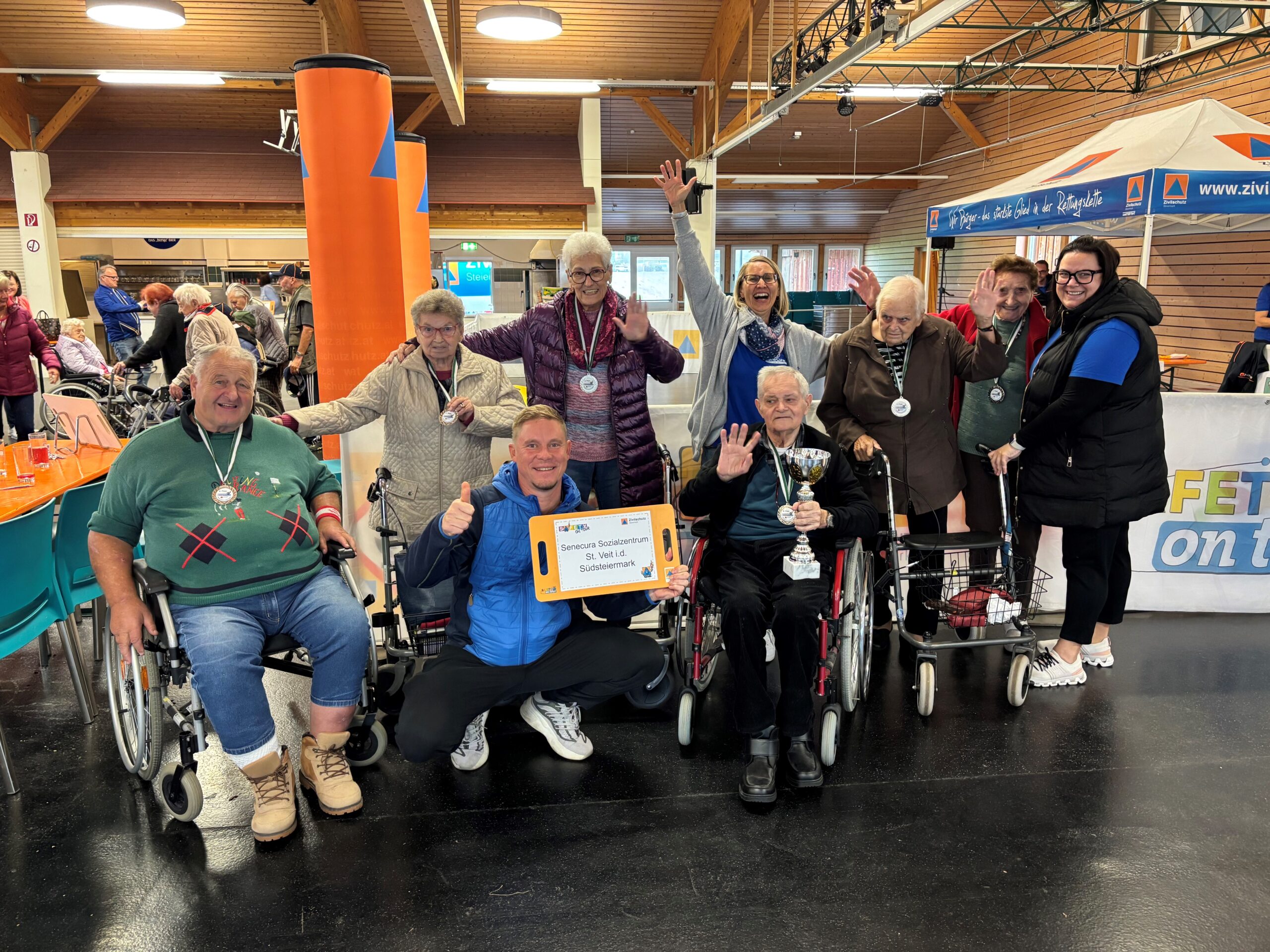 Letztens fand in Kainbach bei Graz die Seniorenolympiade statt und das SeneCura Sozialzentrum St. Veit in der Südsteiermark nahm voller Engagement teil. In Begleitung von den Mitarbeiter:innen Rauch Claudia, Horvat Silvija und Majhenic Sebastian machten sich die Bewohner:innen auf den Weg nach Kainach. Dort angekommen mussten sich die Teilnehmer:innen einigen Herausforderungen stellen, bei denen jeweils einige Punkte gesammelt werden konnten. Der Ehrgeiz hat sich gelohnt, denn den Bewohner:innen von St. Veit, Kolleritsch Herbert, Weber Josefa, Schauperl Maria, Fischer Anna, Kindlhofer Josef und Neubauer Erna, ist es gelungen, den hervorragenden zweiten Platz zu ergattern. Die Seniorinnen und Senioren sowie die begleitenden Mitarbeiter:innen freuten sich sehr über ihre Leistungen und kehrten voller Stolz zurück ins Sozialzentrum.