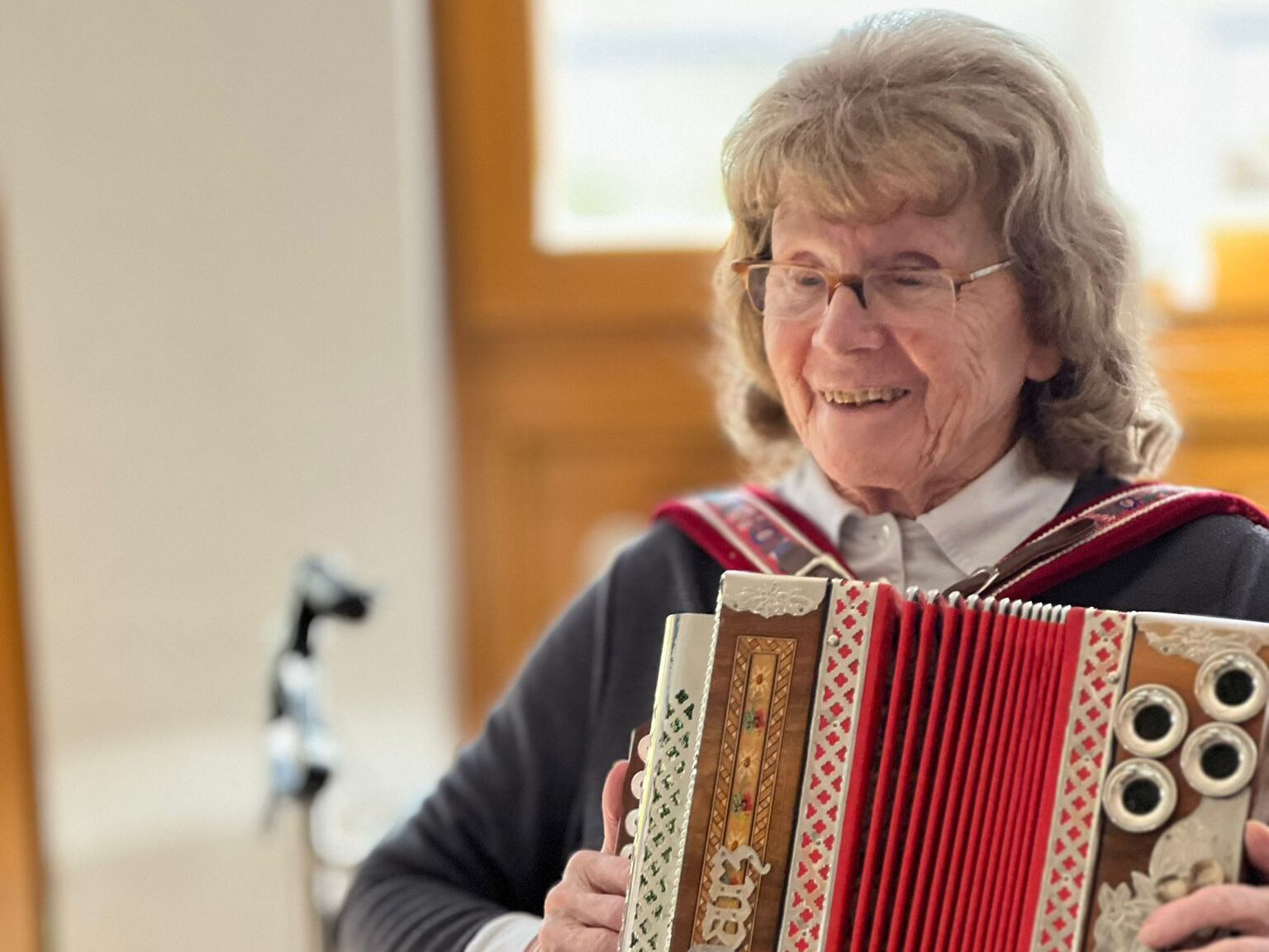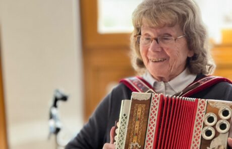 Frau Ladenhauf, Bewohnerin im SeneCura Sozialzentrum Feldbach, hat erst im Alter von 60 Jahren damit begonnen, das Spielen mit der steirischen Harmonika zu erlernen und mittlerweile ist sie bald 90 Jahre! Nachdem sie jetzt viele Jahre nicht gespielt hat, hat die Tochter die Harmonika ins Haus gebracht und Frau Ladenhauf hat am Wochenende gleich damit begonnen – im Speisesaal den anderen Bewohner:innen vorzuspielen. Es waren alle überaus begeistert und freuen sich auf musikalische Momente mit Frau Ladenhauf!