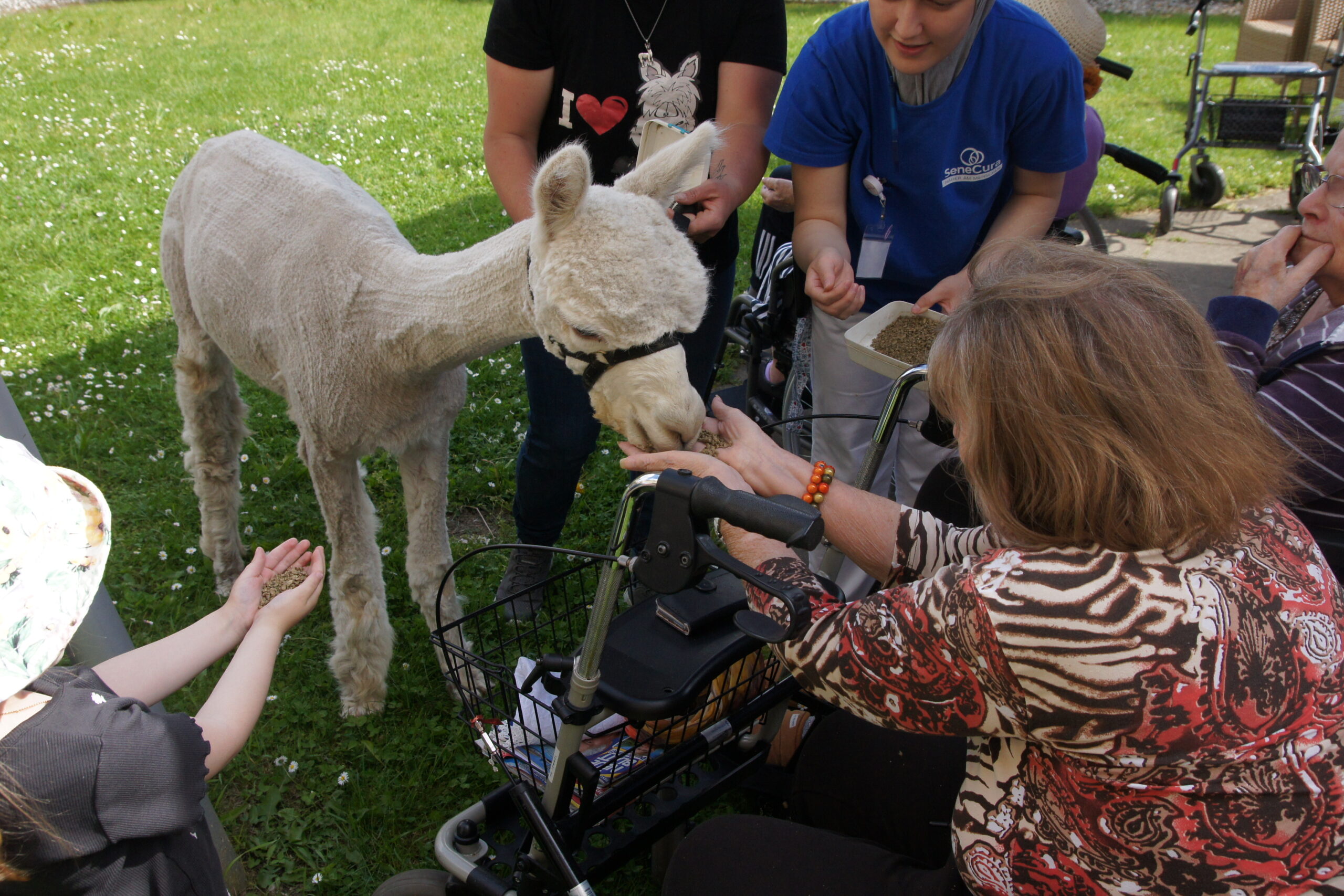 Vor kurzem durften sich die Bewohner:innen des SeneCura Pflegezentrums Graz in der Peter-Rosegger-Straße über flauschigen Besuch freuen. Im Garten war das Staunen groß, als zwei liebevolle und flauschige Alpakas sowie ein Lama vor kurzem ihren großen Auftritt hatten. Die Alpakas und Lamas vom grünen See machten sich nämlich auf den Weg, um den Seniorinnen und Senioren eine tierische Freude zu bereiten. Bei strahlendem Sonnenschein fanden sich zwei Alpakas und ein Lama im Gartenareal des Hauses ein. Dann stand Streichel-, Futter- und Kuschelzeit mit den Vierbeinern am Programm. Neugierig und begeistert tasteten sich die Bewohner:innen an die weichen Tiere heran und es dauerte nicht lange, da streichelten sie die flauschigen Freunde schon. Auch bei der Fütterung durften die Seniorinnen und Senioren tatkräftig unterstützen. Viele Bewohner:innen sahen an diesem Tag zum ersten Mal ein Alpaka, doch auch für alle Alpakakenner:innen war der Besuch eine tolle Überraschung, die zu einem unvergesslichen Erlebnis wurde.