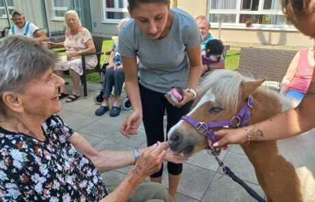 Vor kurzem sorgte ein besonderer Gast im SeneCura Sozialzentrum Stainz für strahlende Gesichter: Pony Britt, begleitet von Reitpädagogin und -therapeutin Lisa Rexeis, besuchte das Haus. Die Senior:innen genossen den Kontakt mit dem Pony, was viele schöne Erinnerungen weckte und für viel Freude sorgte. Der Besuch zeigte einmal mehr, wie wertvoll tiergestützte Aktivitäten im Pflegealltag sind.