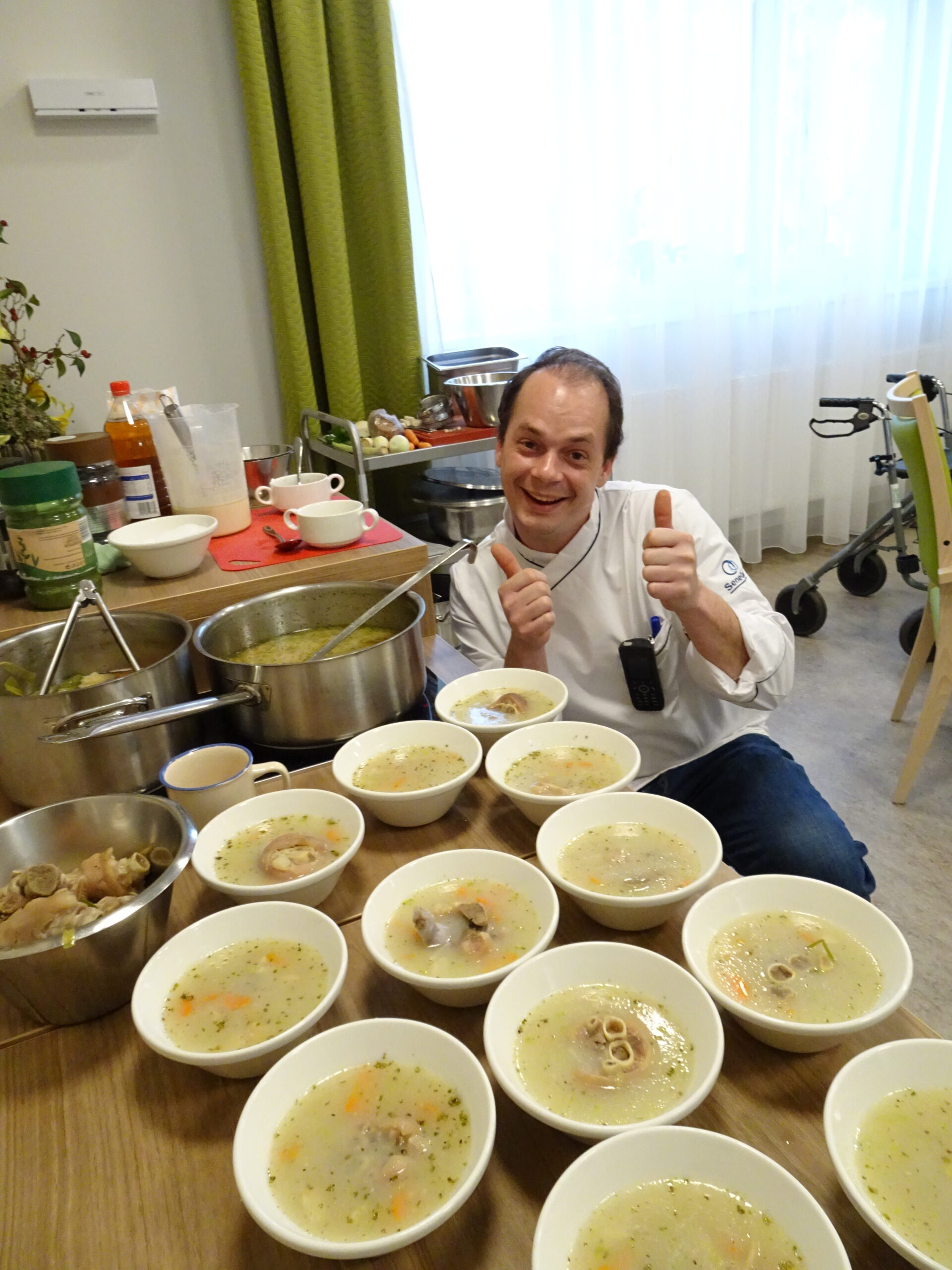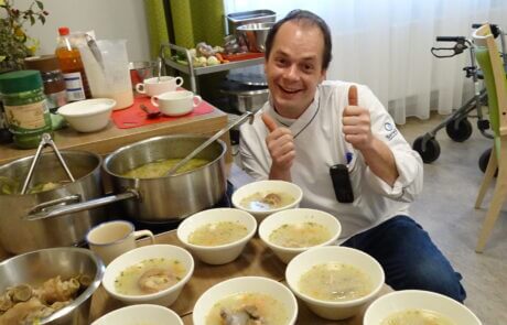 Ein weiteres Großevent im SeneCura Pflegezentrum Schwarzau war das Kochen mit dem Küchenleiter Herr Hiden. Gemeinsam mit den Bewohner:innen hat Herr Hiden den steirischen Klassiker „Klachlsuppe“ zubereitet. Das Kochen der Suppe wurde zu einem echten Gemeinschaftserlebnis und erfreute im Anschluss die Gaumen der Bewohner:innen sowie Mitarbeiter:innen. Die Seniorinnen und Senioren freuen sich bereits auf den nächsten Kochkurs mit Küchenleiter Herr Hiden.