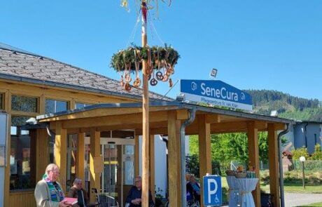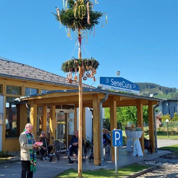 Wie jedes Jahr, stand auch heuer wieder das traditionelle Maibaum-Aufstellen im SeneCura Pflegezentrum St.Veit/Glan am Programm. Am 30. April 2024 wurde der von den Mitarbeiter:innen organisierte und gemeinsam mit den Bewohner:innen festlich geschmückte Maibaum bei strahlendem Sonnenschein aufgestellt. Der Baum wurde von Pfarrer Johann Fercher festlich gesegnet und schmückt jetzt den Eingangsbereich unseres Pflegezentrums.