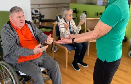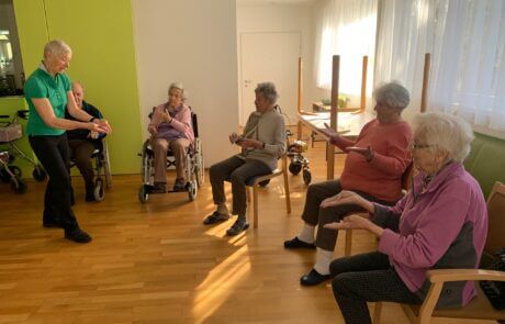 Die Bewohner:innen nehmen fleißig bei der Sitzgymnastik teil.