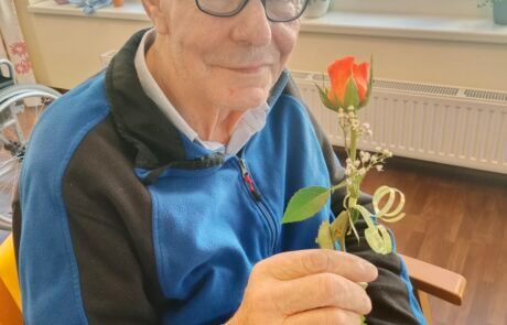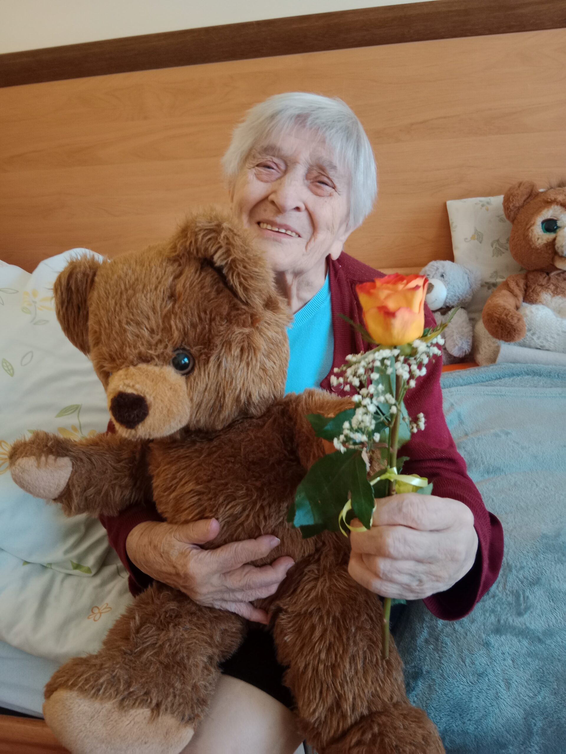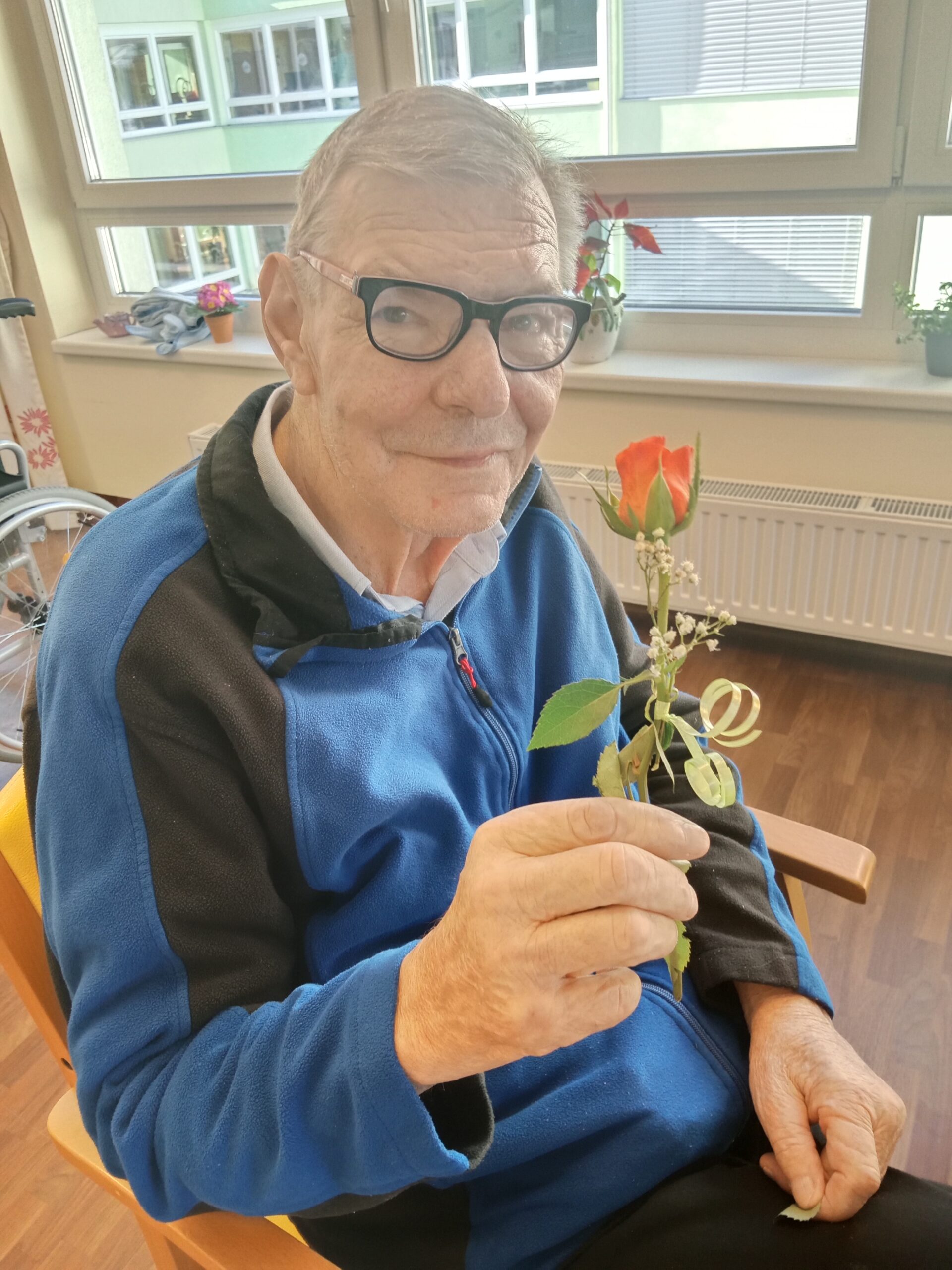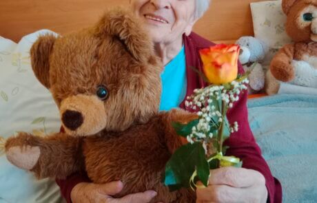 Das strahlende Lächeln der Bewohnerin zeigt die Freude über den Blumengruß.