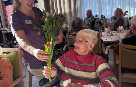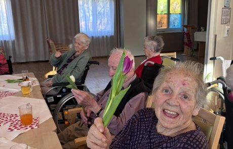 Natürlich durfte für jede:n eine liebevoll überreichte Blume nicht fehlen. Die Freude war groß, viele unserer Bewohner:innen waren sichtlich gerührt.
