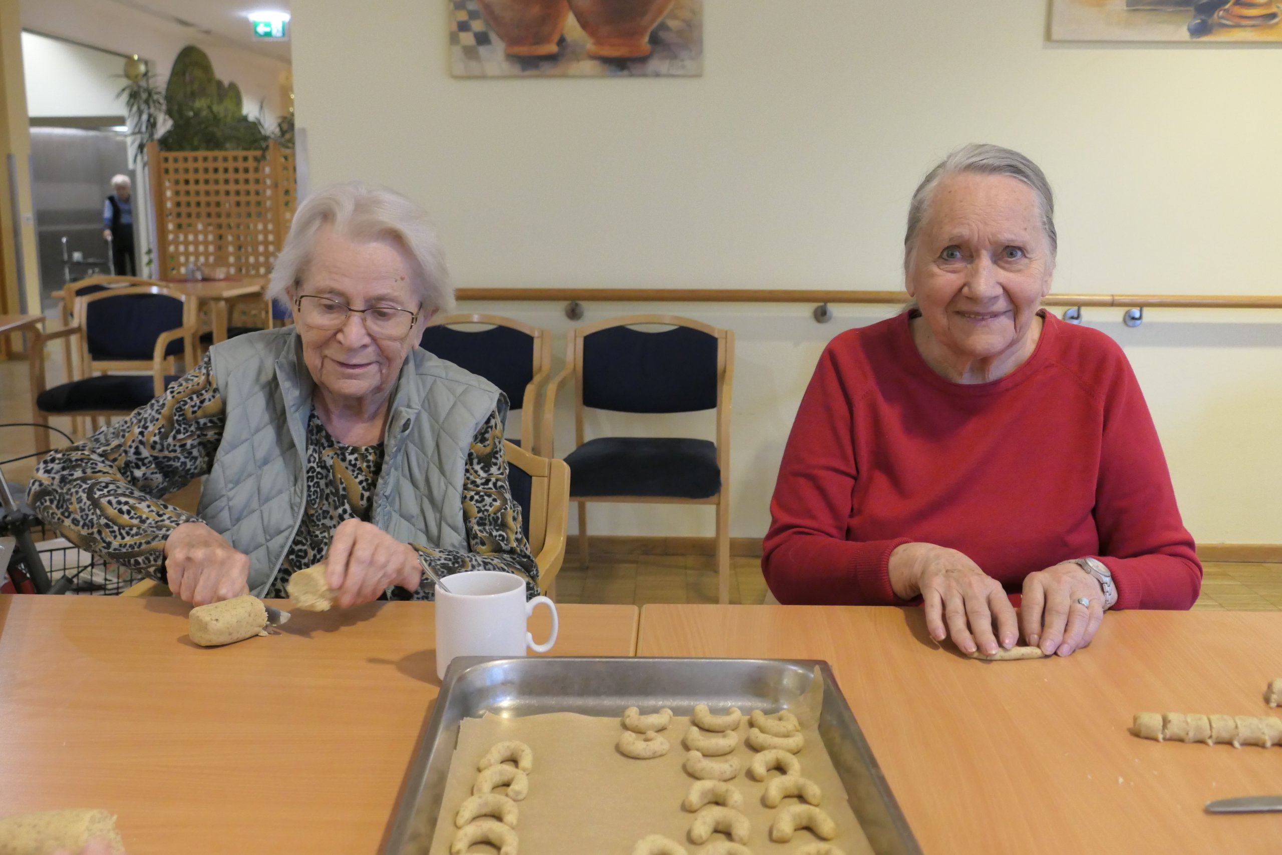 Bei dem Vorschlag Vanillekipferl zu backen, fanden sich sofort eifrige Bewohner:innen und ehrenamtliche Mitarbeiterinnen des SeneCura Sozialzentrums Purkersdorf zusammen. Insgesamt zwei kg Teig waren im Nu gewalkt und in Kipferl geformt. Anschließend ab ins Rohr und beim Herausnehmen verbreitete sich schnell ein herrlicher Duft in den Räumen des Sozialzentrums. Gerüche erinnern uns und führen uns nicht selten in die Vergangenheit. Den weiteren Weihnachtsvorbereitungen steht ab sofort nichts mehr im Wege und die Bewohner:innen freuen sich bereits darauf.