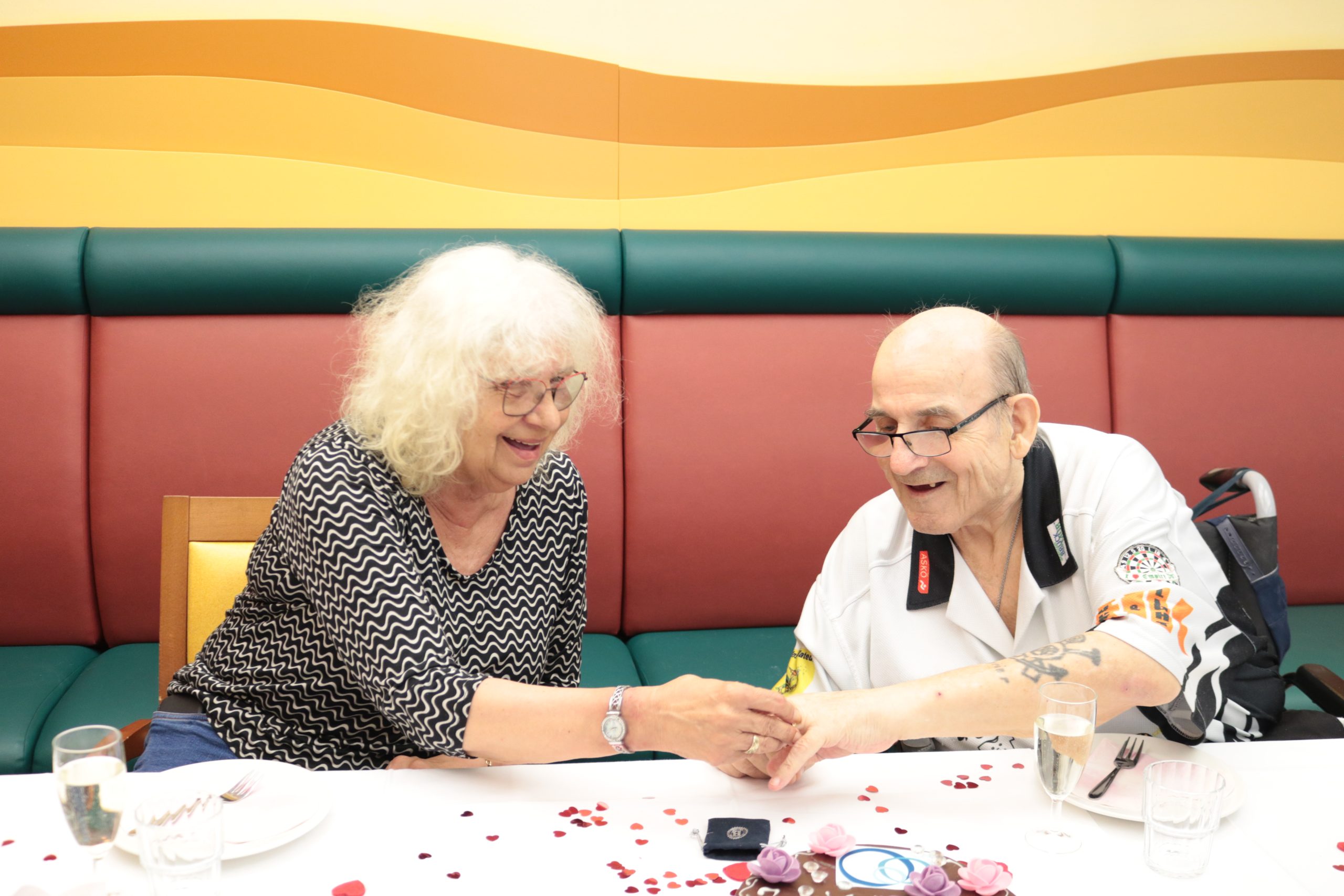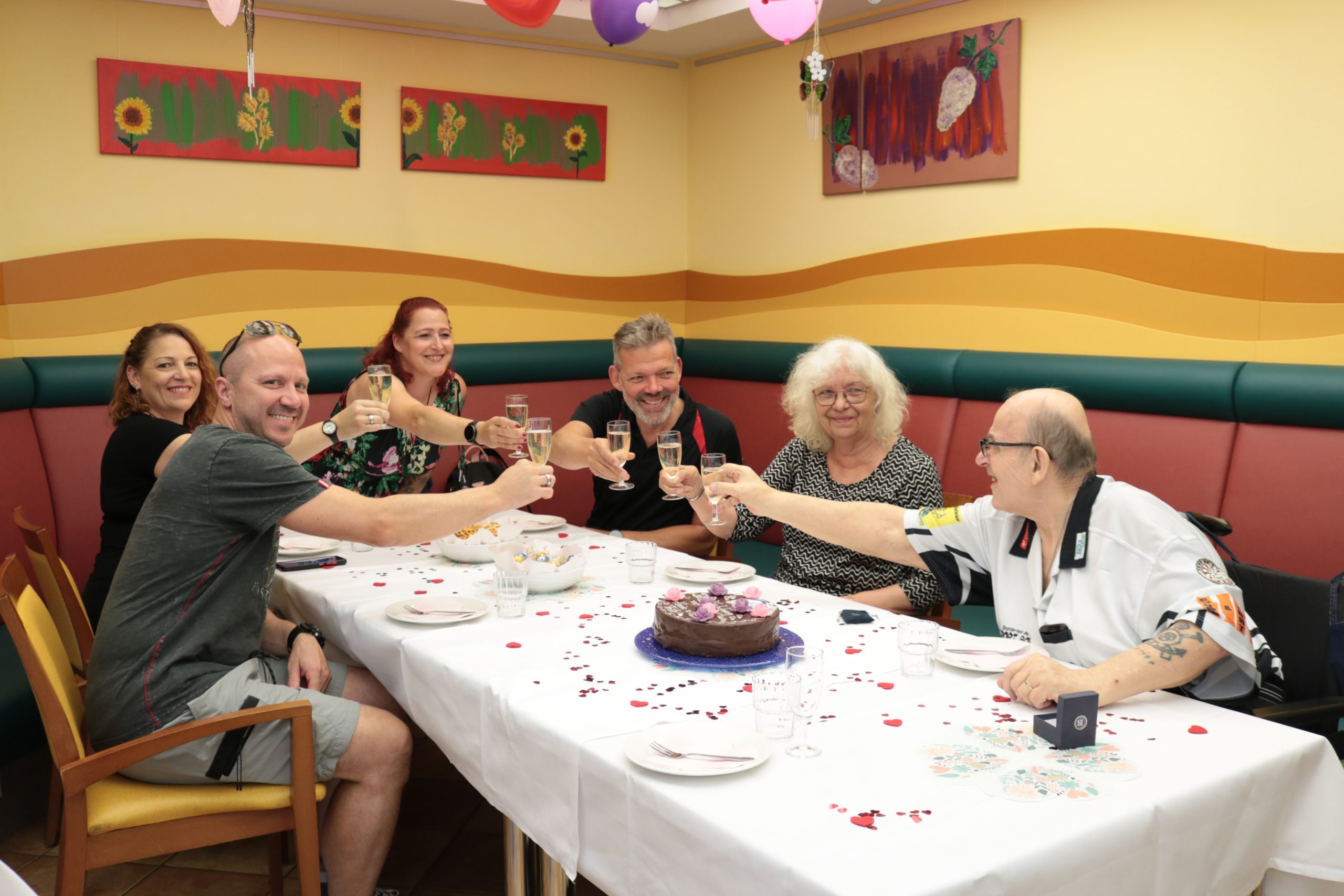 Am Freitag dem 20.06.2025 fand die offizielle Verlobung zwischen Bewohnerin Karin Petek und Bewohner Friedrich Schlieber statt. Das SeneCura Sozialzentrum Trofaiach – Haus Verbena ließ es sich nicht nehmen diese Feier als Herzenswunsch auszurichten. In einer kleinen Runde von Familienangehörigen wurde ausgelassen gefeiert. Eine schön gedeckte Tafel und ein besonders mit Liebe dekorierter Raum stand dem Paar zur Verfügung. Eine Verlobungstorte durfte auch nicht fehlen so wie ein bunter Blumenstrauß. Symbolisch wurden nochmals unter großem Applaus die Ringe angesteckt. Auf das Paar stießen alle mit einem Gläschen Sekt an und ließen sie hochleben. Auch der Küchenchef des Hauses bereitete wunderbare Brötchen zu, die großen Anklang fanden. „Wir wünschen dem Paar alles Gute zur Verlobung. Es ist nie zu spät für die Liebe.“, so Kerstin Pöltl, Hausleitung des SeneCura Sozialzentrums Trofaiach.