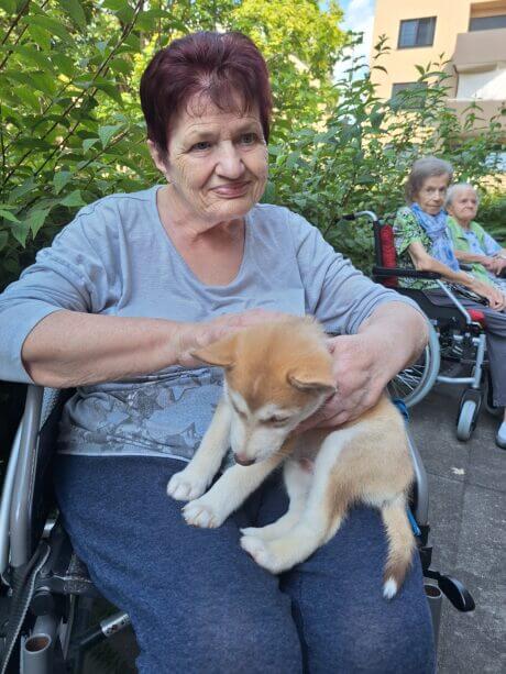 Kürzlich wurden die Bewohner:innen des SeneCura Sozialzentrums Unterpremstätten mit einem besonderen Besuch überrascht. Carmen Pendl brachte ihre erst 5,5 Wochen alten Huskywelpen mit. Die fünf Welpen und die stolze Hundemama Maya sorgten für ordentliches Aufsehen im Haus und bald hatten sich alle Senior:innen und Mitarbeiter:innen im Garten versammelt, um den flauschigen Besuch zu begrüßen. Die Bewohner:innen waren sehr begeistert von den anschmiegsamen Welpen. Gerne wurden sie ausgiebig gestreichelt und gekuschelt. Es war ein schöner Nachmittag mit den Hunden, den alle sehr genossen.